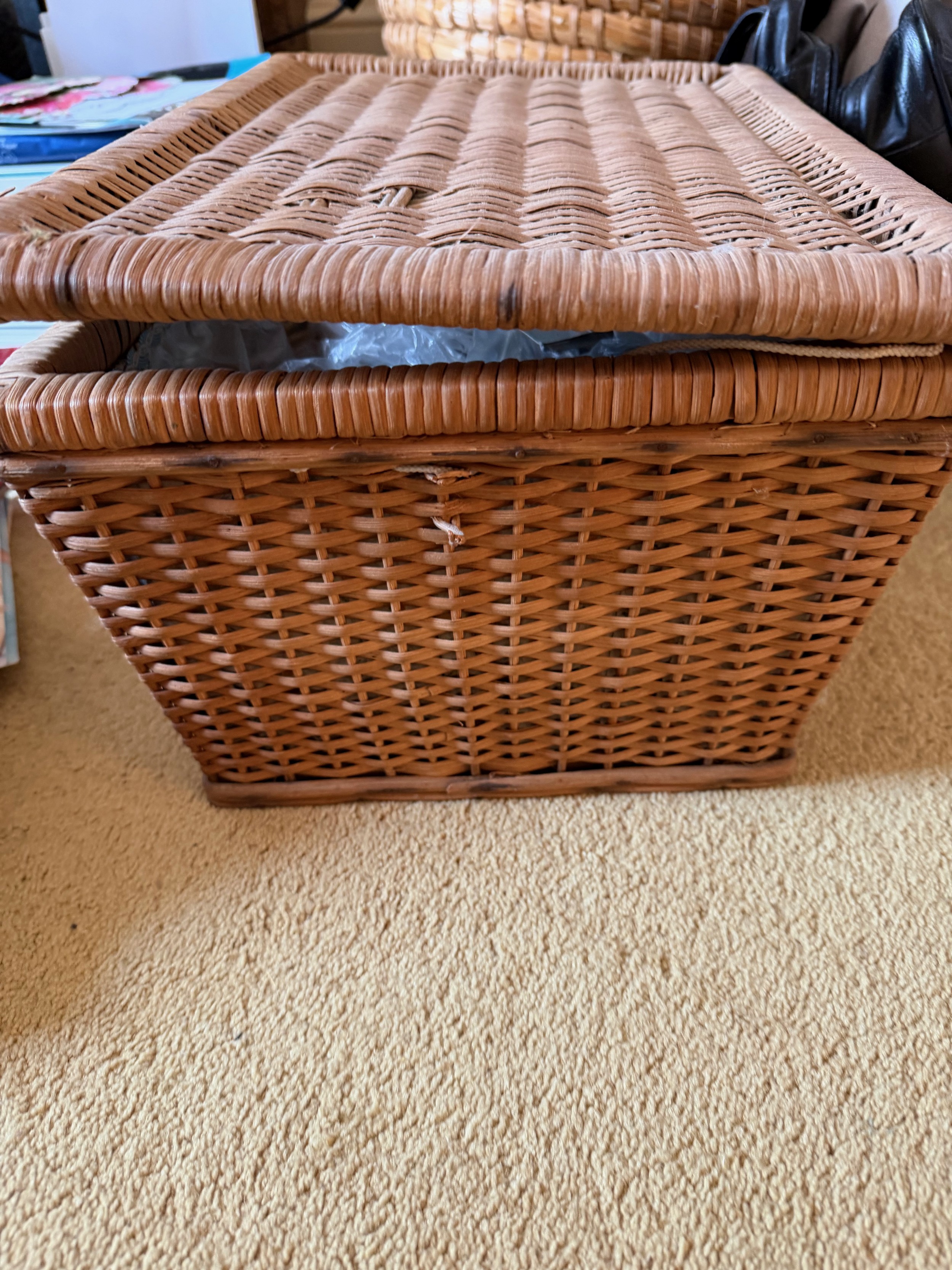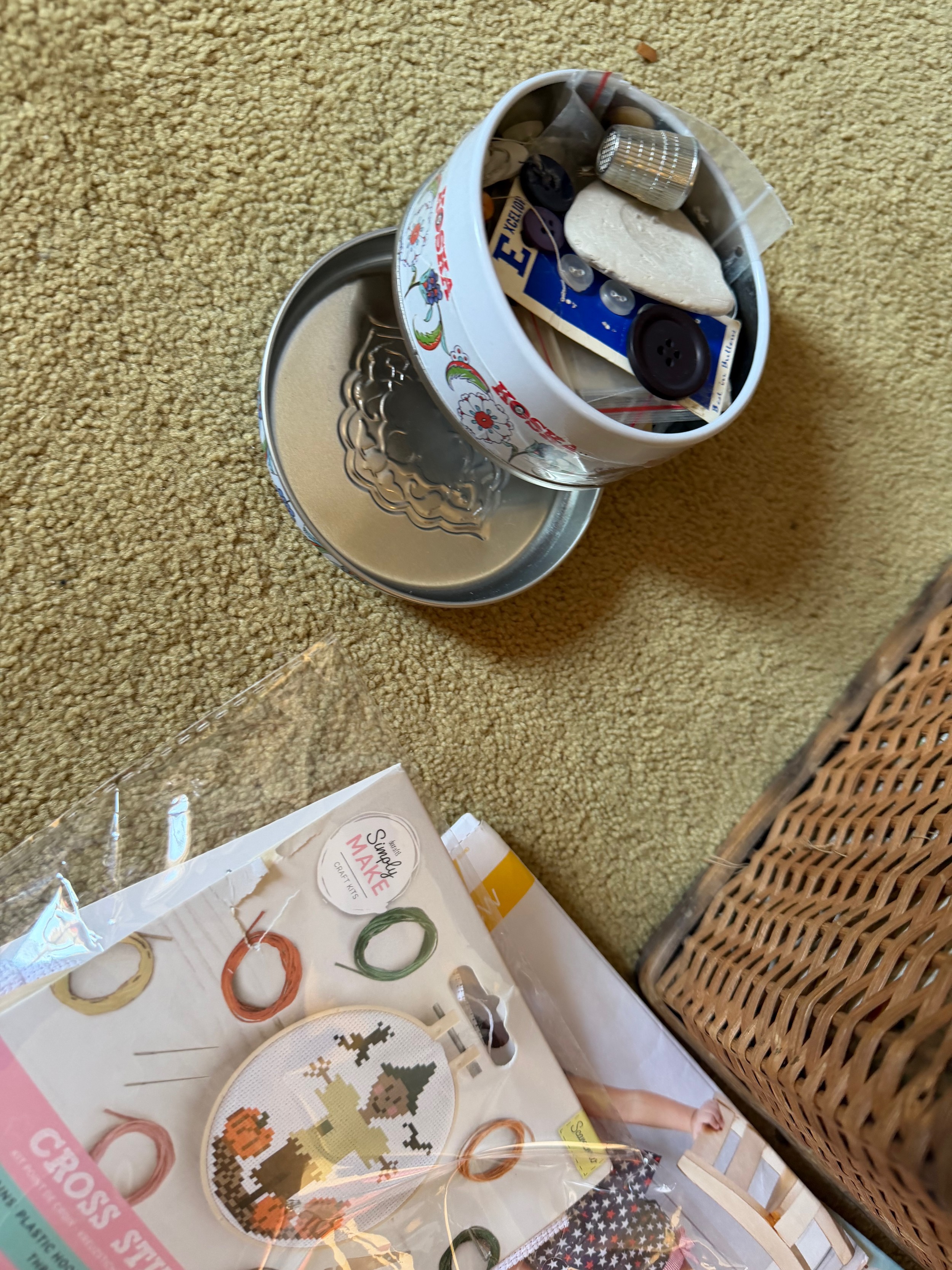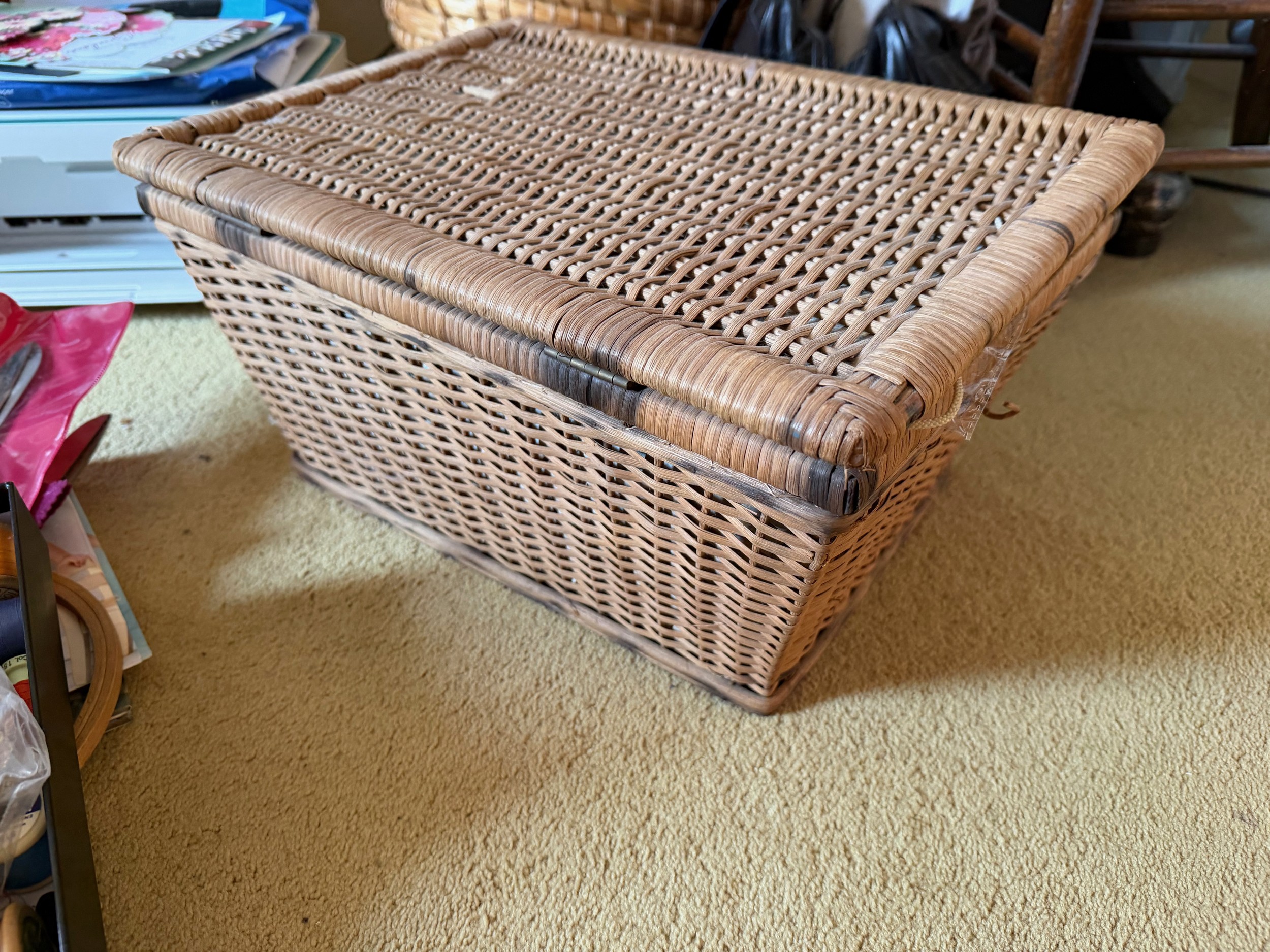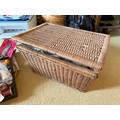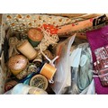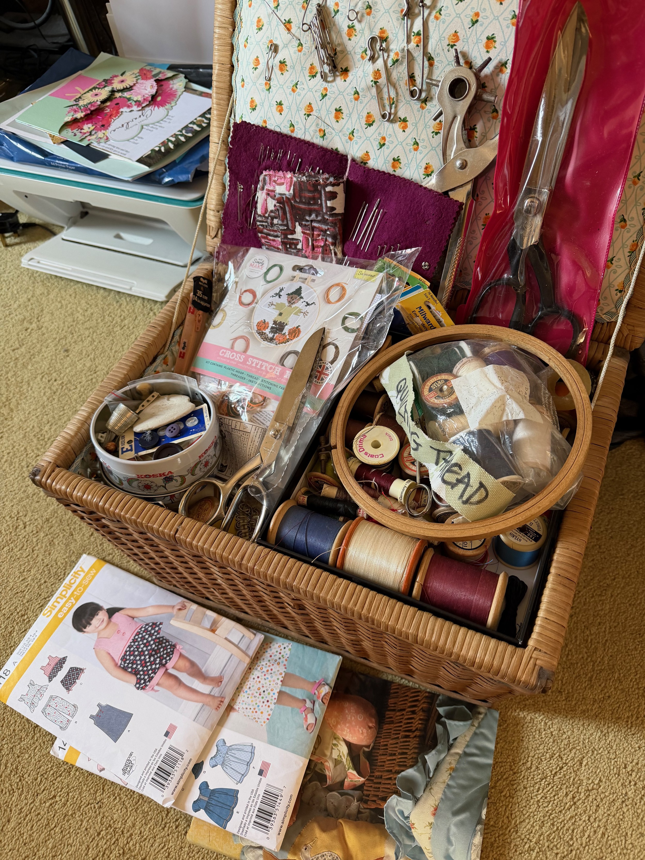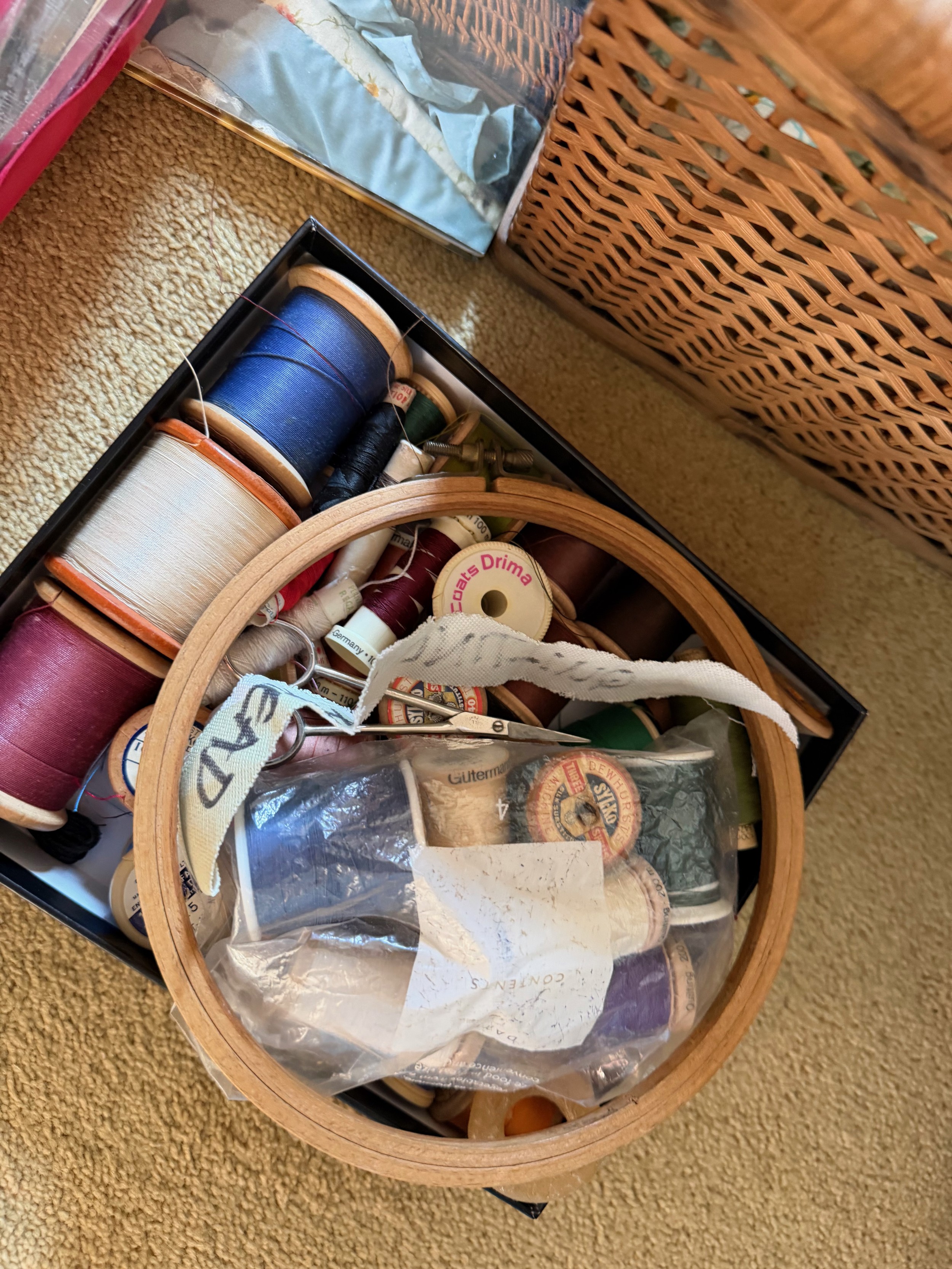 Wicker sewing box and contents, scissors thread etc.This lot is available for in-house shipping