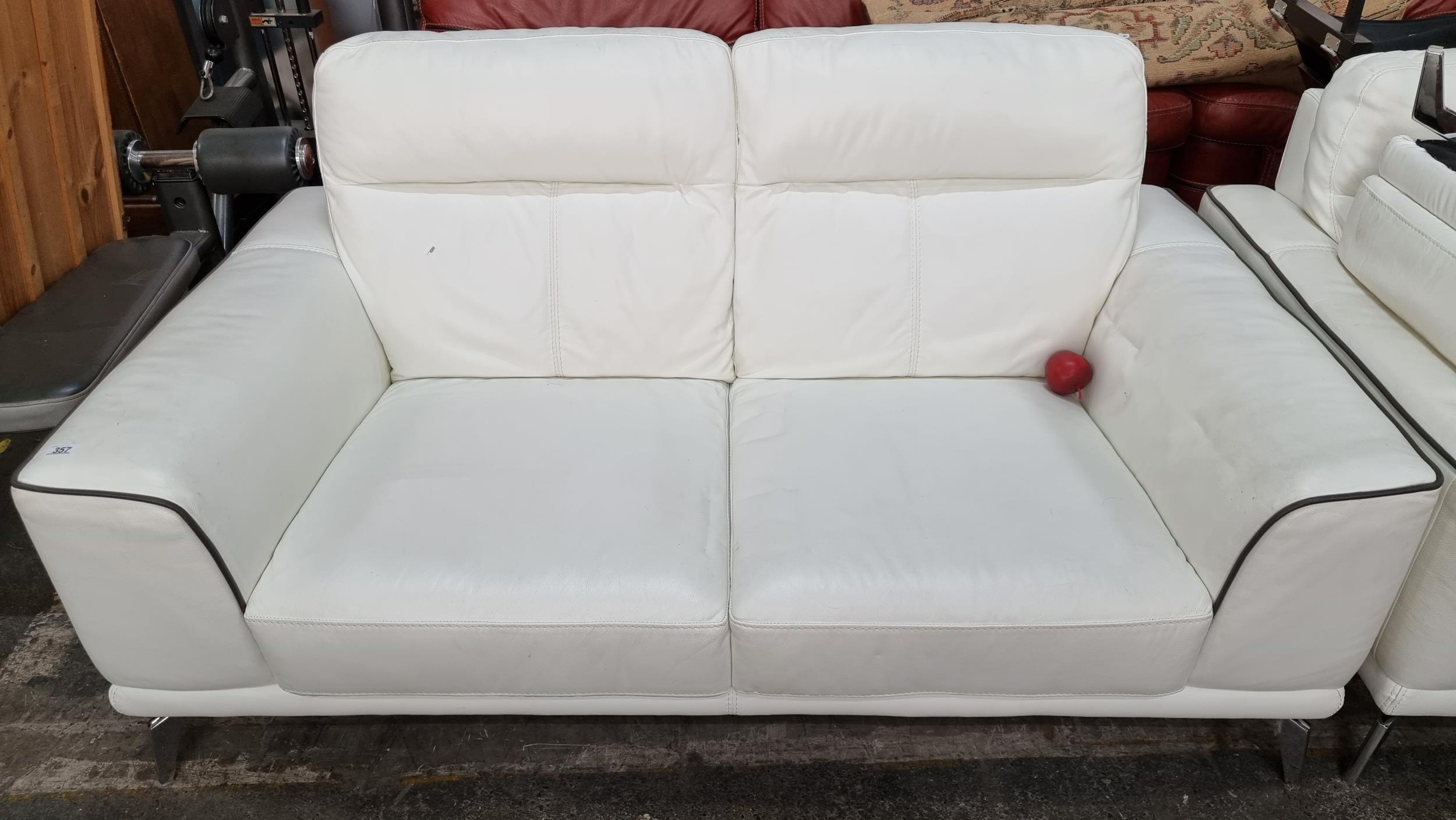 Star lot : A fantastic white Italian leather two-seater sofa. A stylish comfortable example of lounge furniture with a subtle slate grey trim and chrome legs, very expensive to buy new. Matches Lot 356 and 358. From a fabulous house in Wicklow.