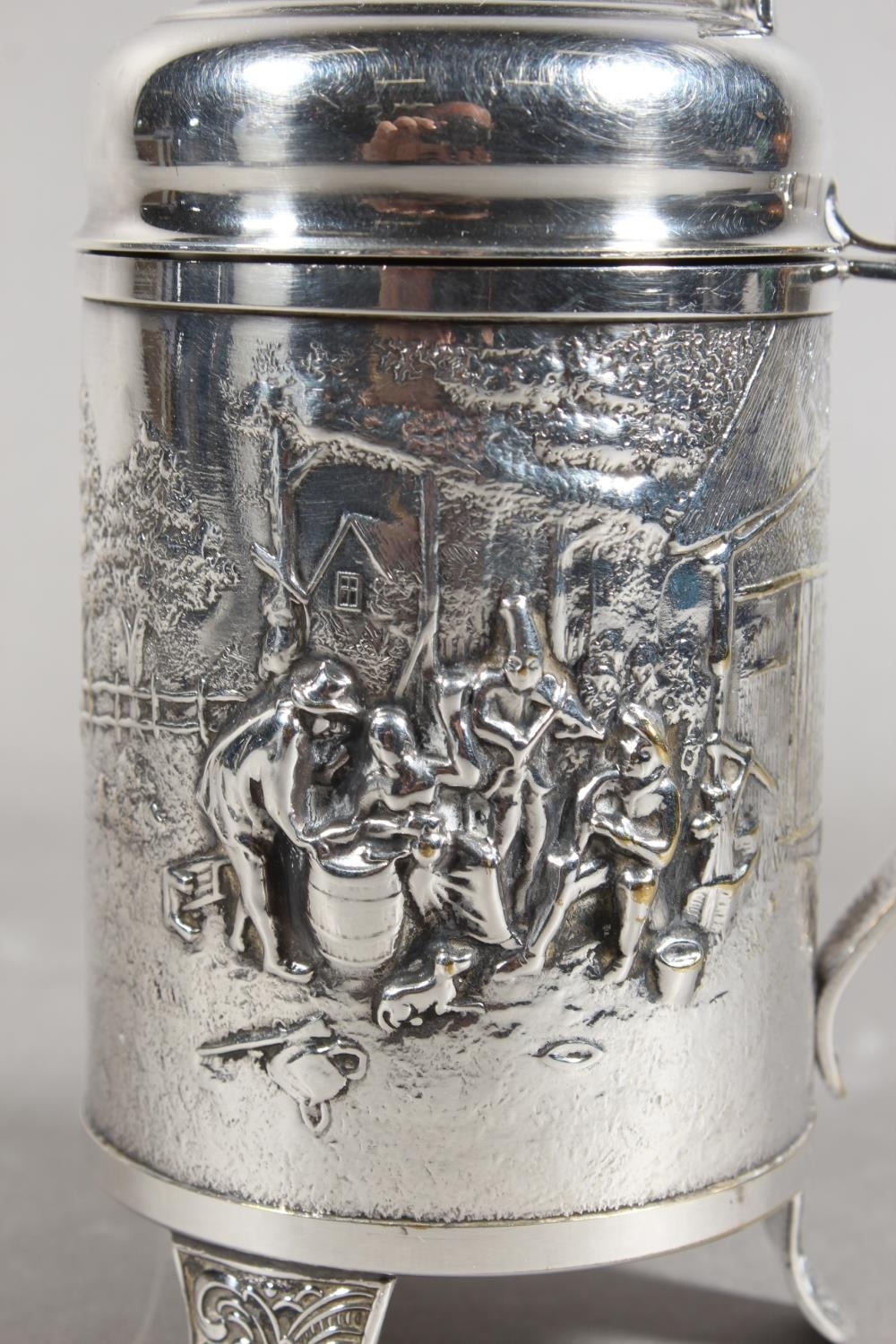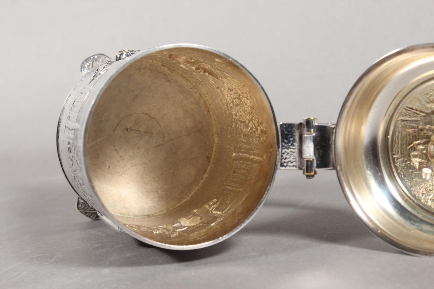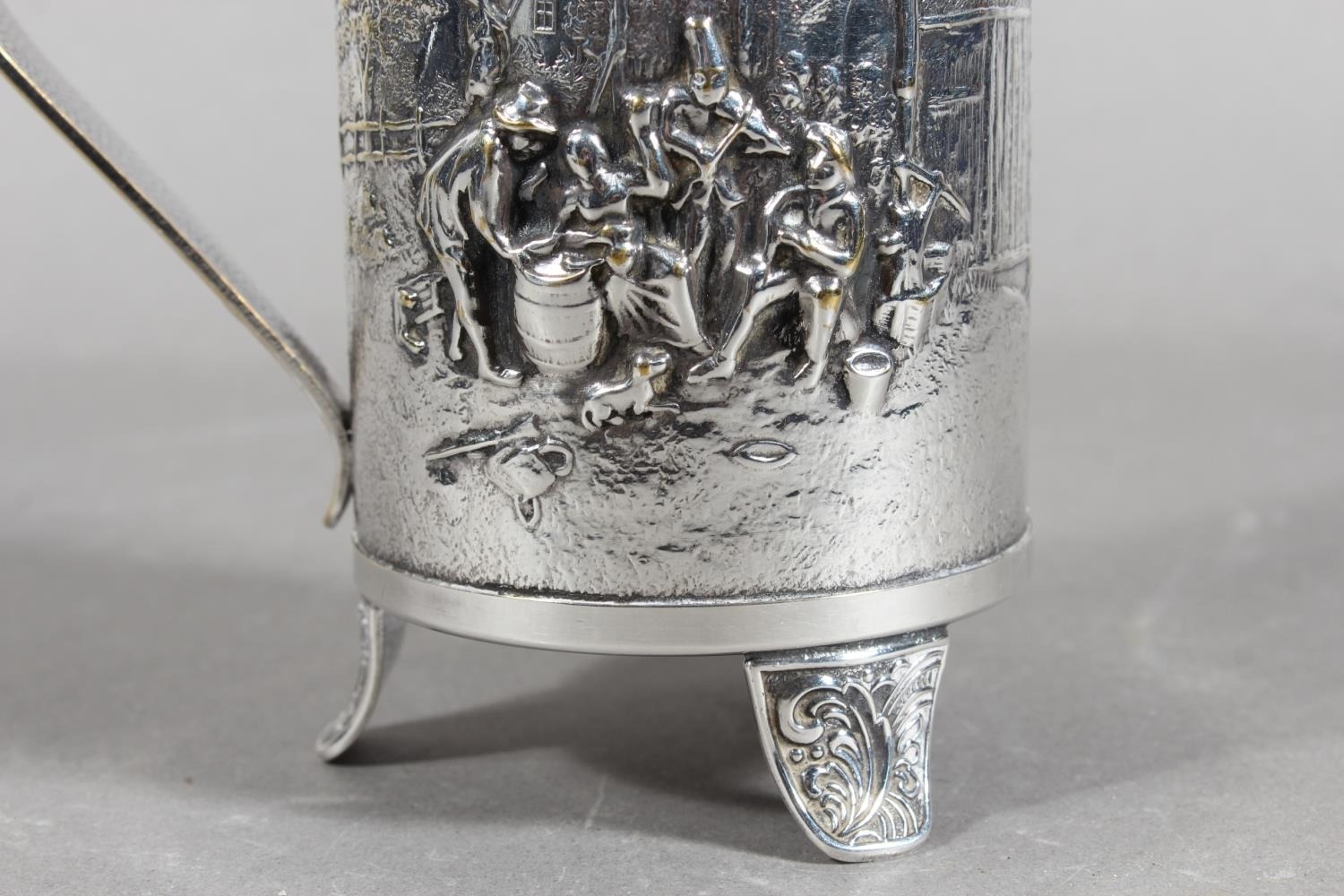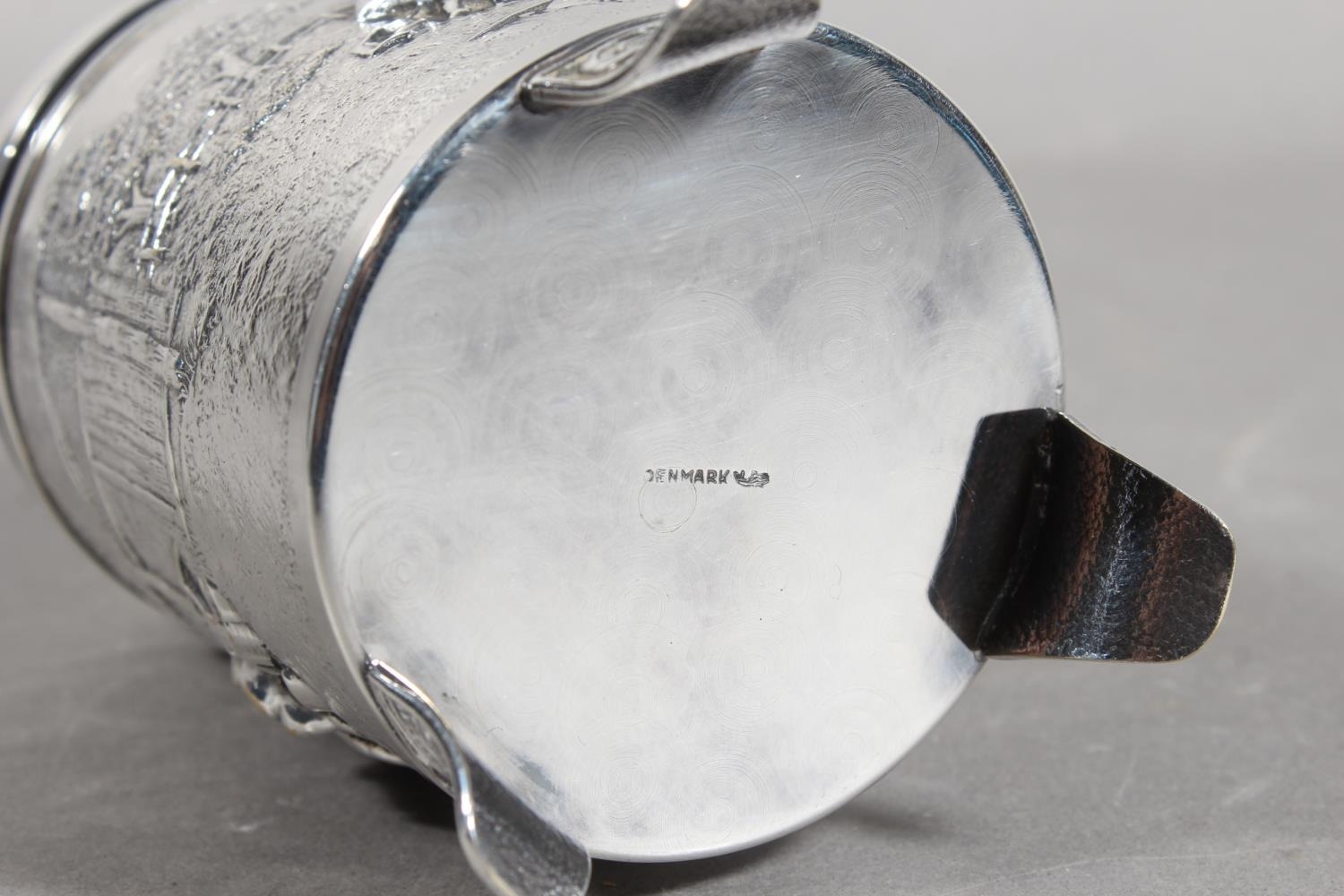Danish white metal lidded stein decorated in repousse with musicians, 14cm high.