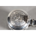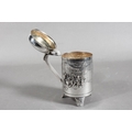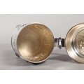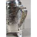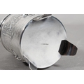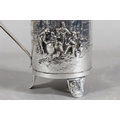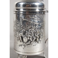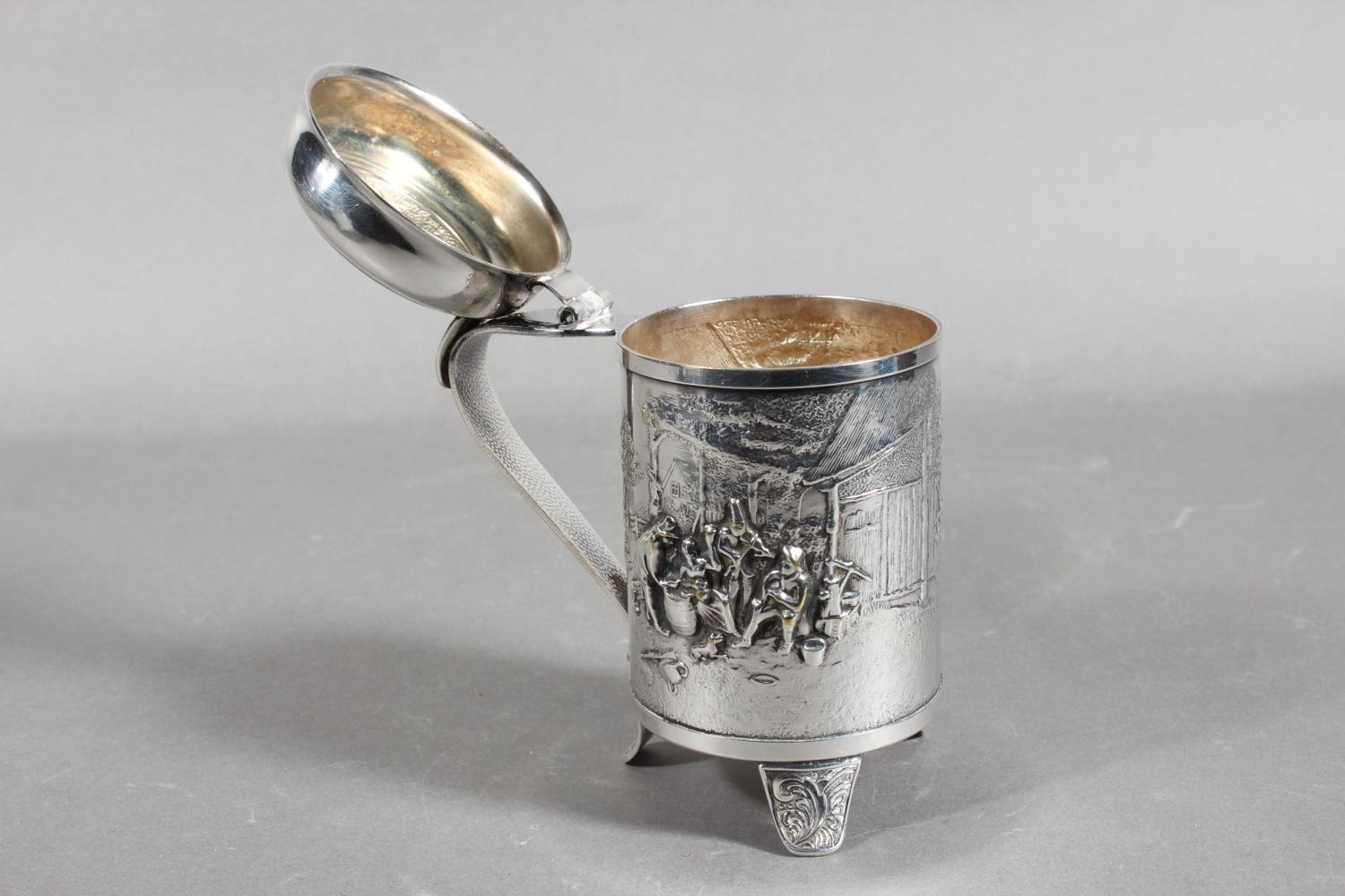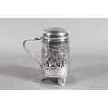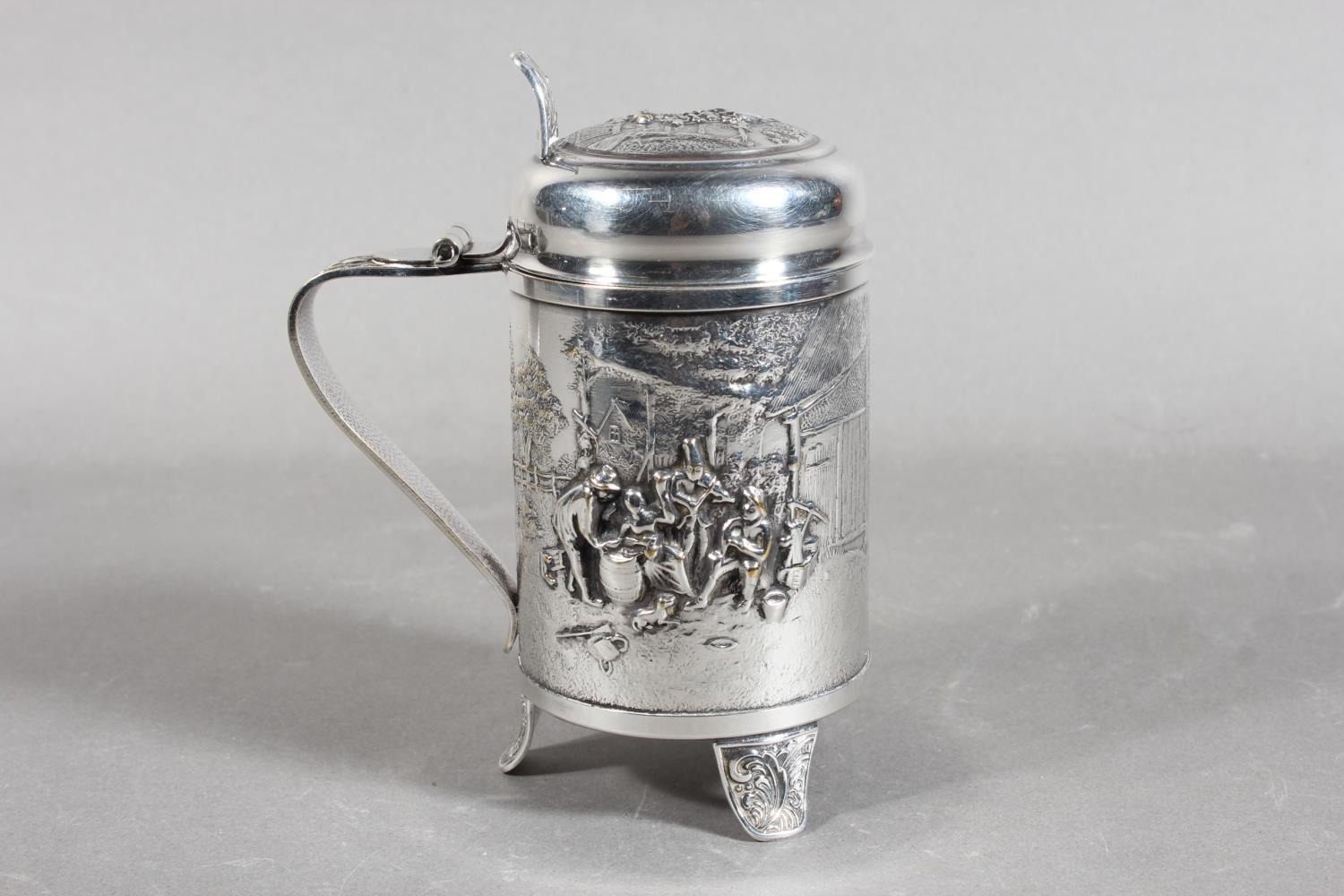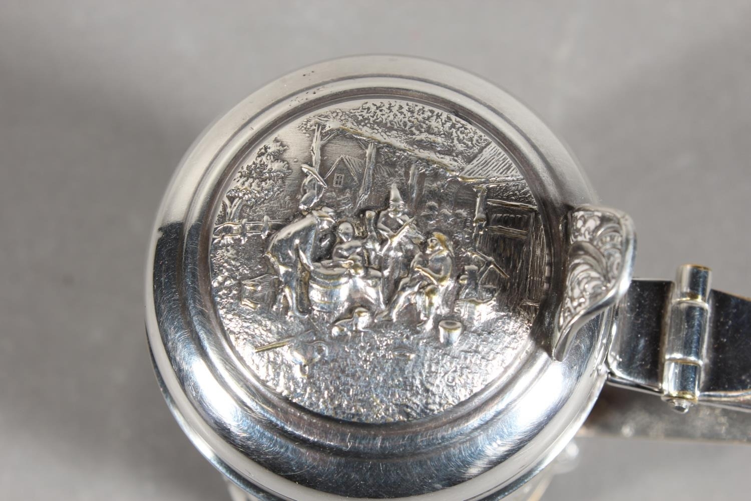 Danish white metal lidded stein decorated in repousse with musicians, 14cm high.