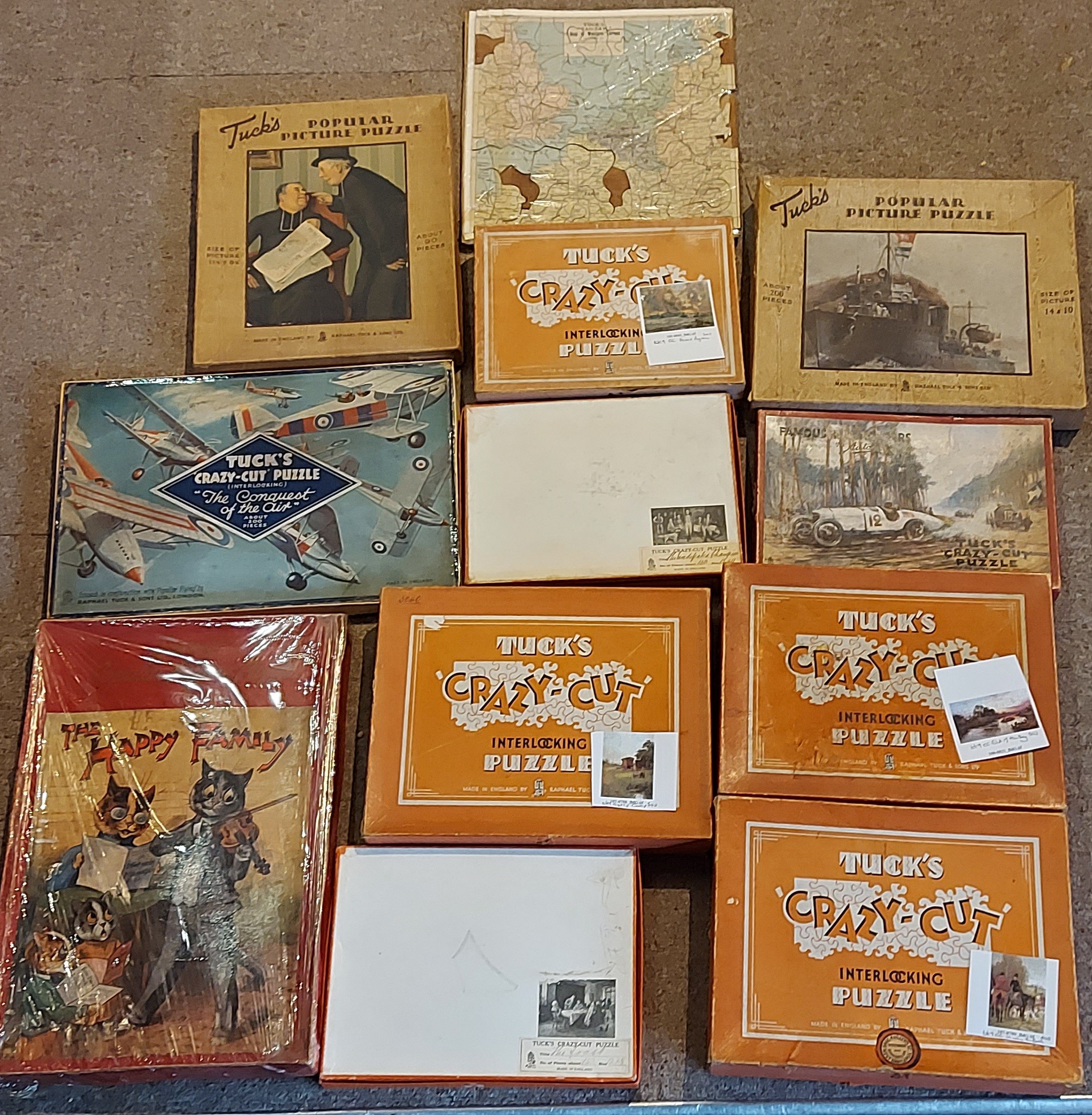 Raphael Tuck and Sons Crazy-Cut Puzzle The Toast together with five similar puzzles, Tucks Picture puzzle The Happy Family and three other Tucks puzzles