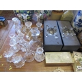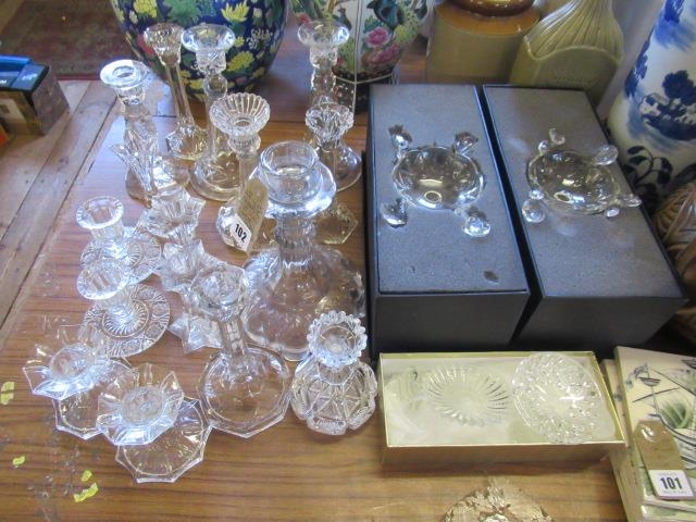 QUANTITY OF CUT GLASS CANDLESTICKS ETC INCLUDING BOXED PAIR