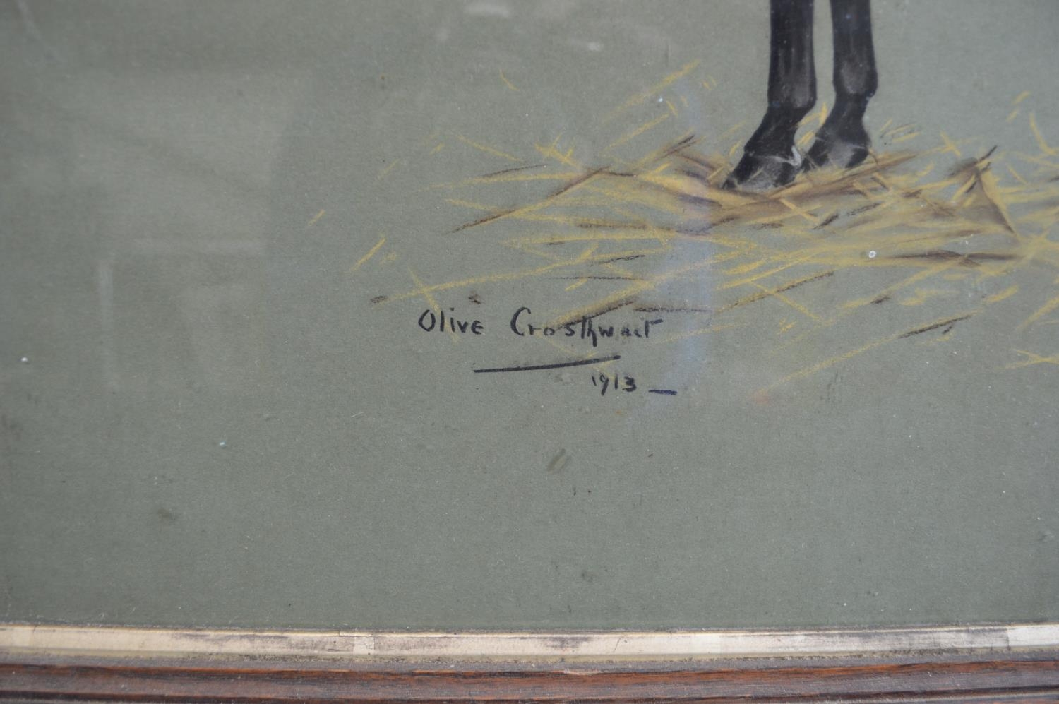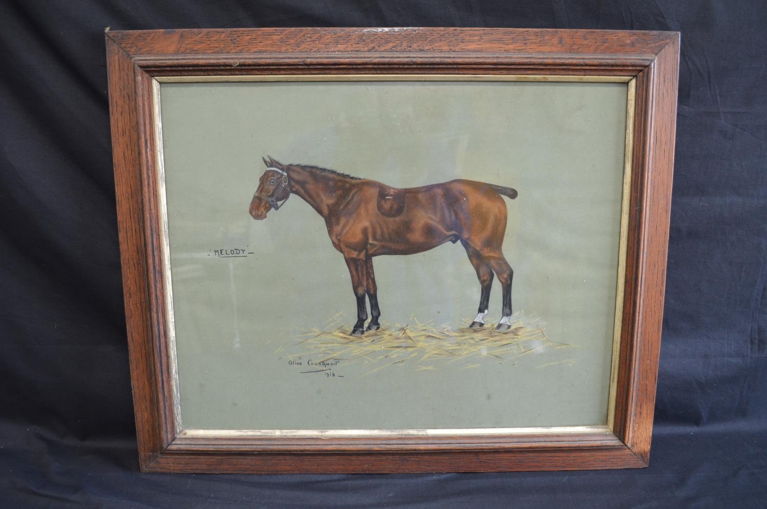 Olive Crosthwait (British 20th century) mixed media portrait of a horse titled Melody, signed and dated 1913 lower left - 49.5cm x 39cm in glazed oak frame