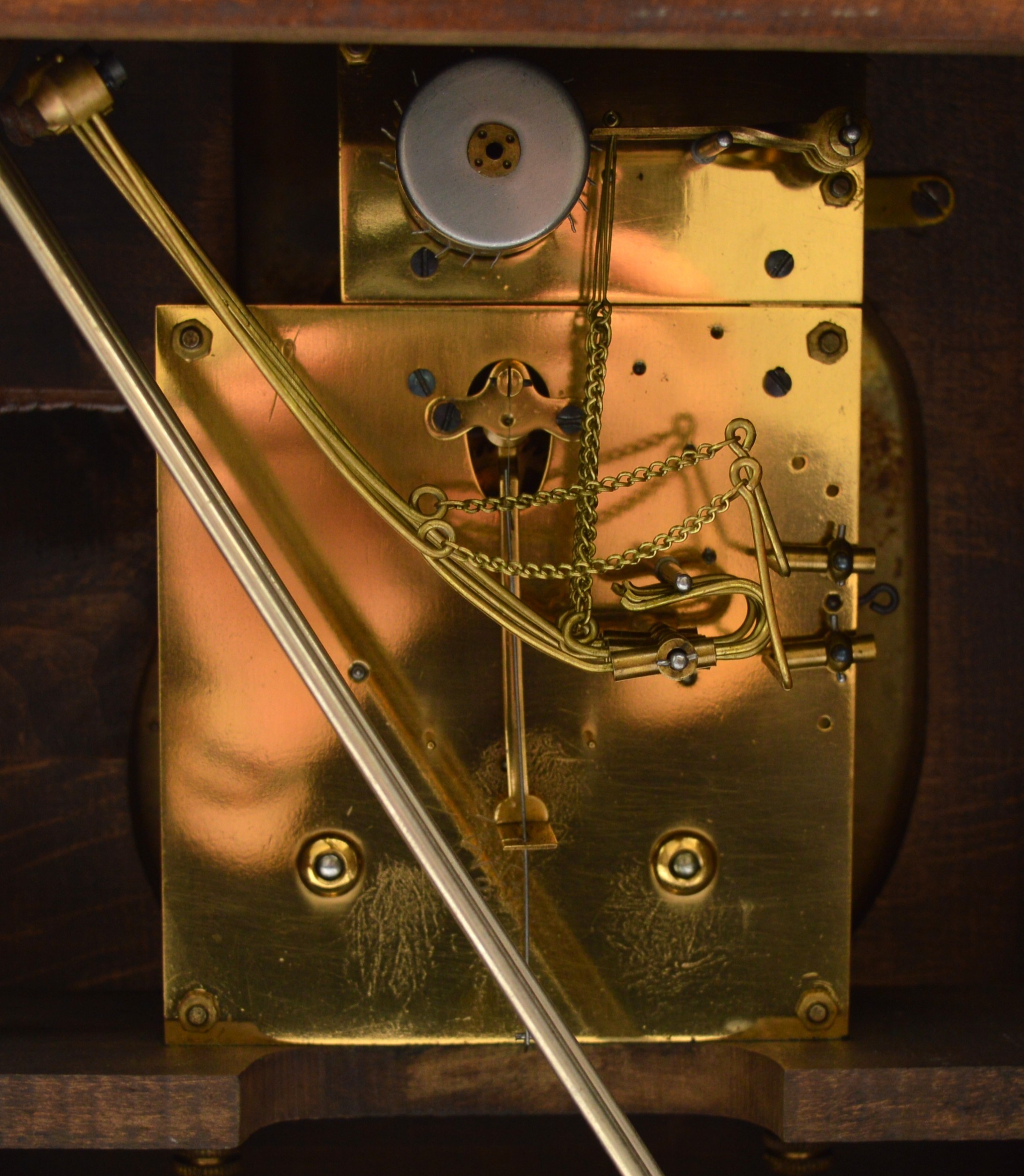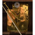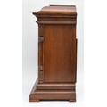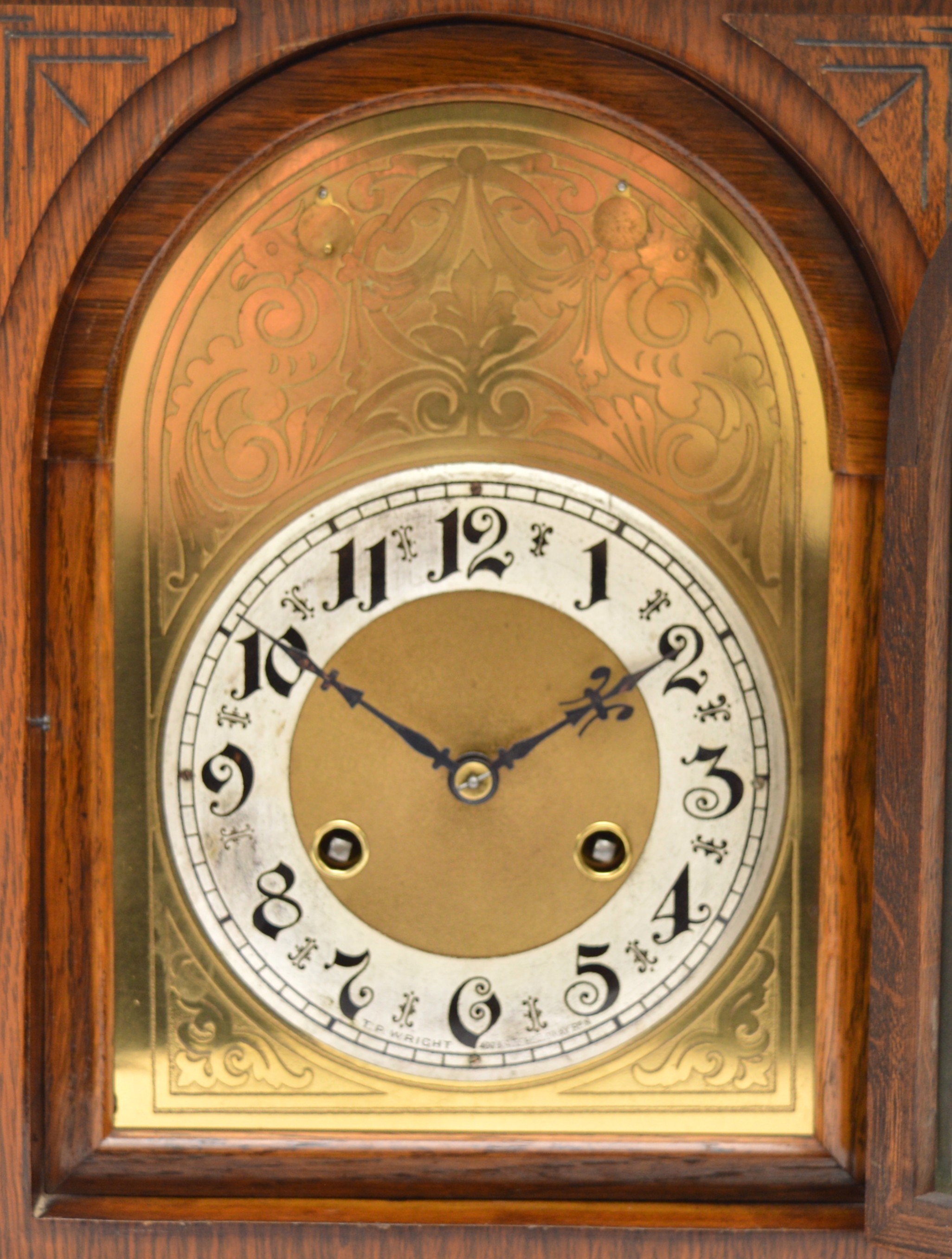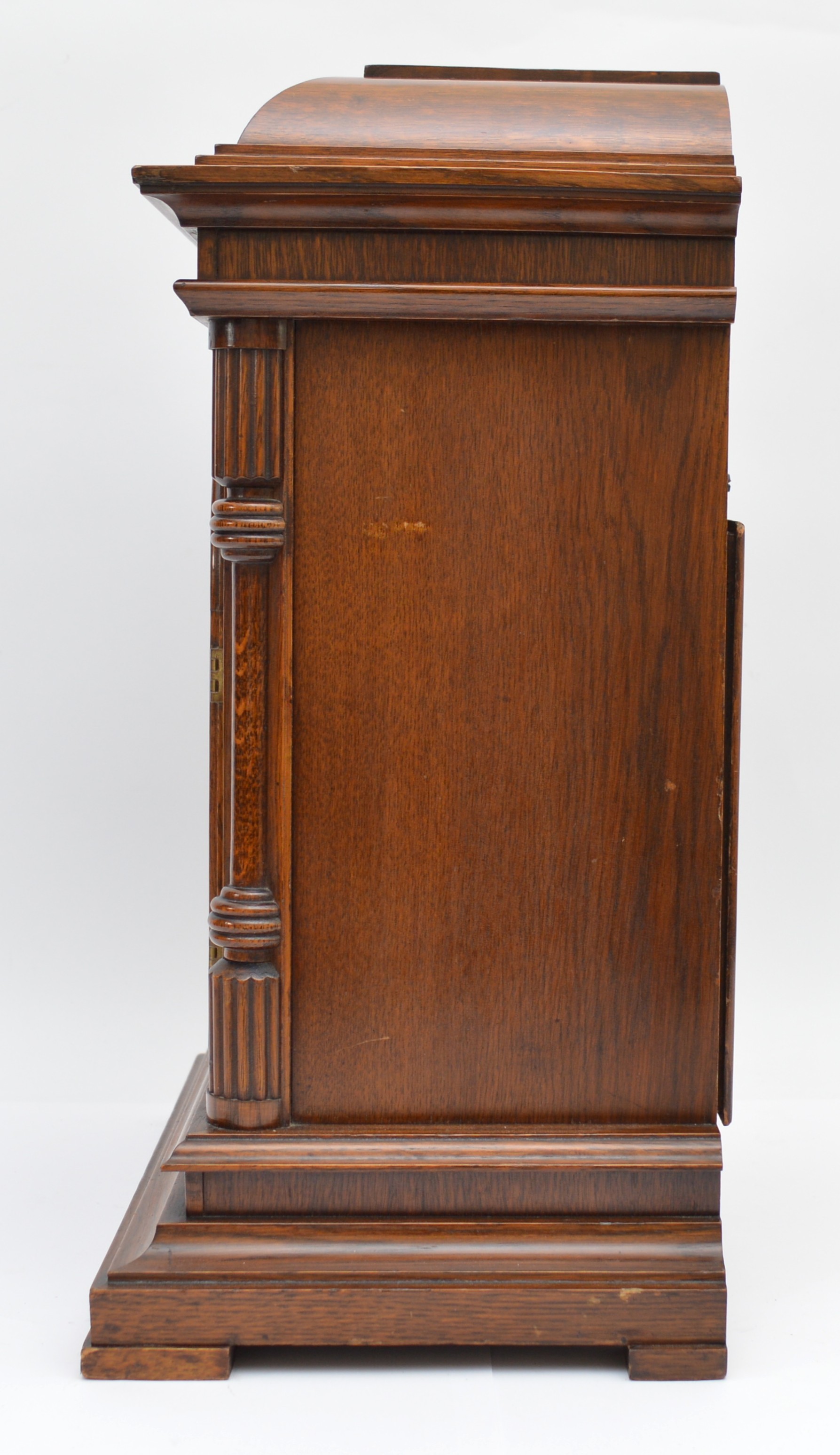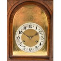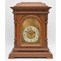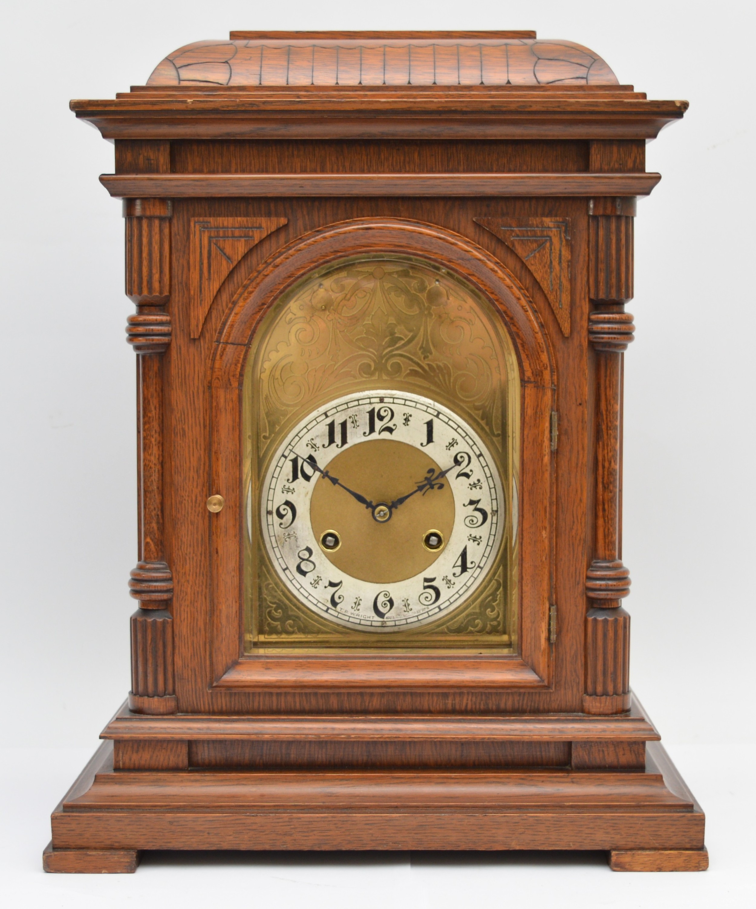 Junghans, a 20th century oak Westminster chiming bracket clock, retailed by T.P. Wright, Holloway Road, London, silvered chapter ring with Arabic numerals, secret chiming hole, the signed movement striking the hours, halves and quarters on five rods, architectural case, pendulum, key, 44.5cm
