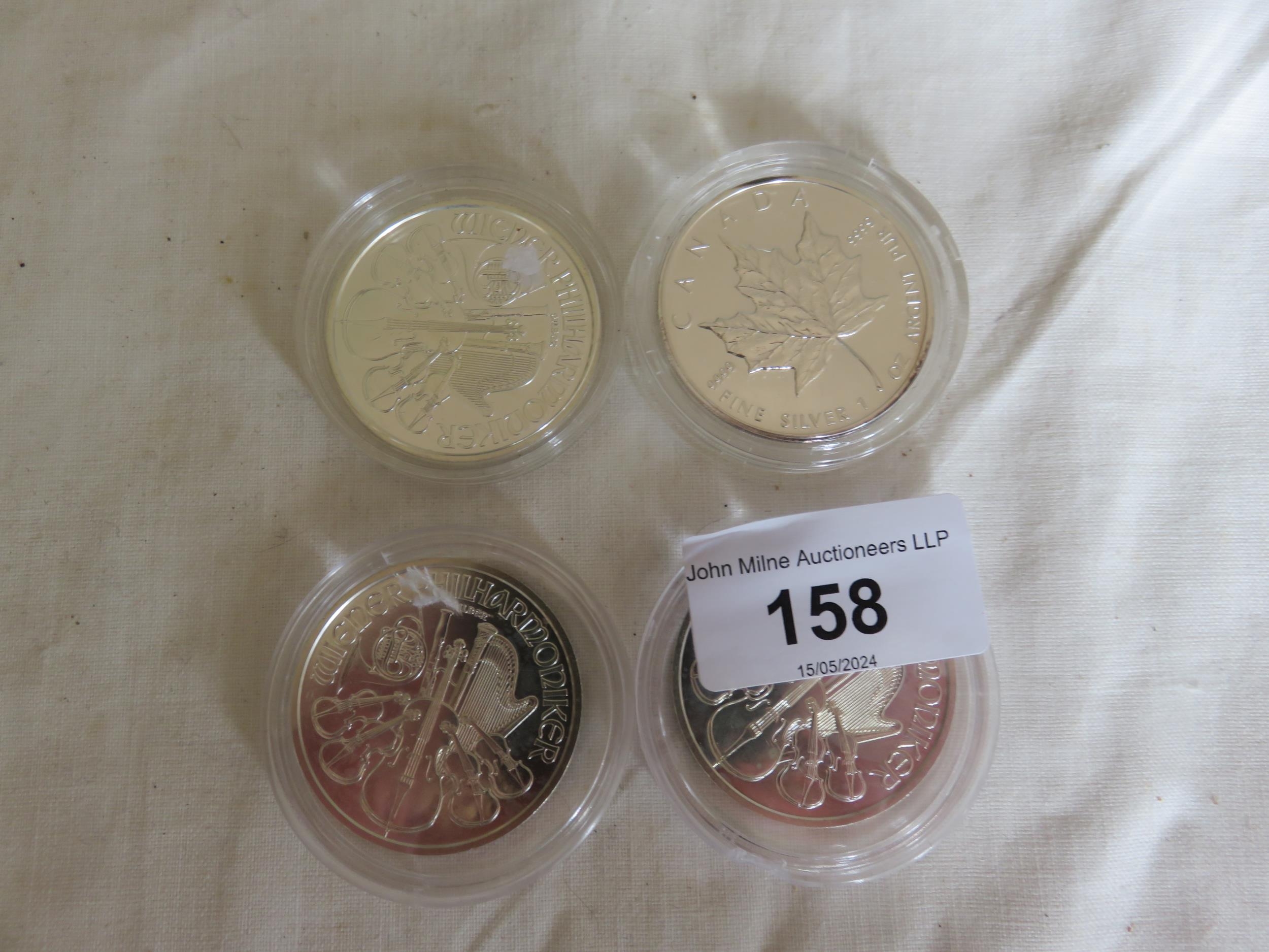 Three Austrian Mint Fine Silver one Ounce 2015 150 Euro Coins "Philharmonic", Capsulated, One Royal Canadian Mint 9999 Silver one ounce 1996 $5 Coins "Maple" Capsulated