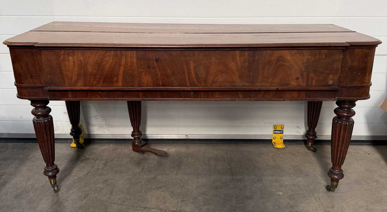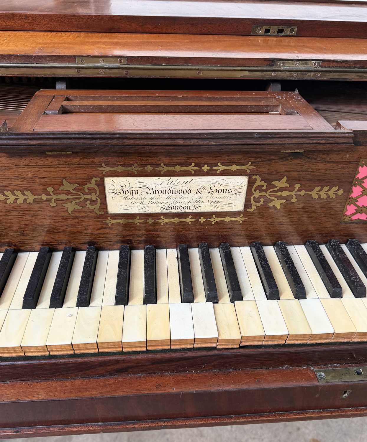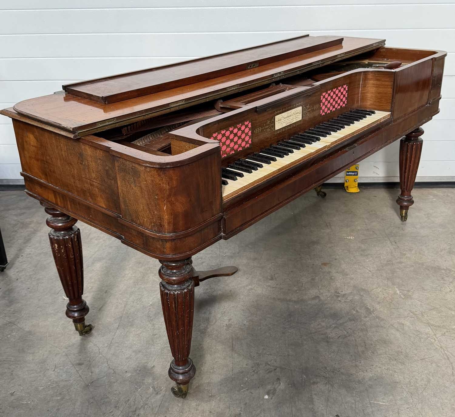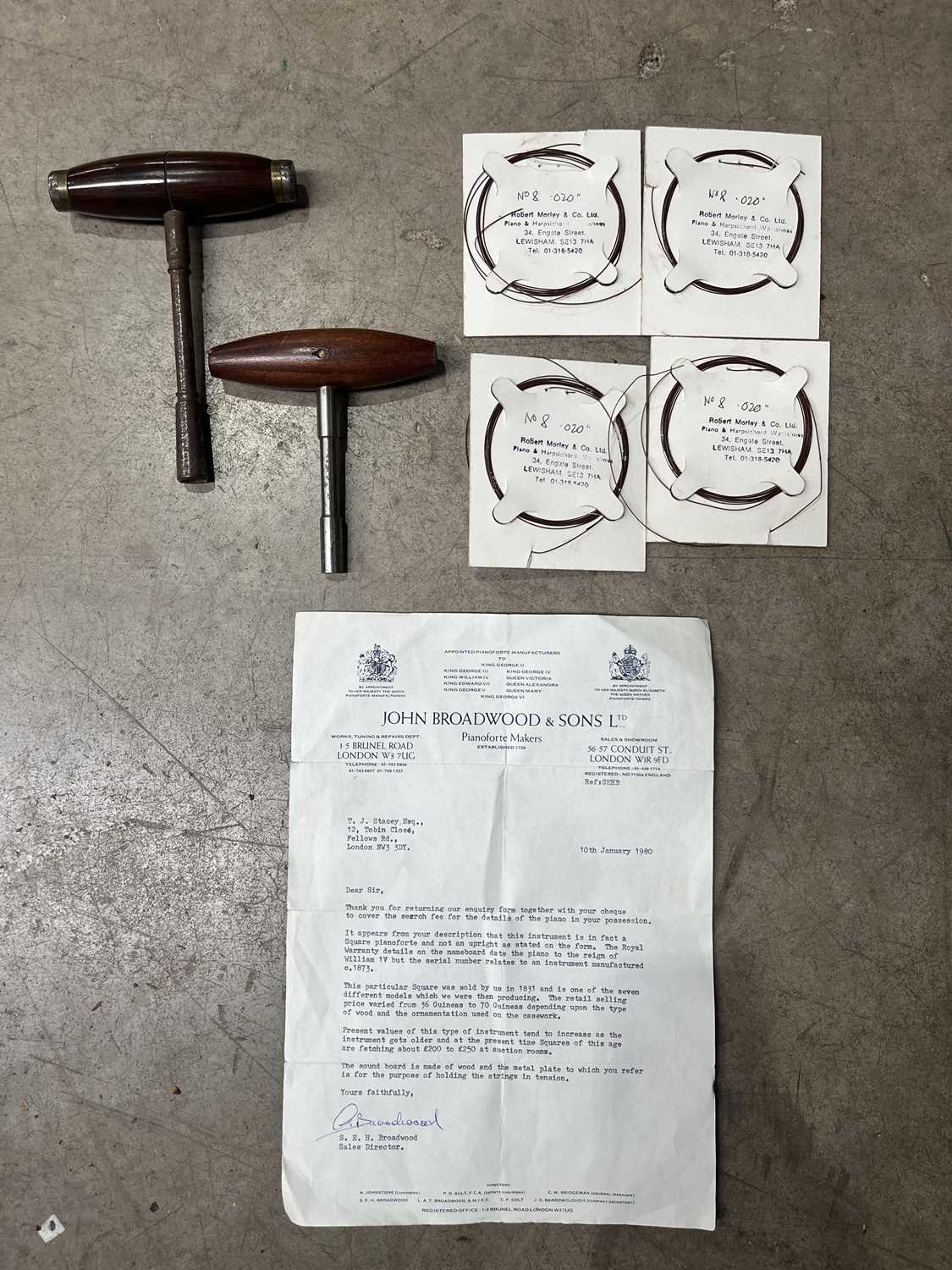 A late 18th early 19th century mahogany square piano, John Broadwood & Sons, fretted brass panels next to makers plaque and warrant, on four turned and fluted legs, to brass castors, together with rosewood handles string tightener, spare strings, letter from Broadwood and Co c.1980, height 86cm, width 179cm, depth 70cm (1) Ivory Exemption Submission Ref: L1NCJ7LH