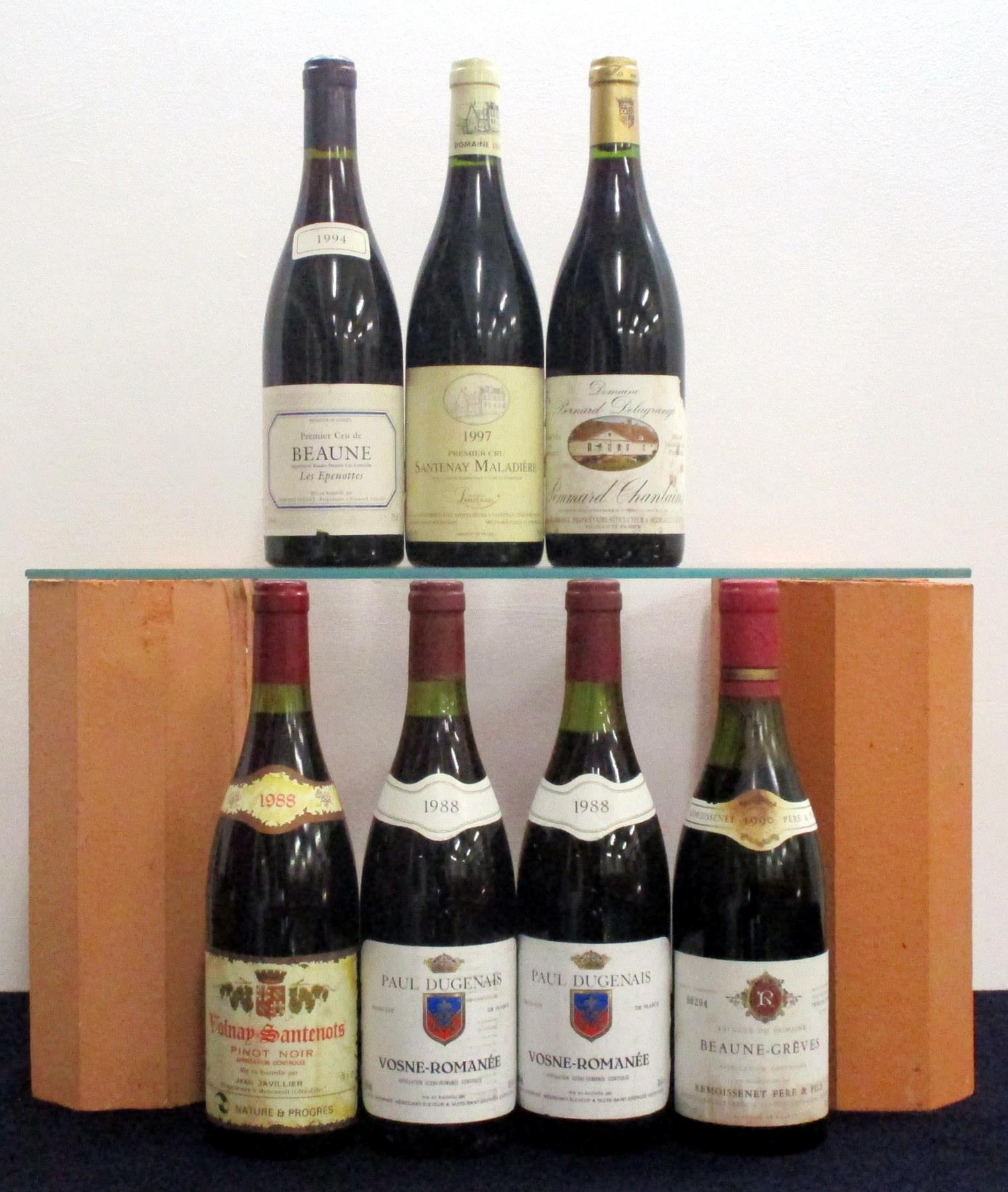 1 bt Volnay-Santenots Pinot Noir 1988 Jean Javillier i.n 2 bts Vosne-Romanée 1988 Paul Dugenais vts, ts, vsl stl 1 bt Beaune-Grèves 1990 Remoissenet Père et Fils lms, sl stl, foil sl crusted 1 bt Beaune 1er Cru Les Epenottes 1994 Dom Parent hf/i.n 1 bt Santenay Maladière 1er Cru 1997 Dom Lucien Muzard i.n 1 bt Pommard Chanlins Vintage Unknown Dom Bernard Delagrange, hf, missing vintage slip '1995' handwritten on stl Above seven bottles