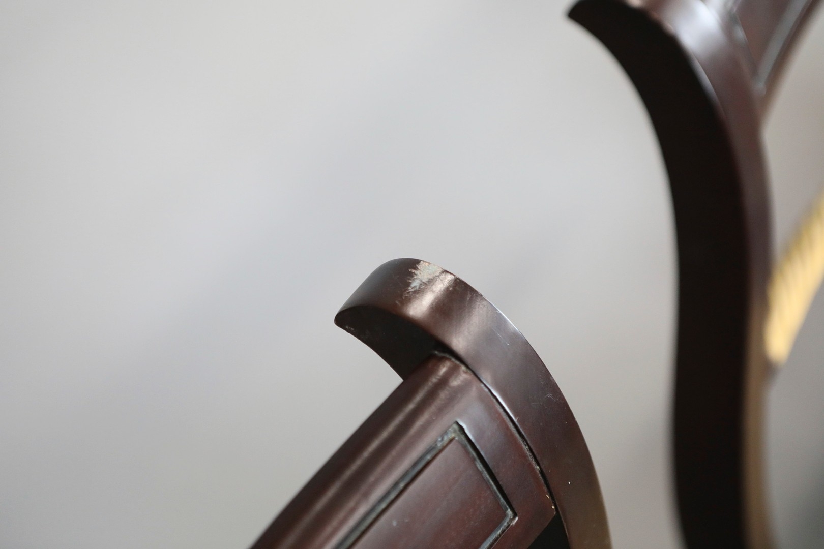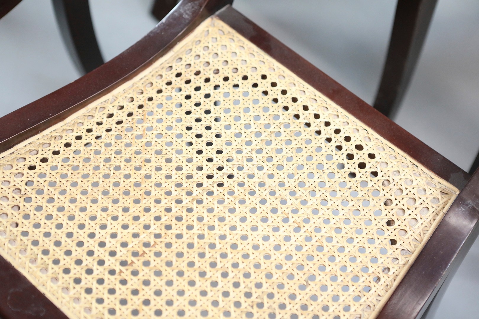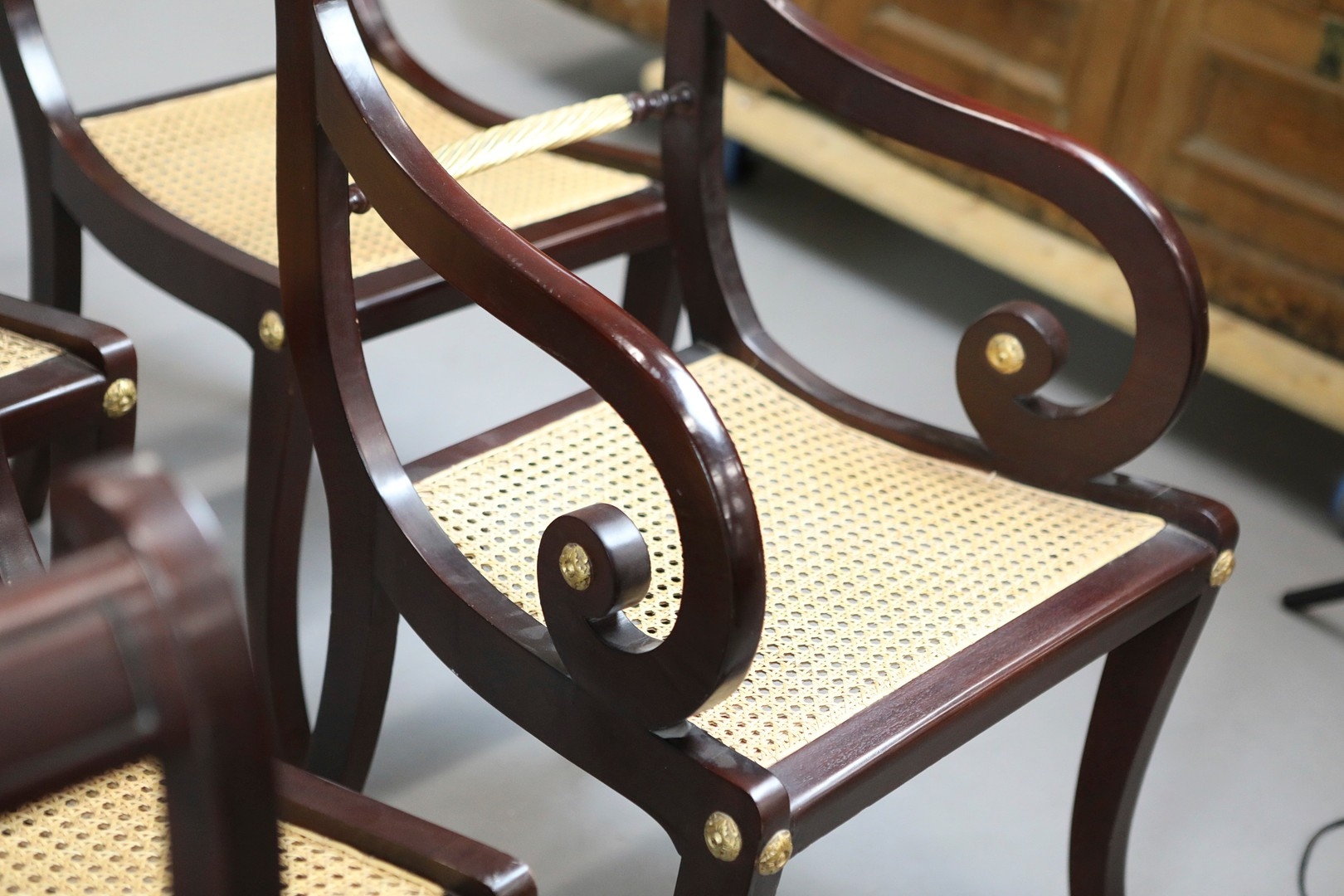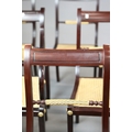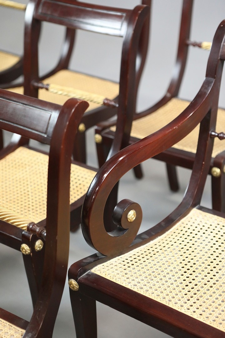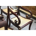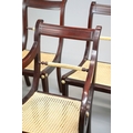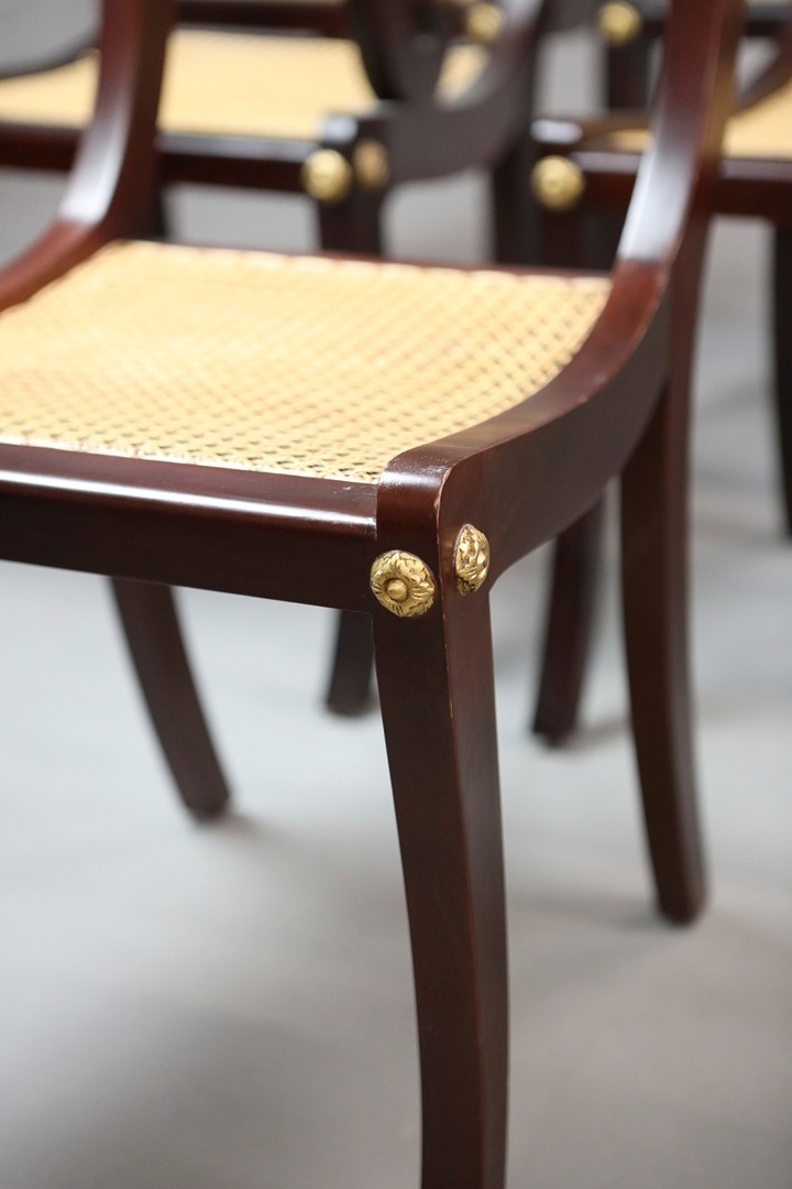SET OF TWELVE REGENCY STYLE DINING CHAIRS (12). mahogany finish and gilt highlights including two armchairs with caned seats 90cm H x 56cm W, standard chairs 49cm W.