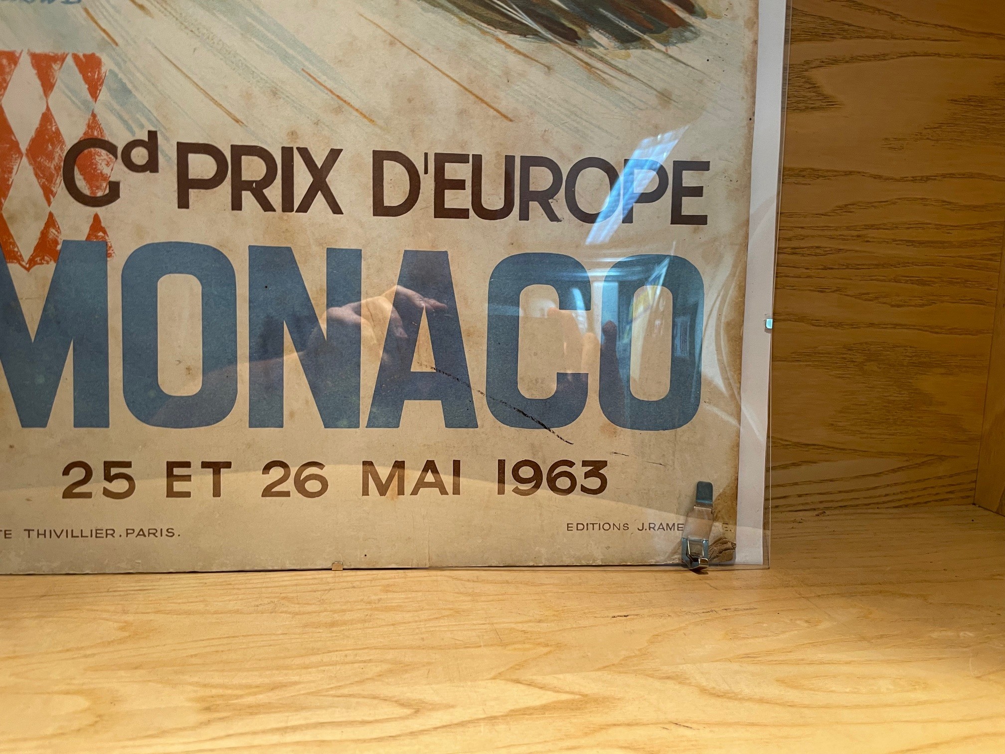 Monaco Grand Prix 1963 Original Poster, measuring 38cm x 59cm. The vendor removed it from Rosies Bar (with permission of Rosie) in Monte Carlo following the race, where the BRM team were celebrating their 1-2 race victory with drivers Graham Hill and Richie Ginther.