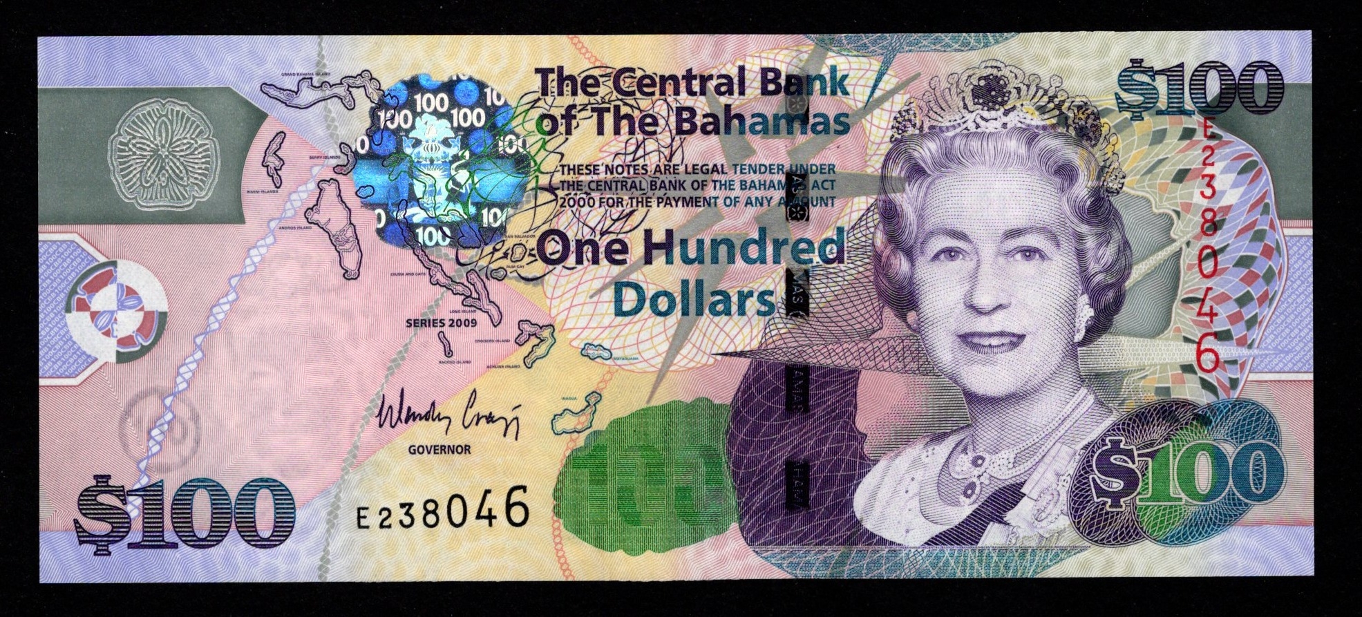 Bahamas 100 Dollars dated 2009, Queen Elizabeth II portrait at right, signed W. Craigg, serial E238046 (BNB B343a, Pick76a) Uncirculated