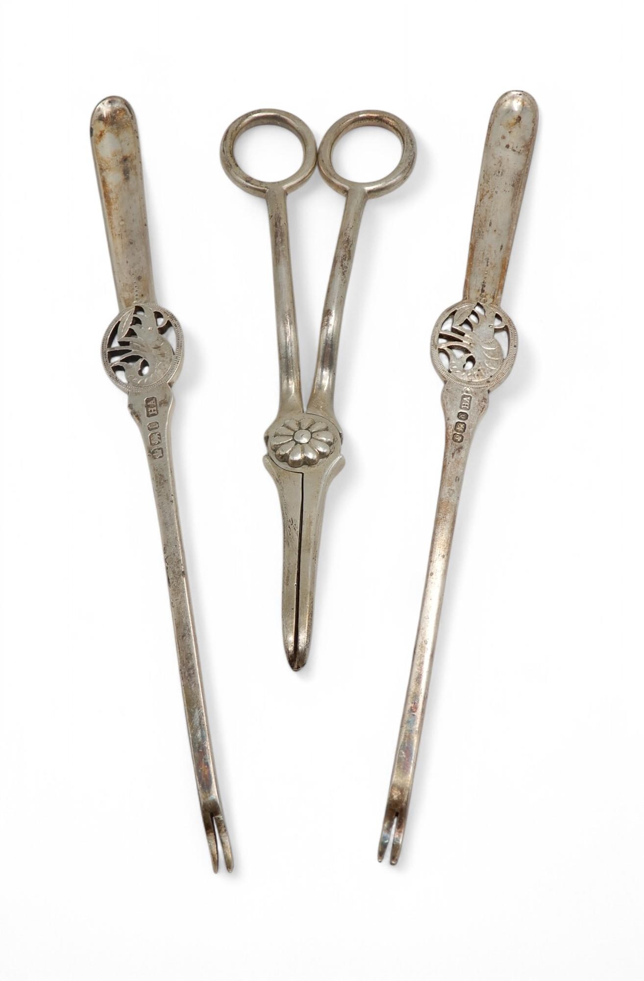 A pair of Victorian silver lobster picks, by Atkin Brothers, Sheffield 1896, and a pair of William IV grape scissors, London 1830, 151gms (3)