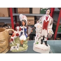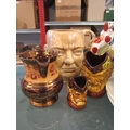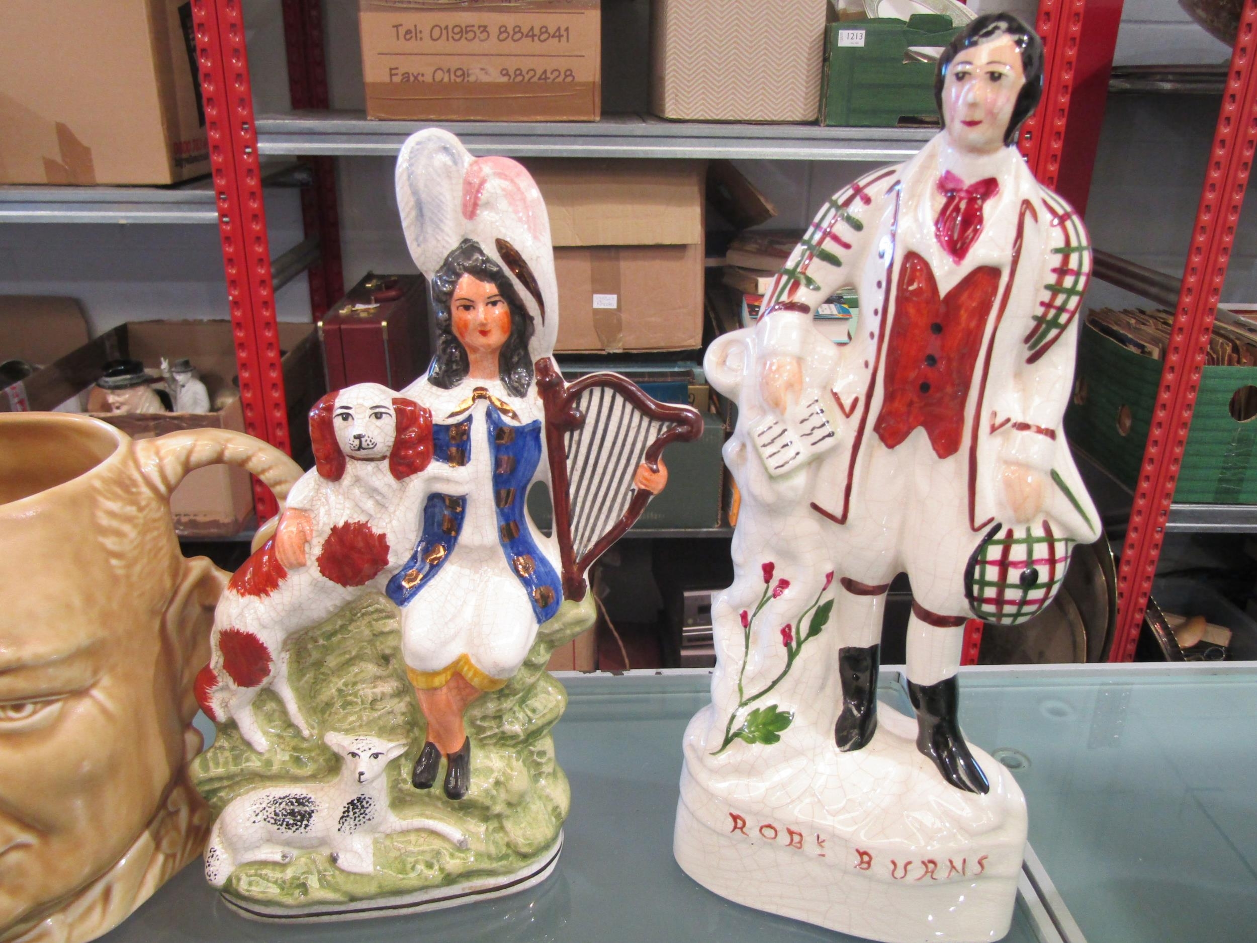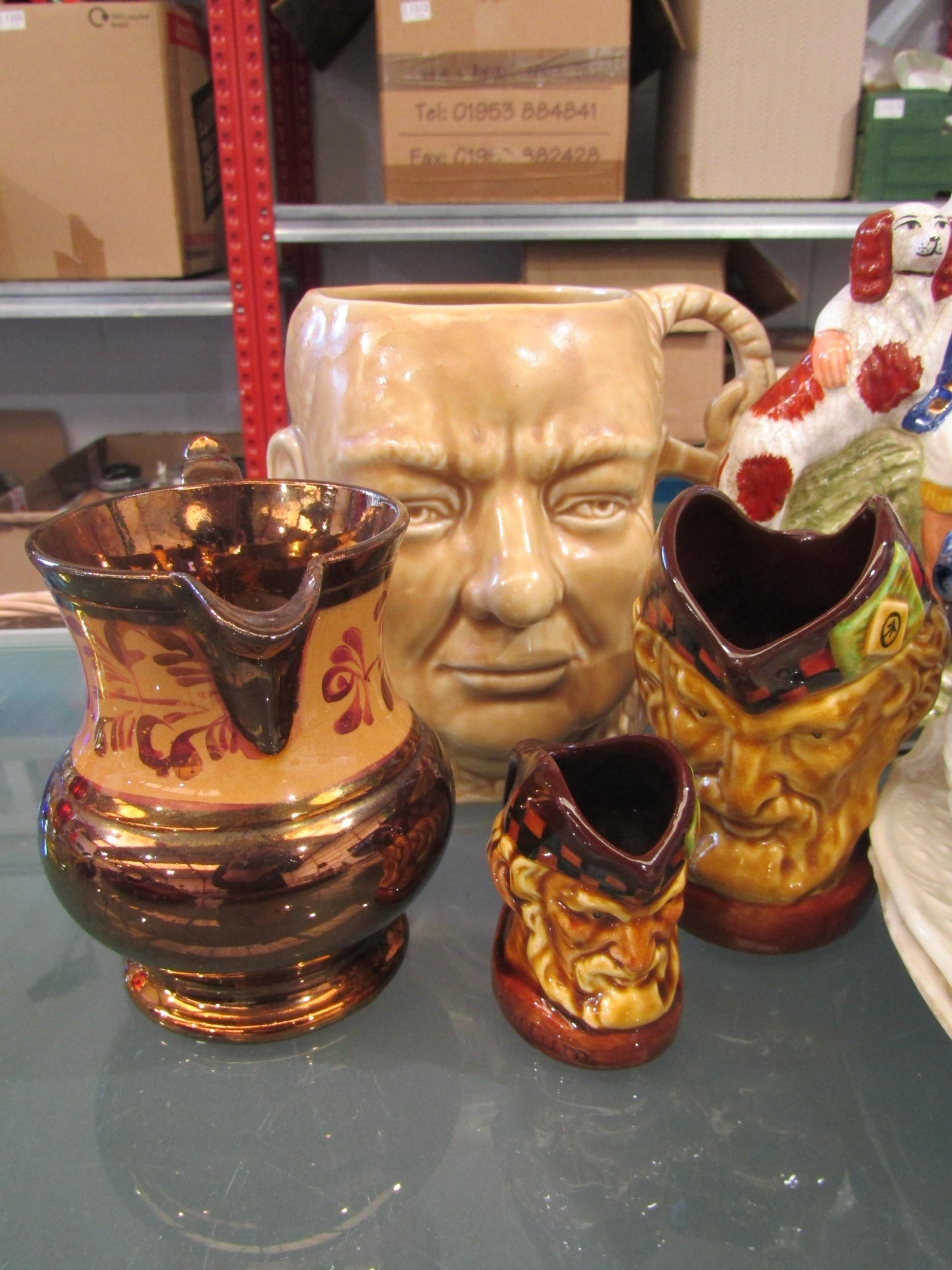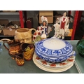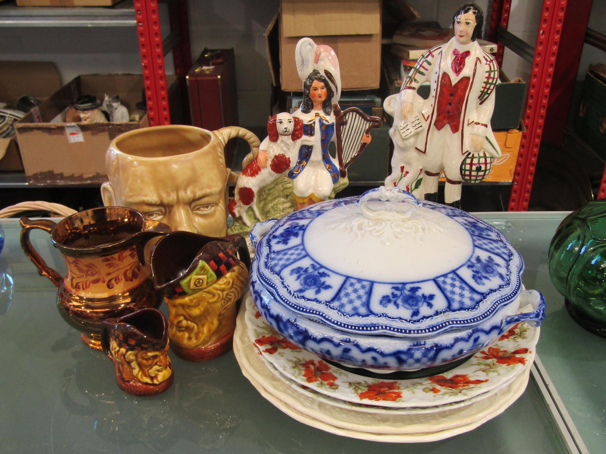 Two Staffordshire figures including Robbie Burns, a Sadler Winston Churchill character jug, lustre jug, Melbourne blue and white tureen and plates etc.