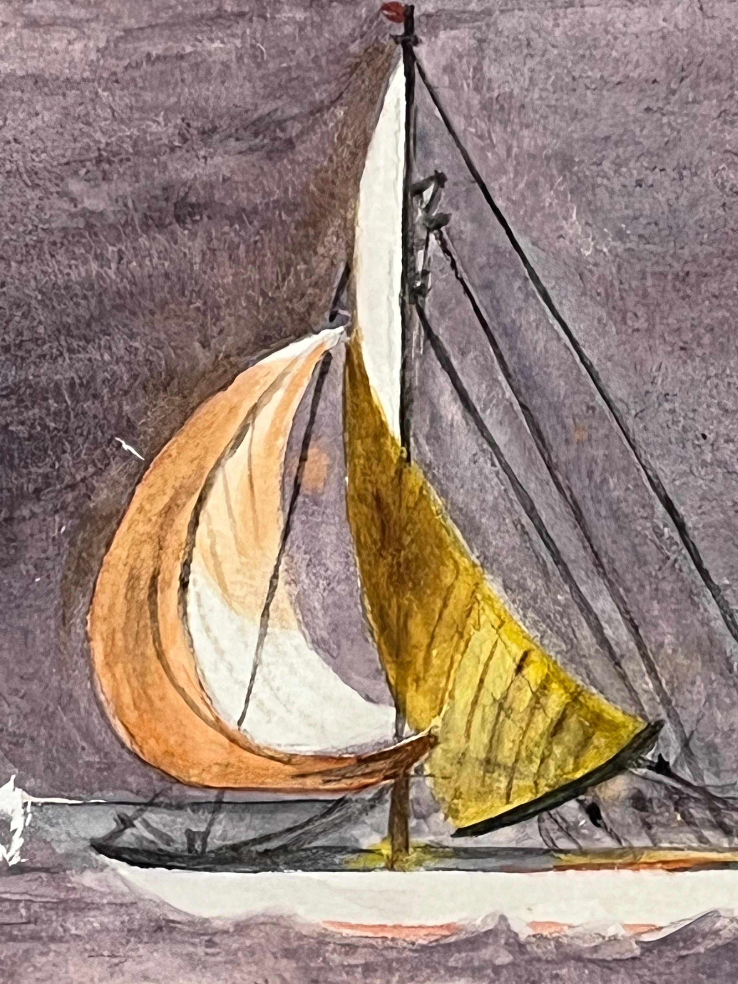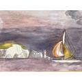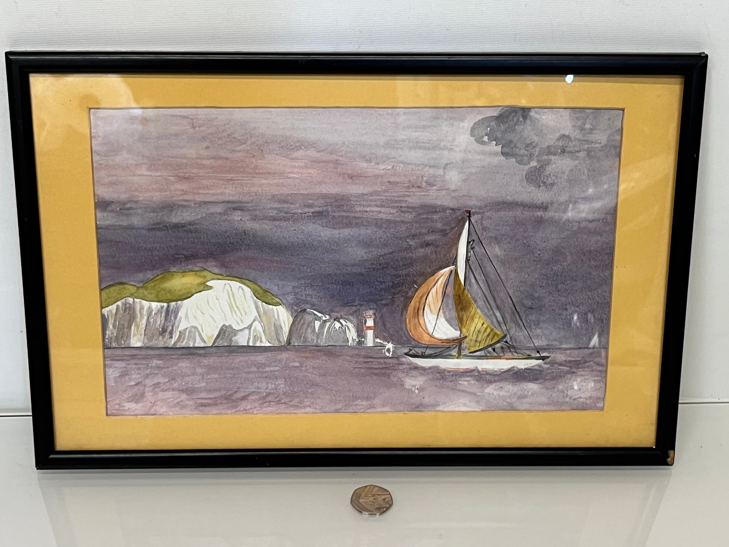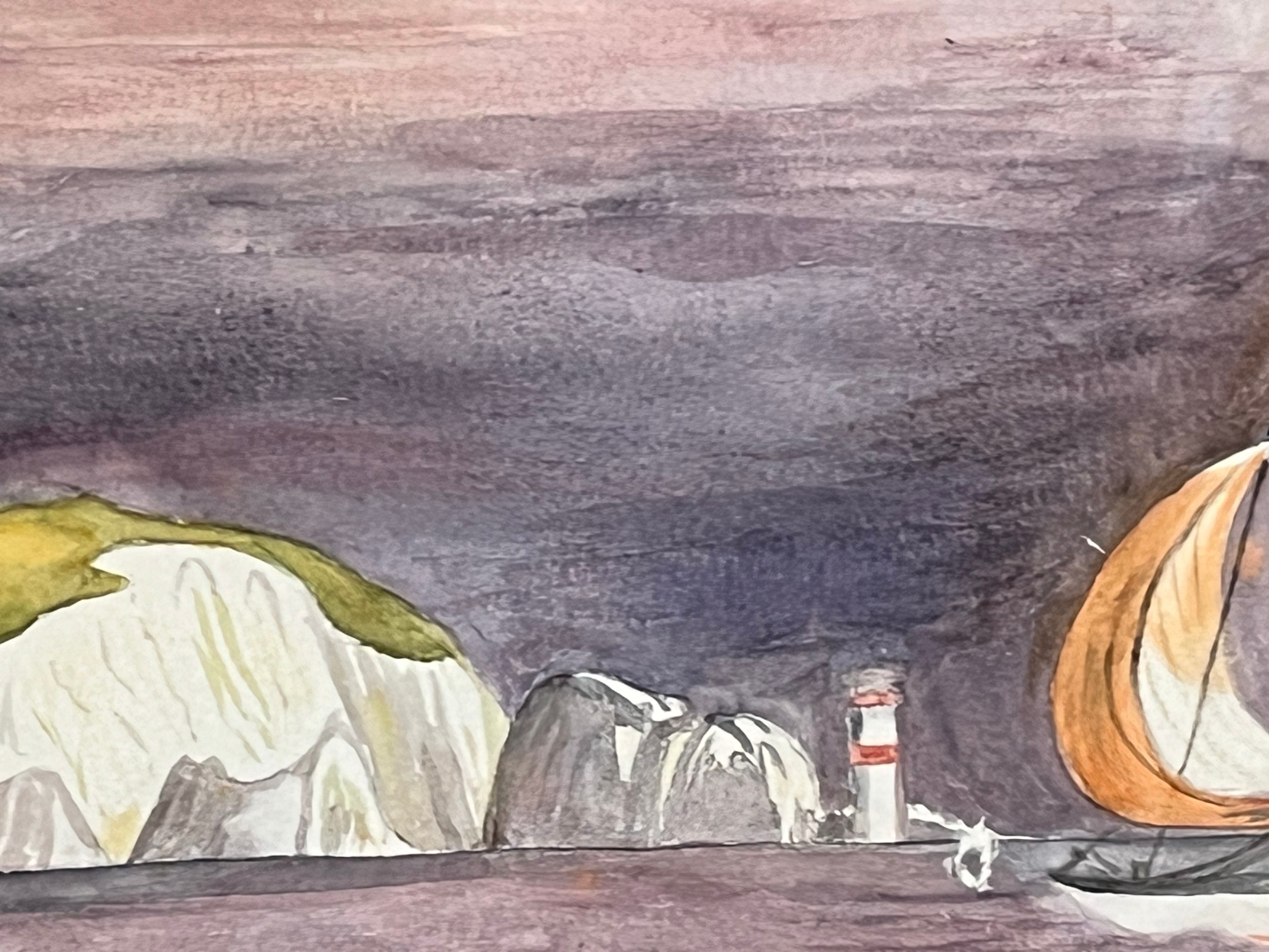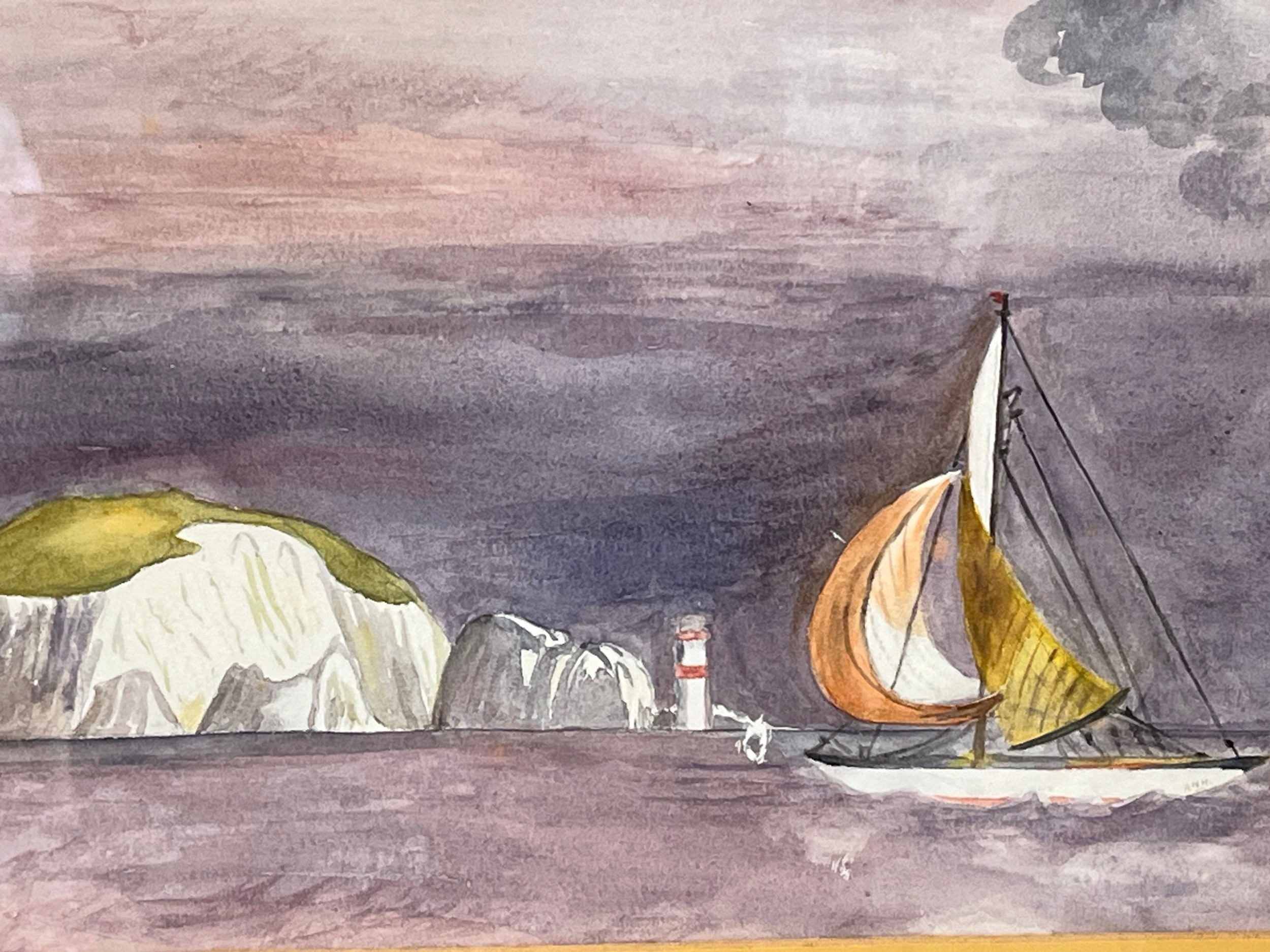 Isle of Wight painting, a naive water colour of a nautical scene, an elegant yacht at speed against the background of "The Needles". Titled "Storm Cloud” to the rear. 42 cm x 27 cm.