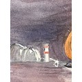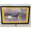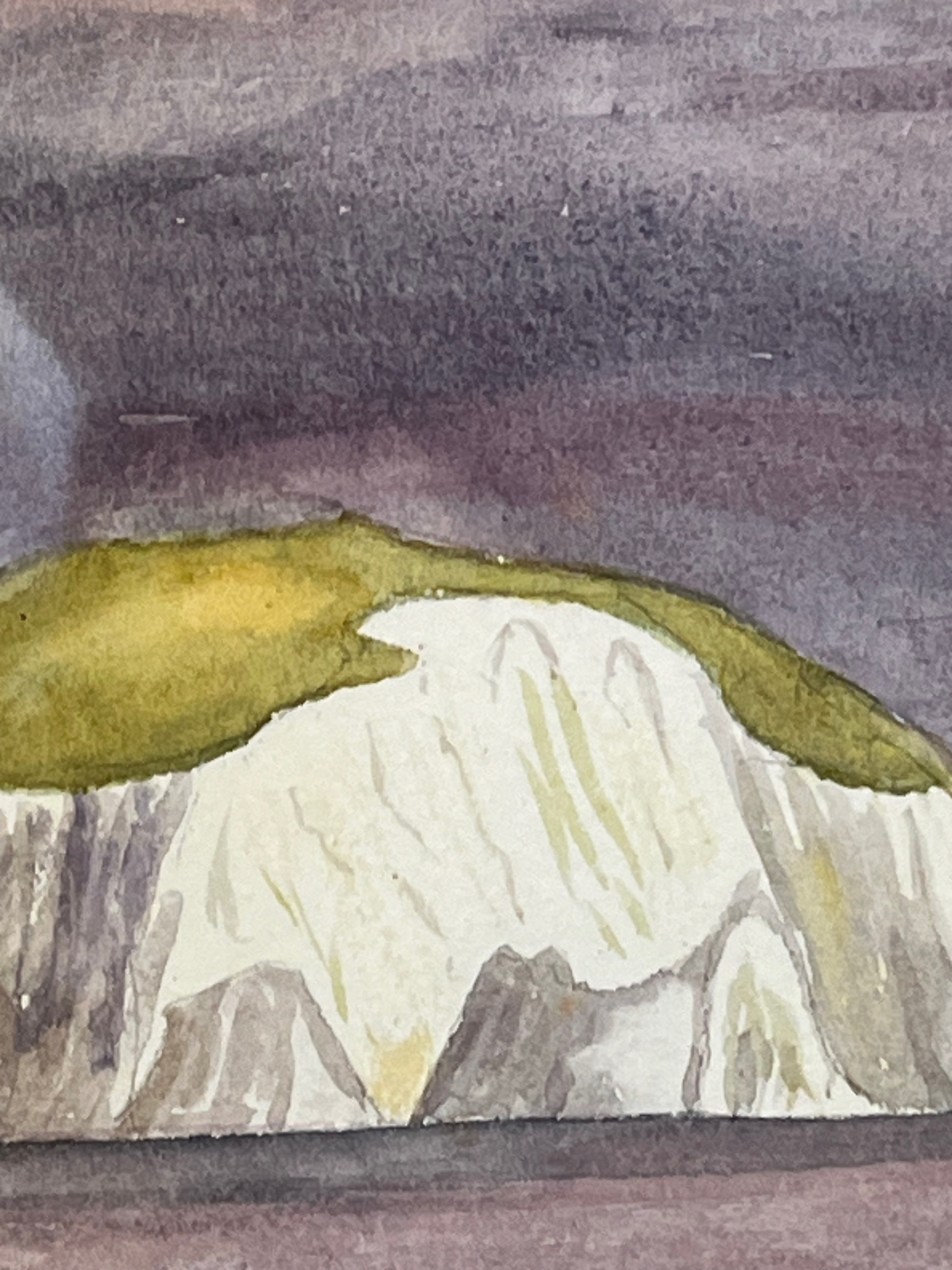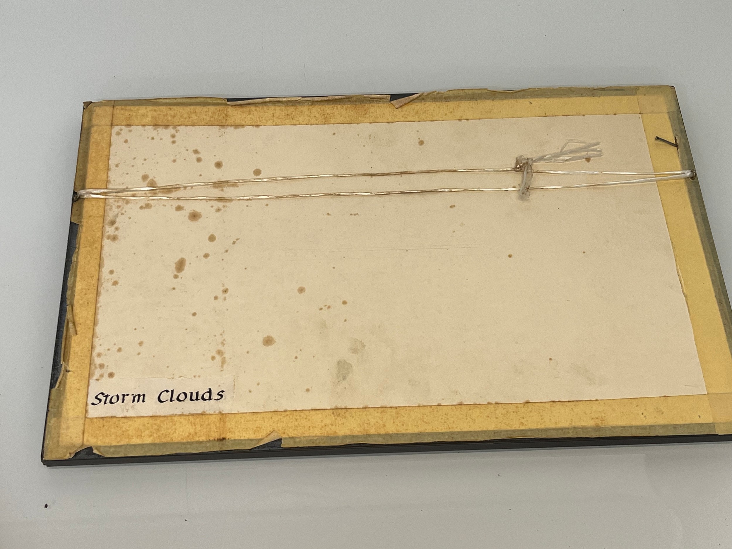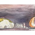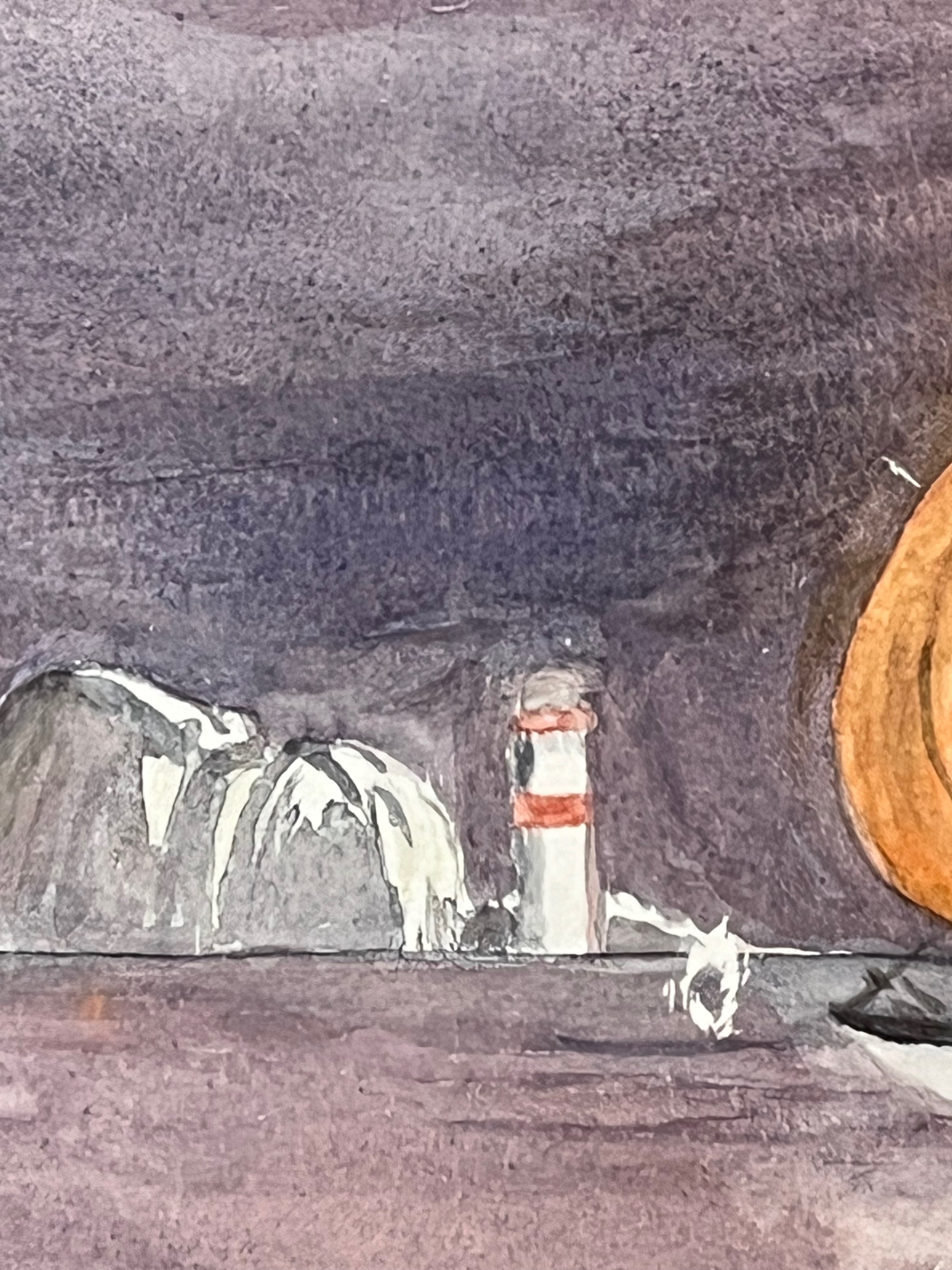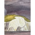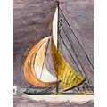 Isle of Wight painting, a naive water colour of a nautical scene, an elegant yacht at speed against the background of "The Needles". Titled "Storm Cloud” to the rear. 42 cm x 27 cm.