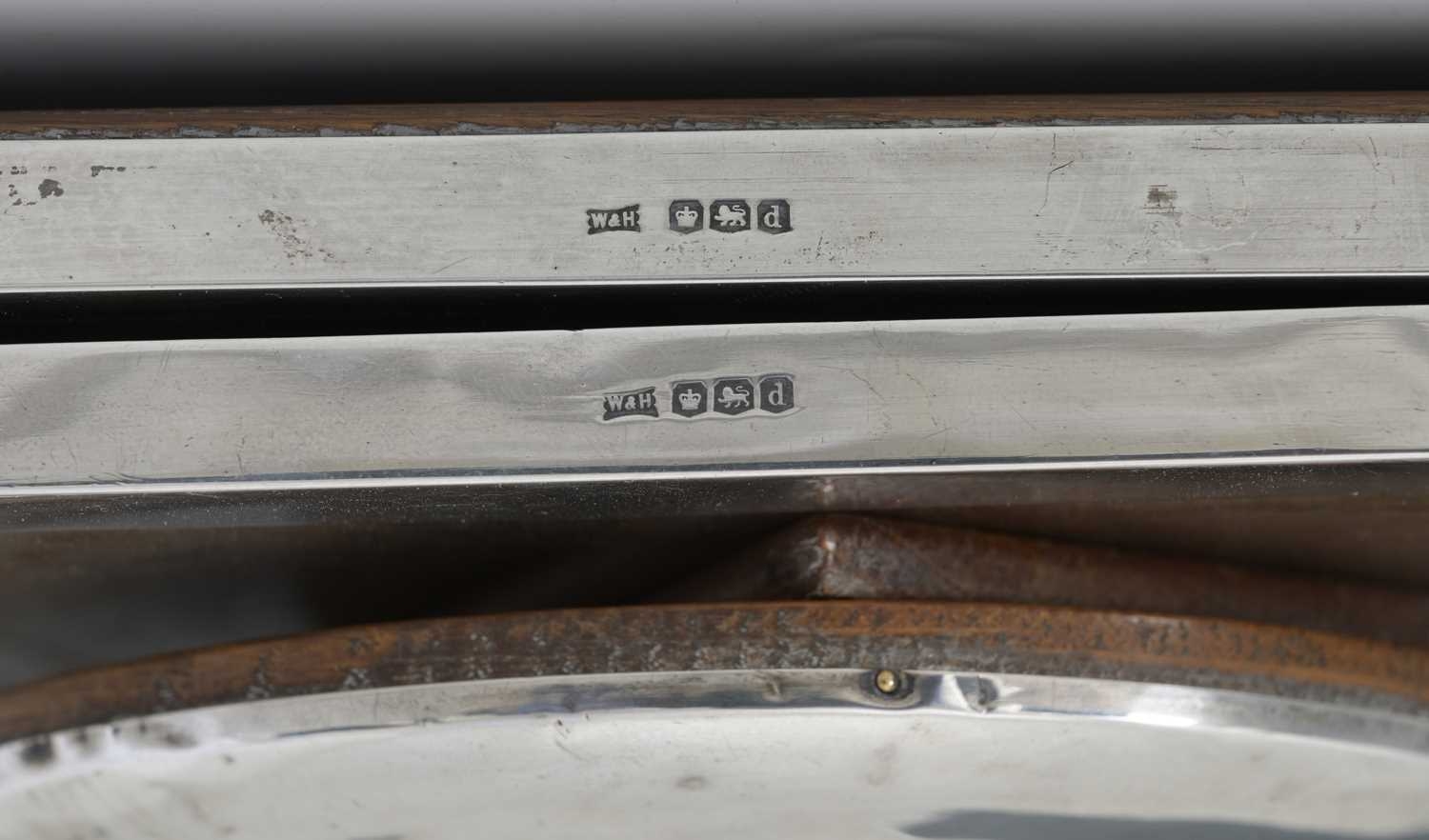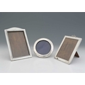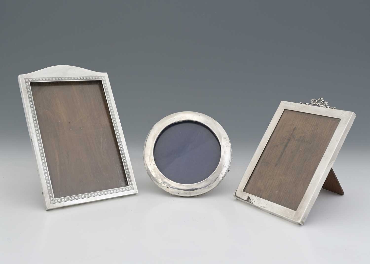 Three twentieth-century silver photograph frames, the larger example of rectangular form, by Walker & Hall, Sheffield 1921, with engine-turned border decorated with stylised flowerheads, with wooden back and easel-form support, height 21.7cm approx (3) (a/f)