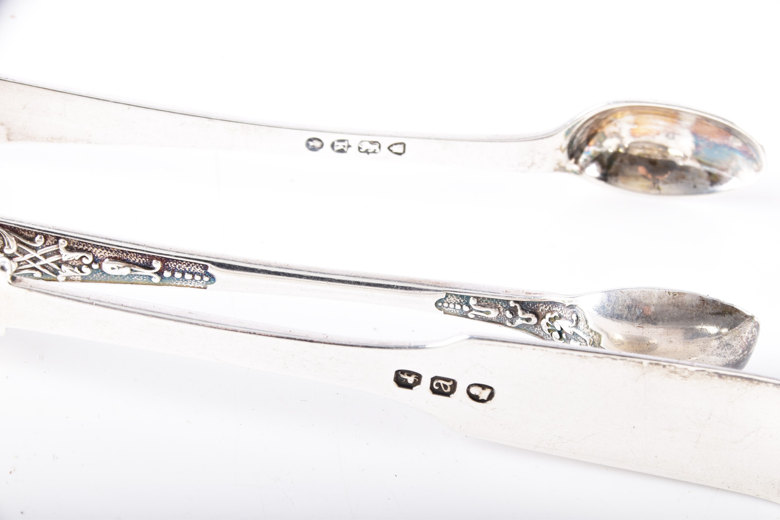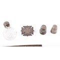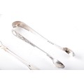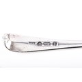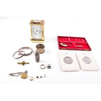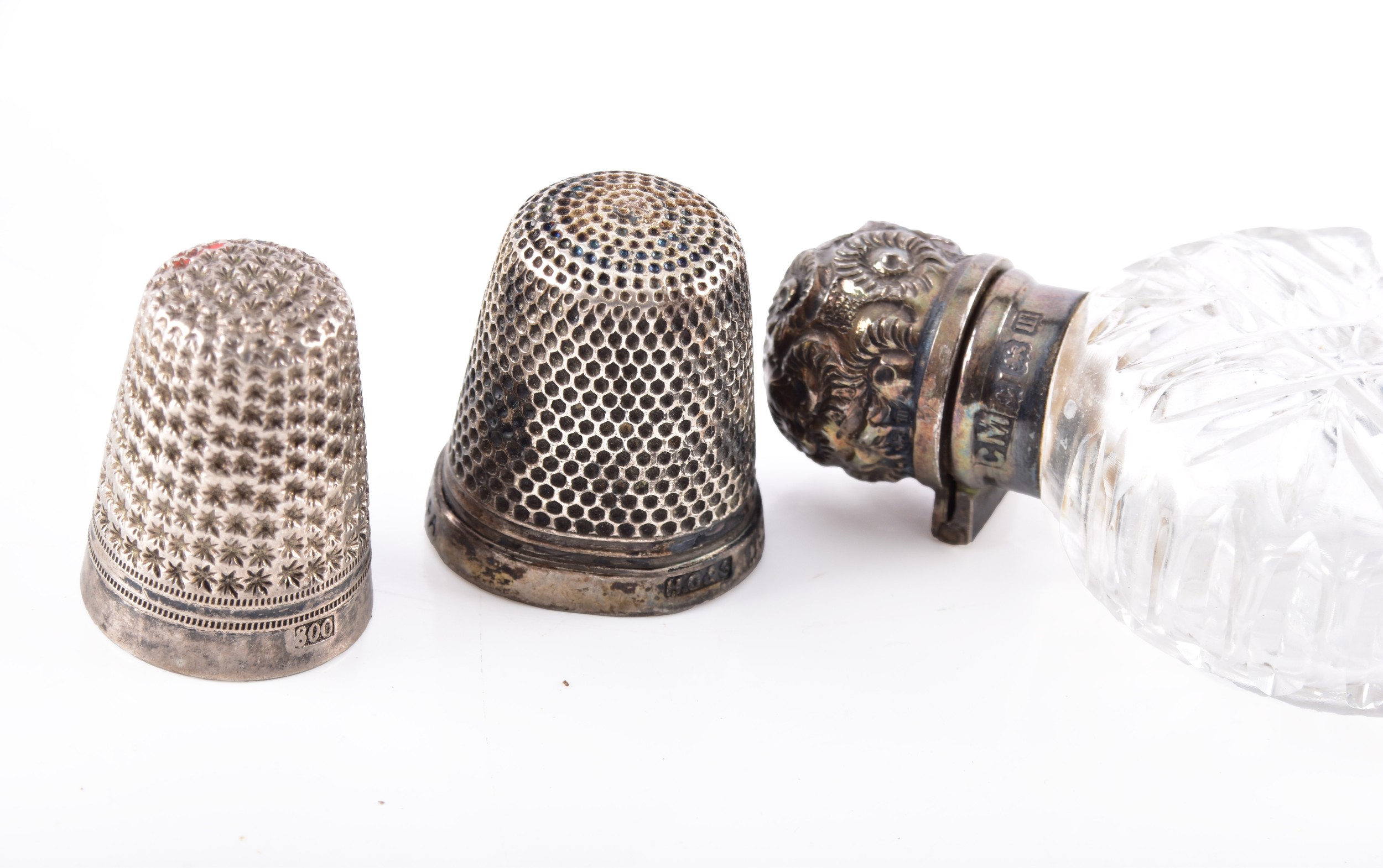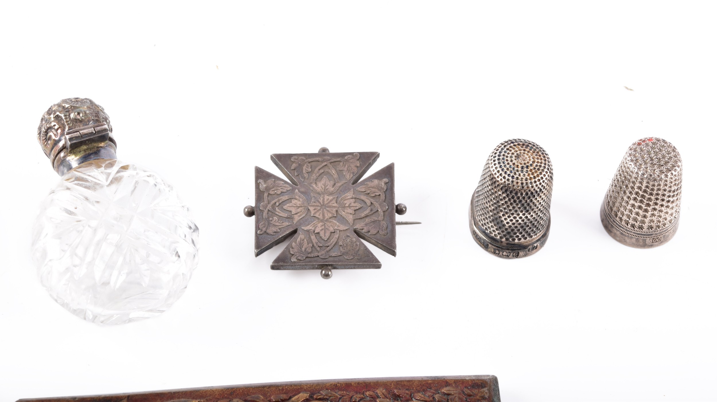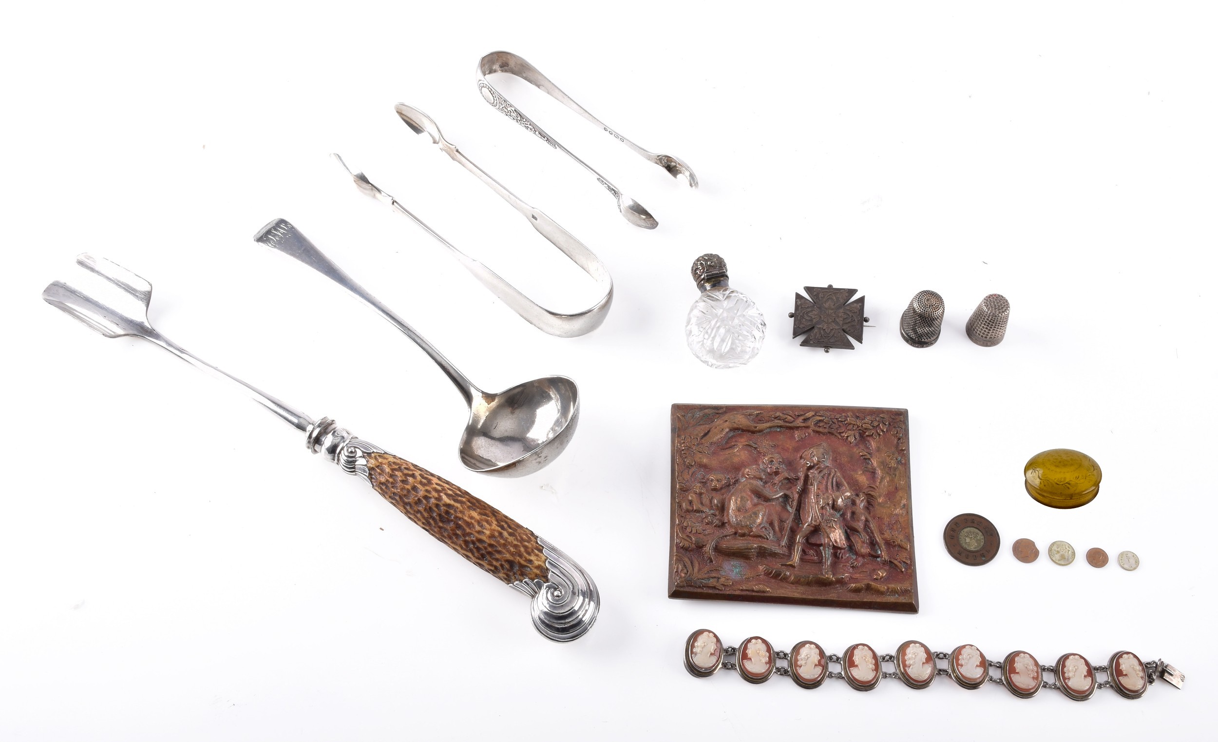 A group lot of assorted silver and other items, a pair of Victorian sugar tongs hallmarked for London 1885, a silver horn-handled stilton scoop, a George III sauce ladle hallmarked for London 1784, a George V silver thimble hallmarked for Birmingham 1931, a victorian silver brooch hallmarked for Chester 1887, an 800 silver thimble, a George V silver lidded scent bottle hallmarked for Birmingham 1911, a larger silver pair of sugar tongs, a silver cameo bracelet, together with a metal plaque and five coins in a container.