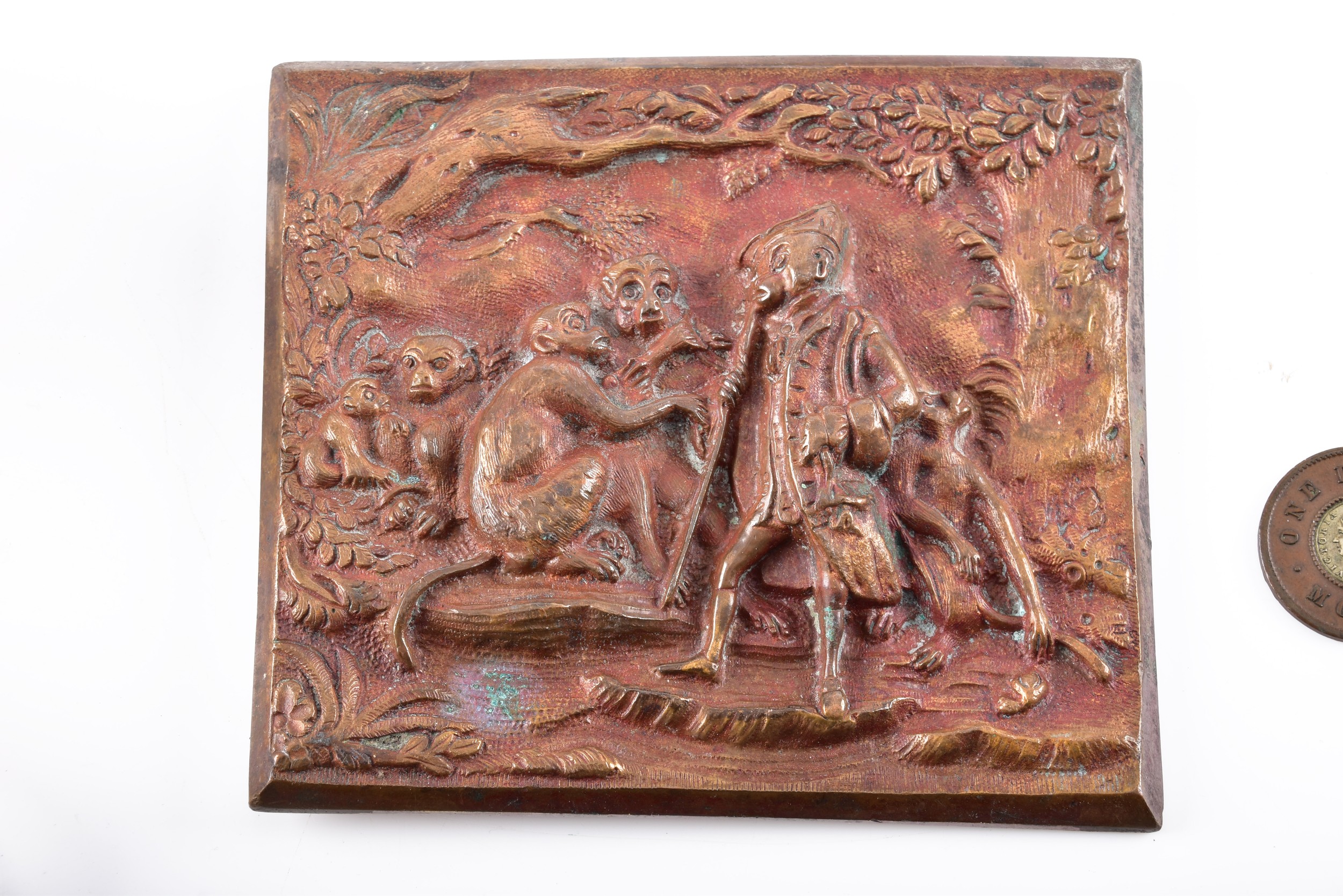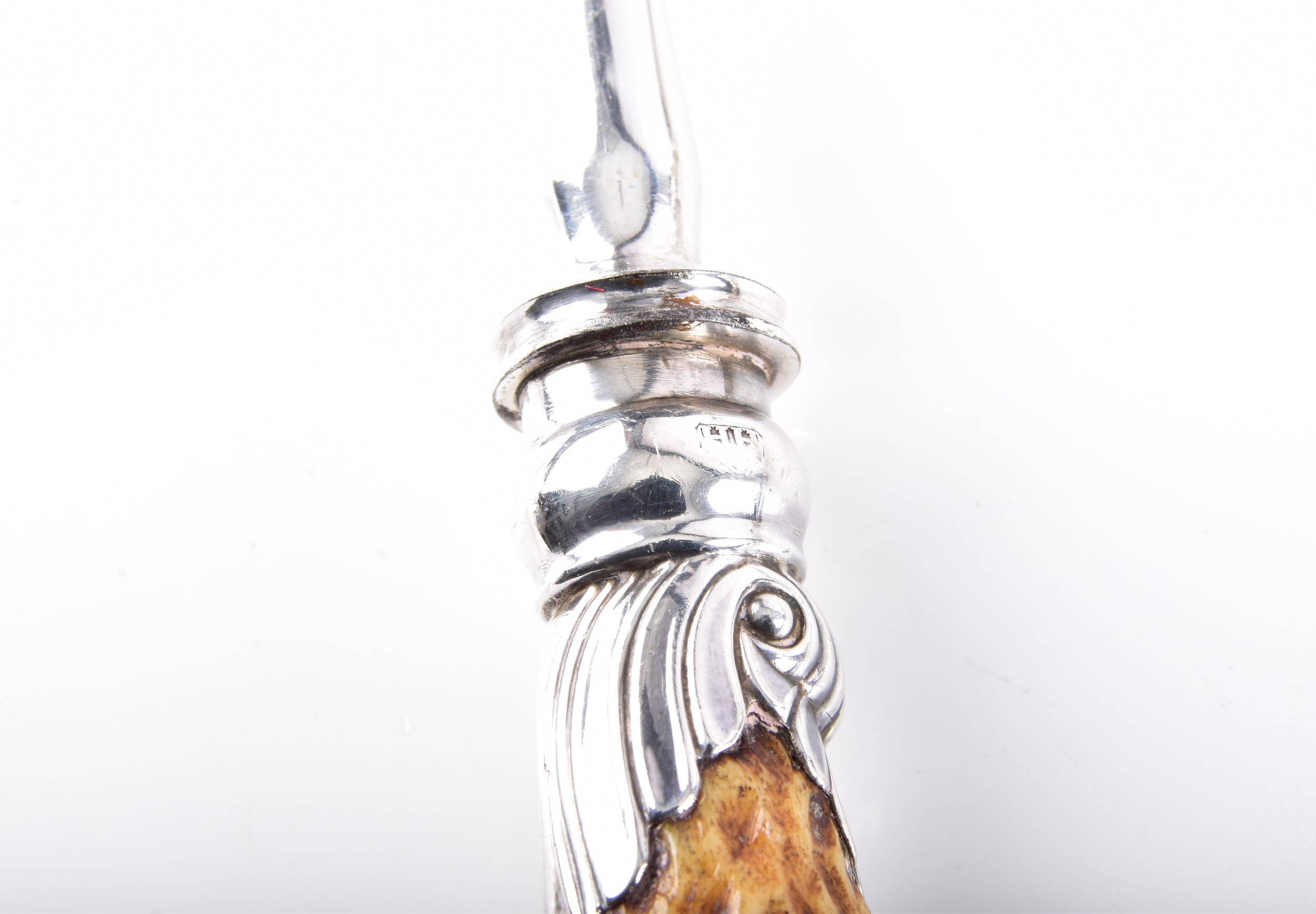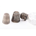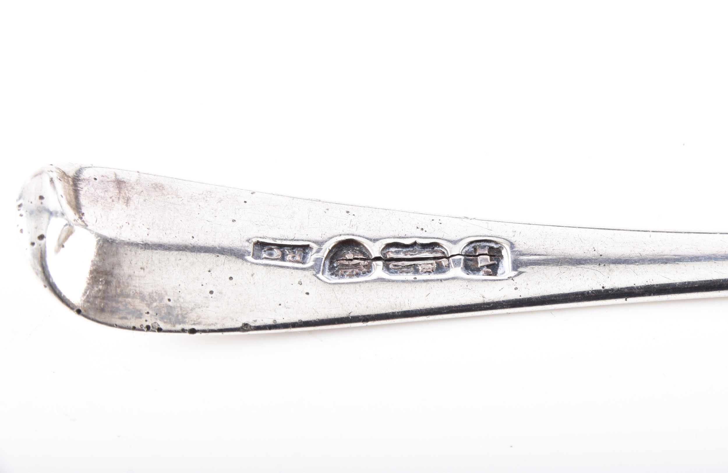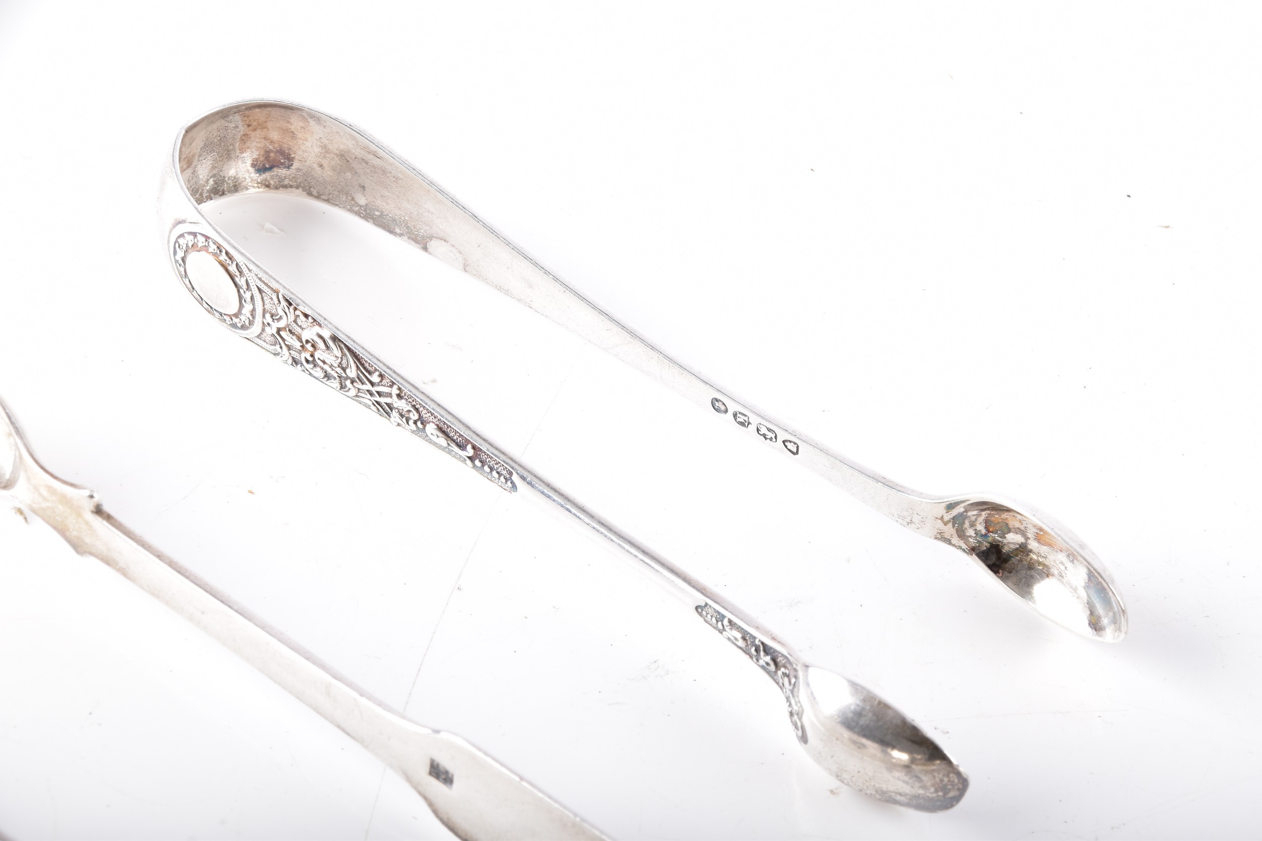 A group lot of assorted silver and other items, a pair of Victorian sugar tongs hallmarked for London 1885, a silver horn-handled stilton scoop, a George III sauce ladle hallmarked for London 1784, a George V silver thimble hallmarked for Birmingham 1931, a victorian silver brooch hallmarked for Chester 1887, an 800 silver thimble, a George V silver lidded scent bottle hallmarked for Birmingham 1911, a larger silver pair of sugar tongs, a silver cameo bracelet, together with a metal plaque and five coins in a container.