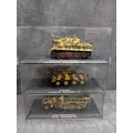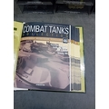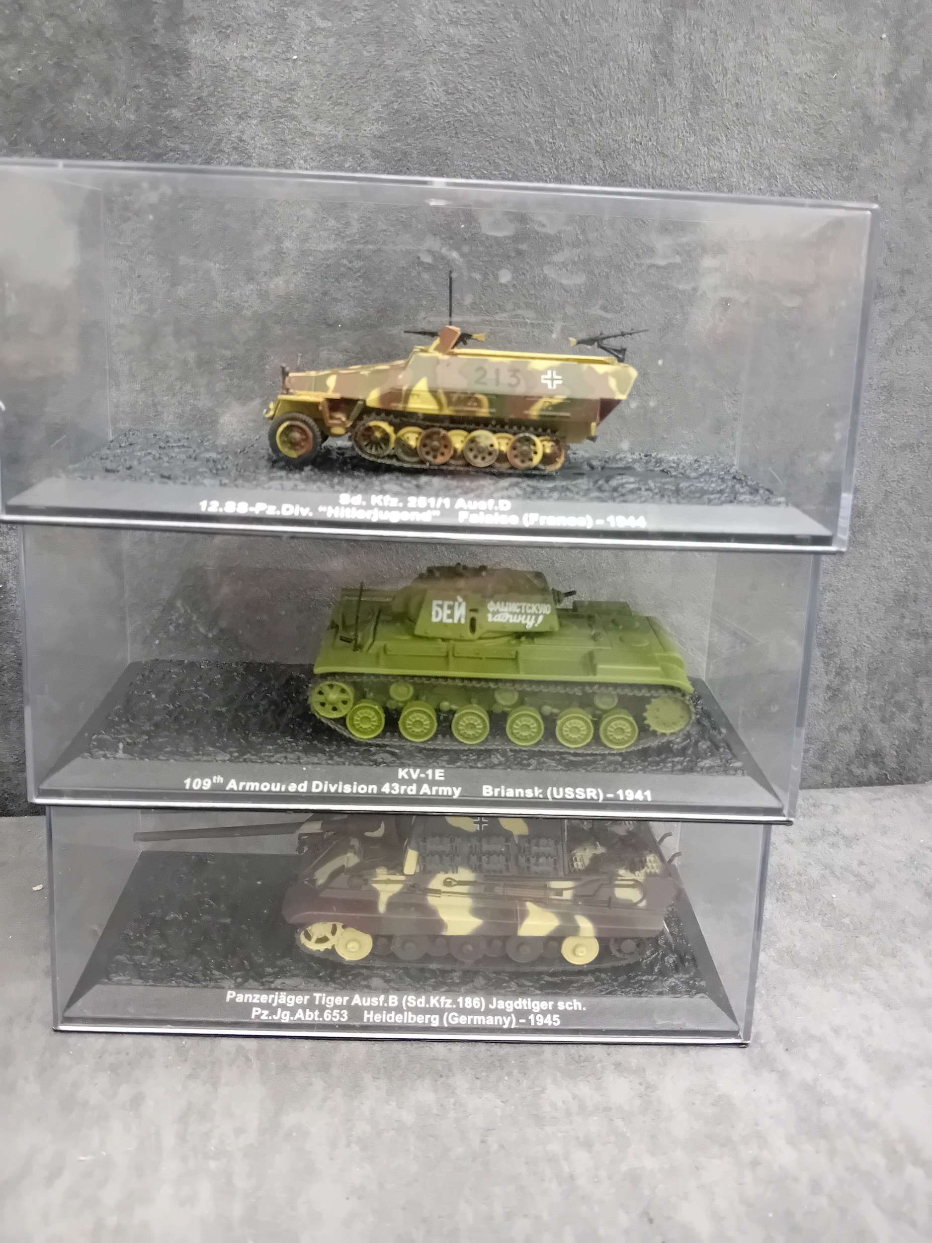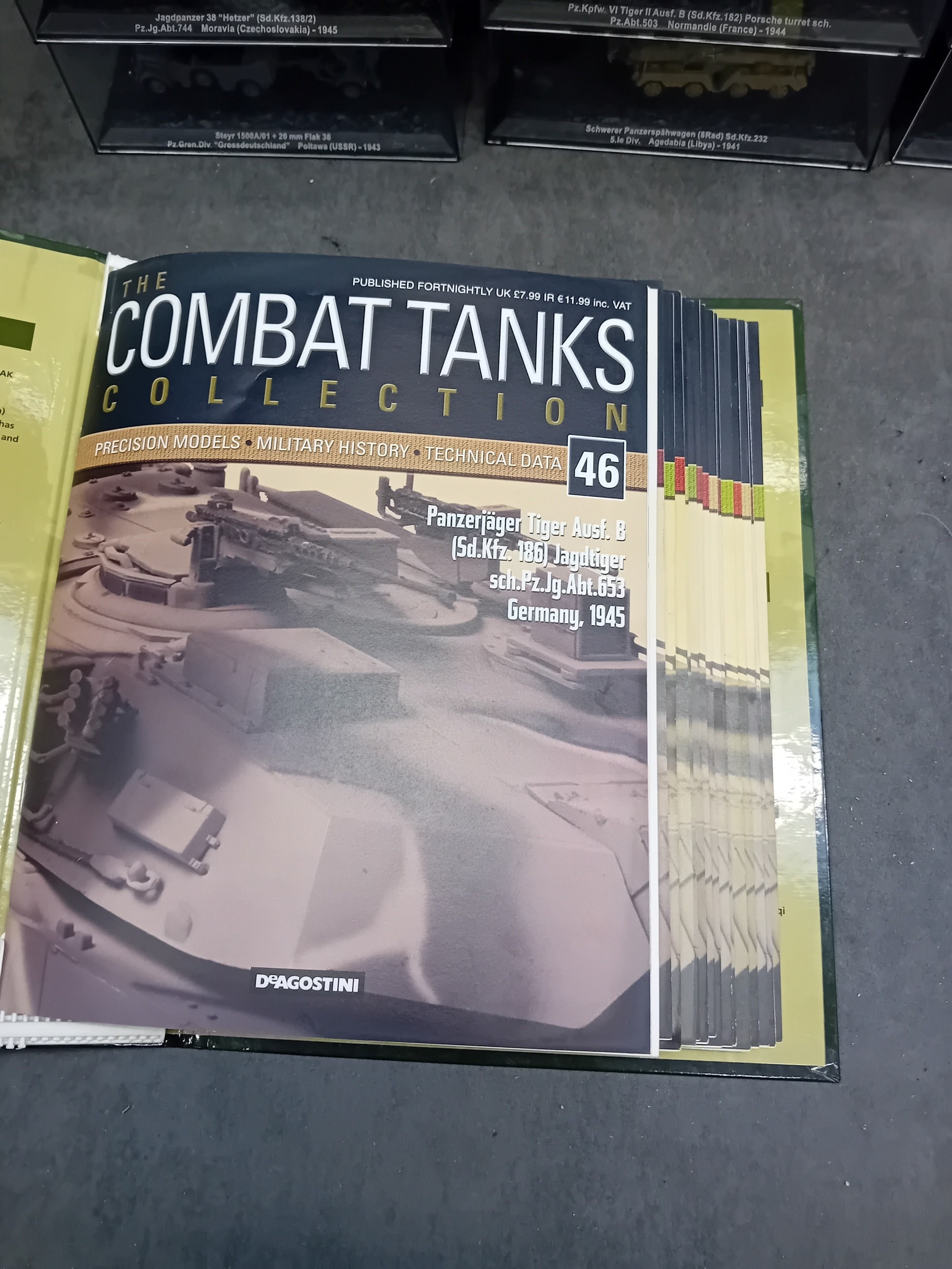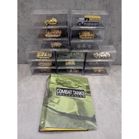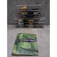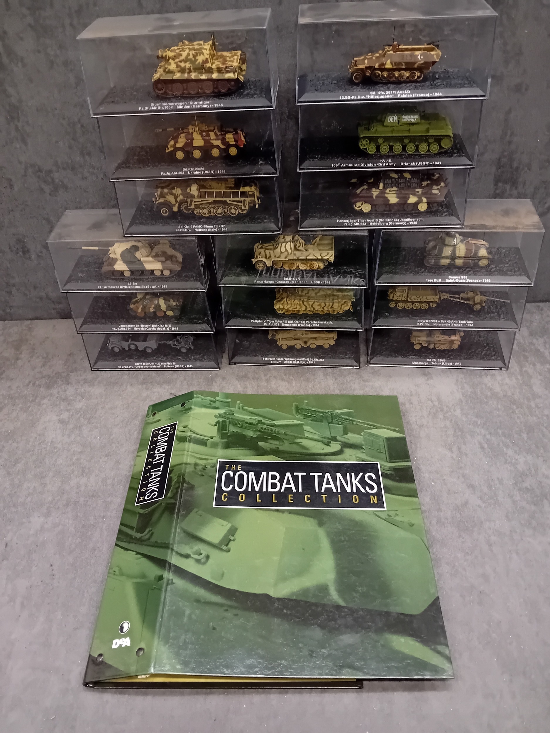 A collection of 15 DeAgostini 'The Combat Tanks Collection' miniature military vehicle models. The lot comprises 15 miniature military vehicle models, primarily tanks, self-propelled guns, and armored cars, each housed within a clear plastic display case atop a black base. Crafted from die-cast metal and plastic, these realistic scale models feature various camouflage paint schemes. Each display base includes a label identifying the specific vehicle, its unit, location, and a year, predominantly ranging from 1940 to 1945, with a few extending into the 1970s, indicating a focus on World War II and early Cold War periods. One Soviet KV-1E tank model clearly displays the Cyrillic text "ÐÐРФÐШÐСТСÐУЮ ÐÐÐÐÐУ!", which translates to "Strike the Fascist Viper!". Accompanying the models is a large, green-covered book titled "THE COMBAT TANKS COLLECTION" by D'Agostini, described as featuring "PRECISION MODELS ⢠MILITARY HISTORY ⢠TECHNICAL DATA" and marked "46" on its spine.