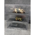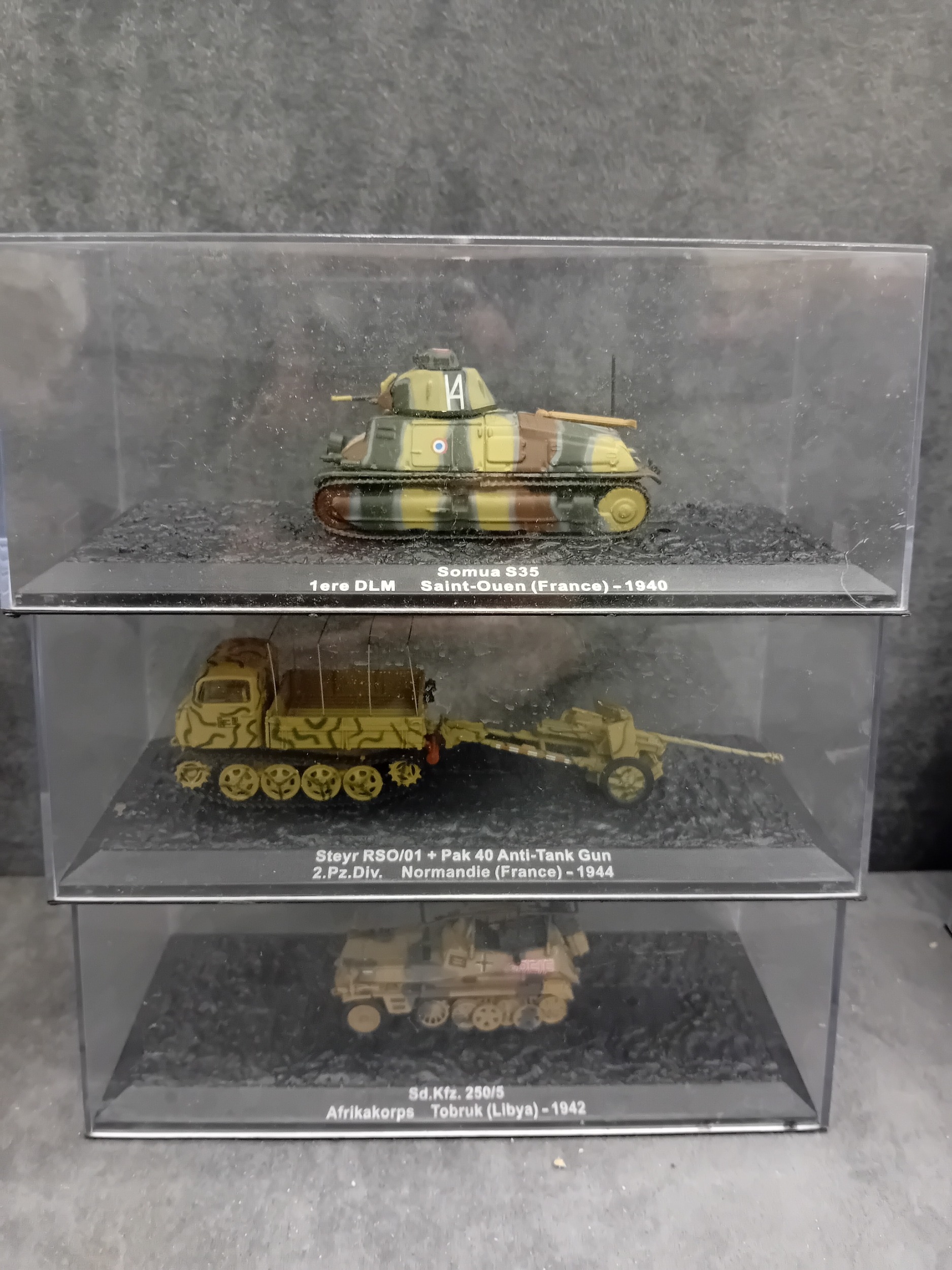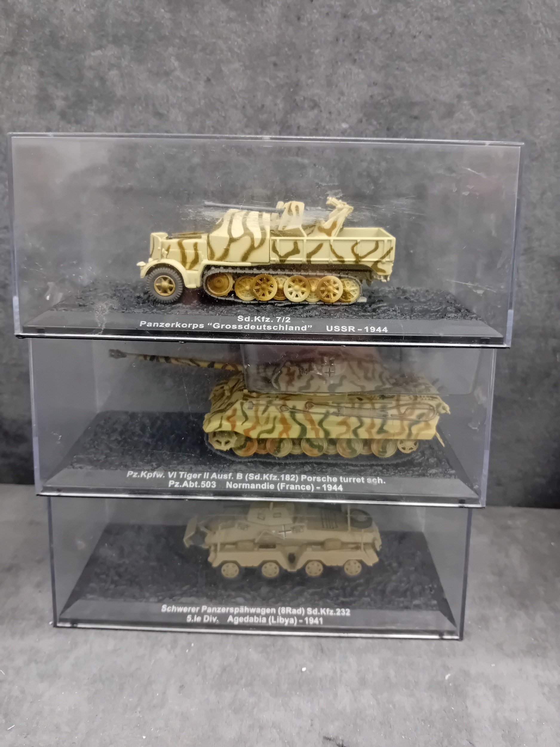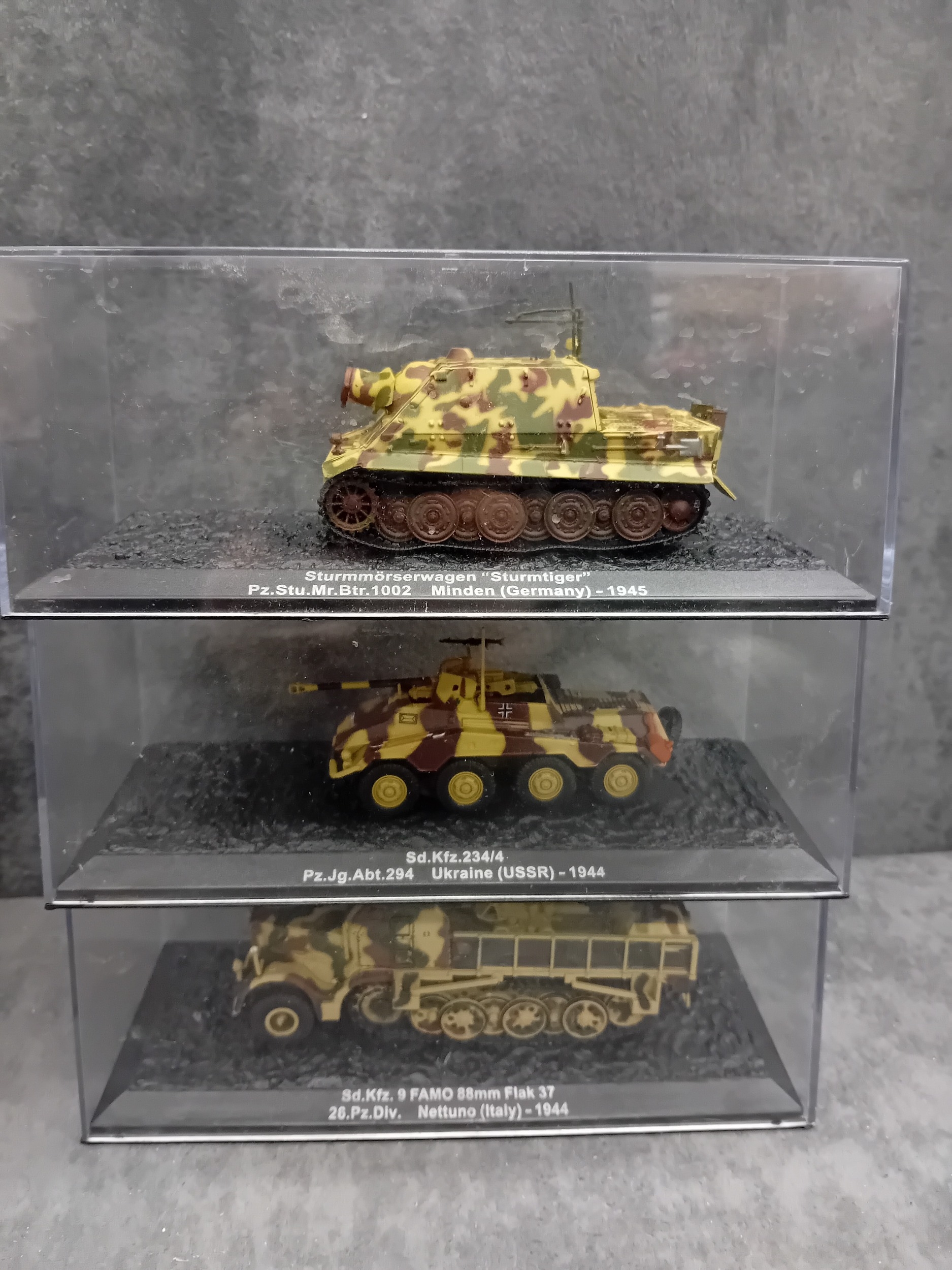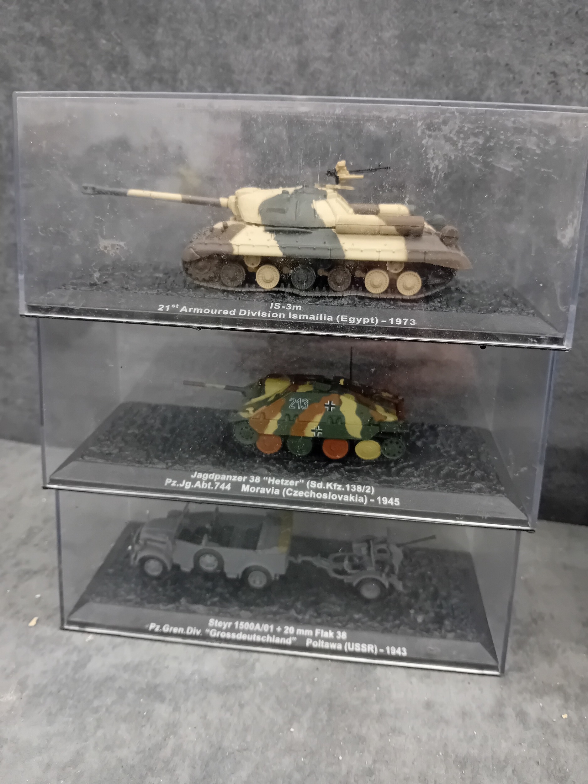 A collection of 15 DeAgostini 'The Combat Tanks Collection' miniature military vehicle models. The lot comprises 15 miniature military vehicle models, primarily tanks, self-propelled guns, and armored cars, each housed within a clear plastic display case atop a black base. Crafted from die-cast metal and plastic, these realistic scale models feature various camouflage paint schemes. Each display base includes a label identifying the specific vehicle, its unit, location, and a year, predominantly ranging from 1940 to 1945, with a few extending into the 1970s, indicating a focus on World War II and early Cold War periods. One Soviet KV-1E tank model clearly displays the Cyrillic text "ÐÐРФÐШÐСТСÐУЮ ÐÐÐÐÐУ!", which translates to "Strike the Fascist Viper!". Accompanying the models is a large, green-covered book titled "THE COMBAT TANKS COLLECTION" by D'Agostini, described as featuring "PRECISION MODELS ⢠MILITARY HISTORY ⢠TECHNICAL DATA" and marked "46" on its spine.