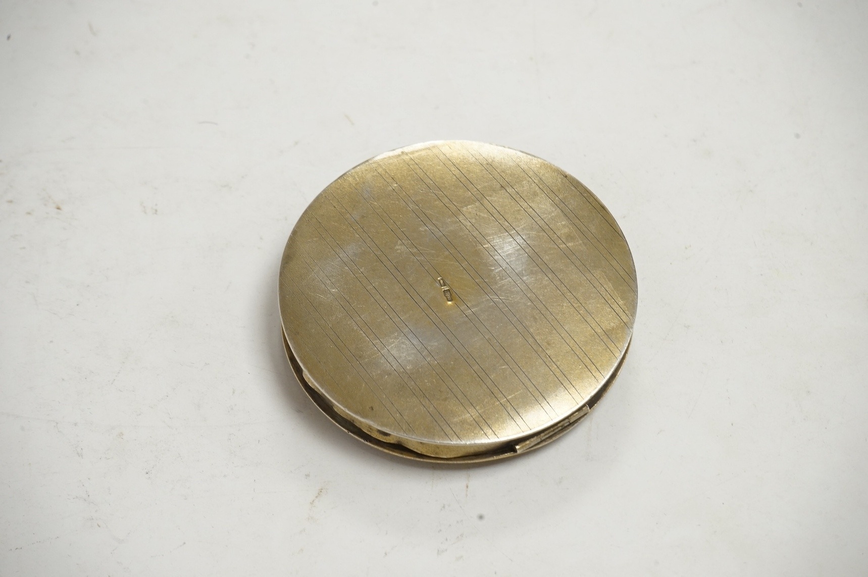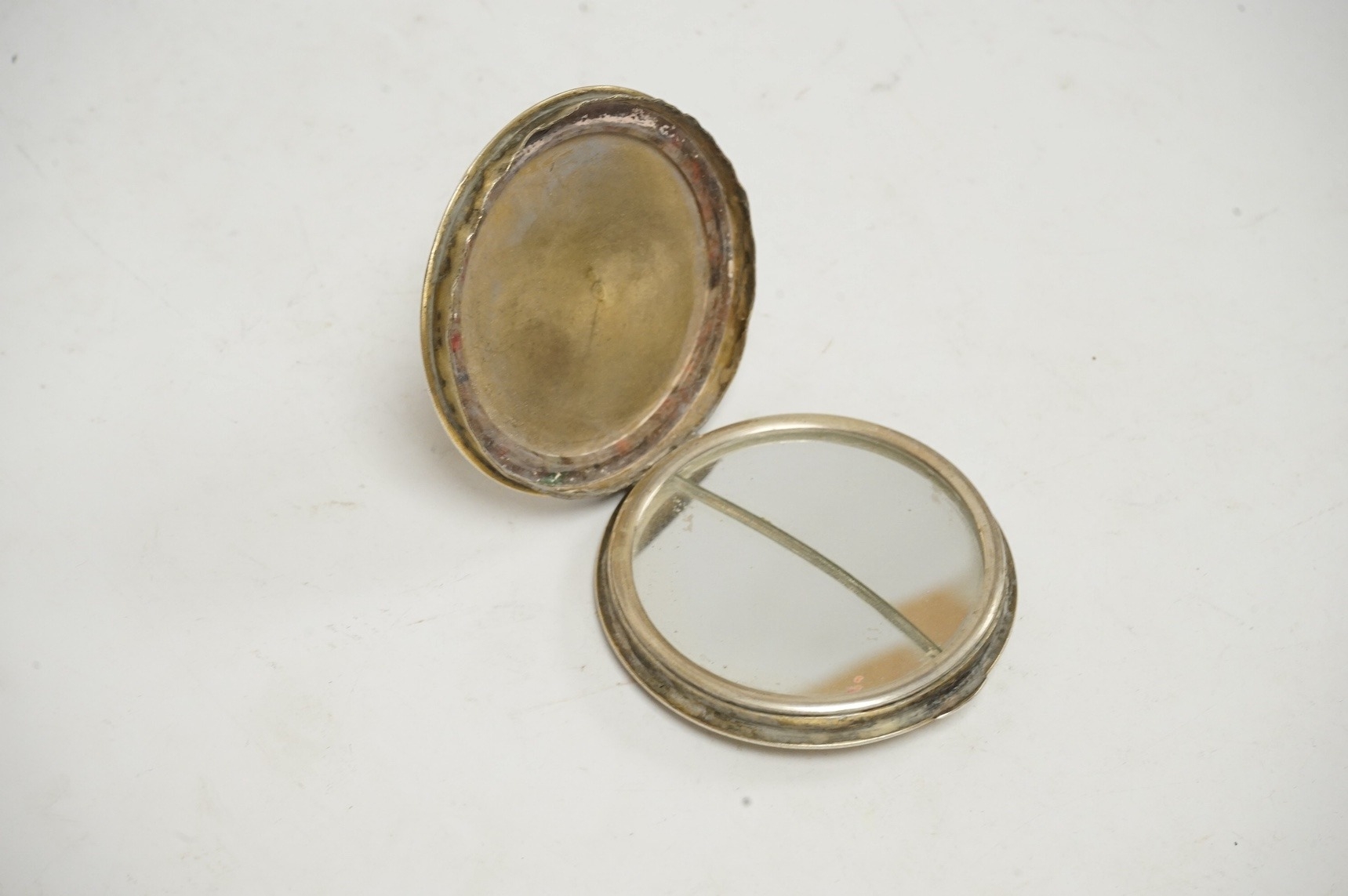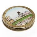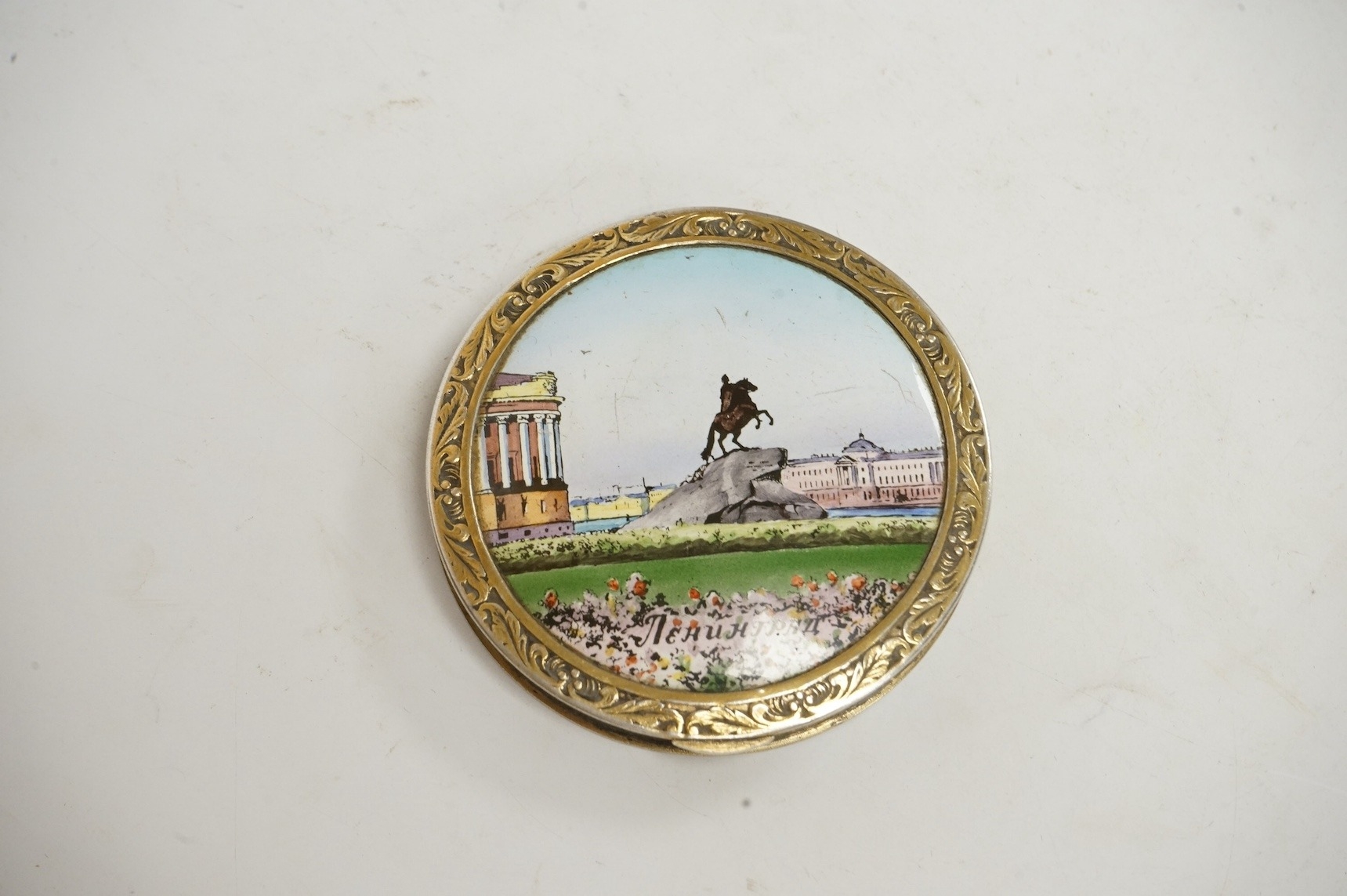 An early to mid 20th century Soviet Union 875 gilt white metal and enamel circular compact, 1927-1958 kokoshnic mark, the enamelled cover depicting the Bronze Horseman statue in St. Petersburg and inscribed Leningrad in cyrillic, diameter 68mm. Condition - poor