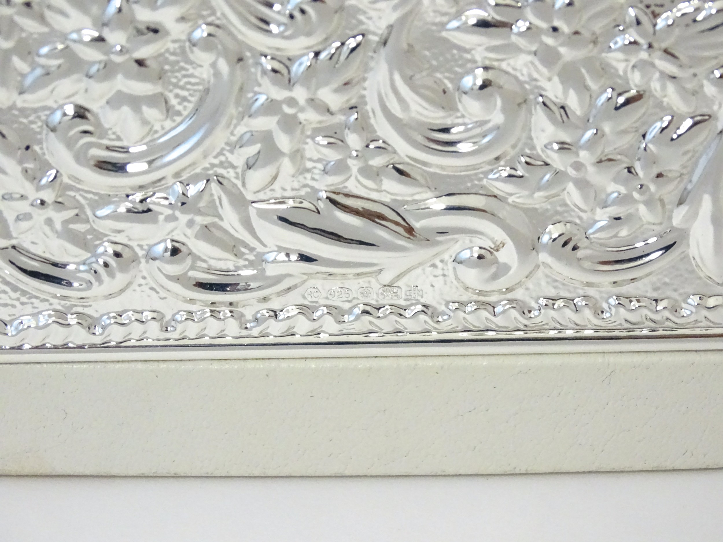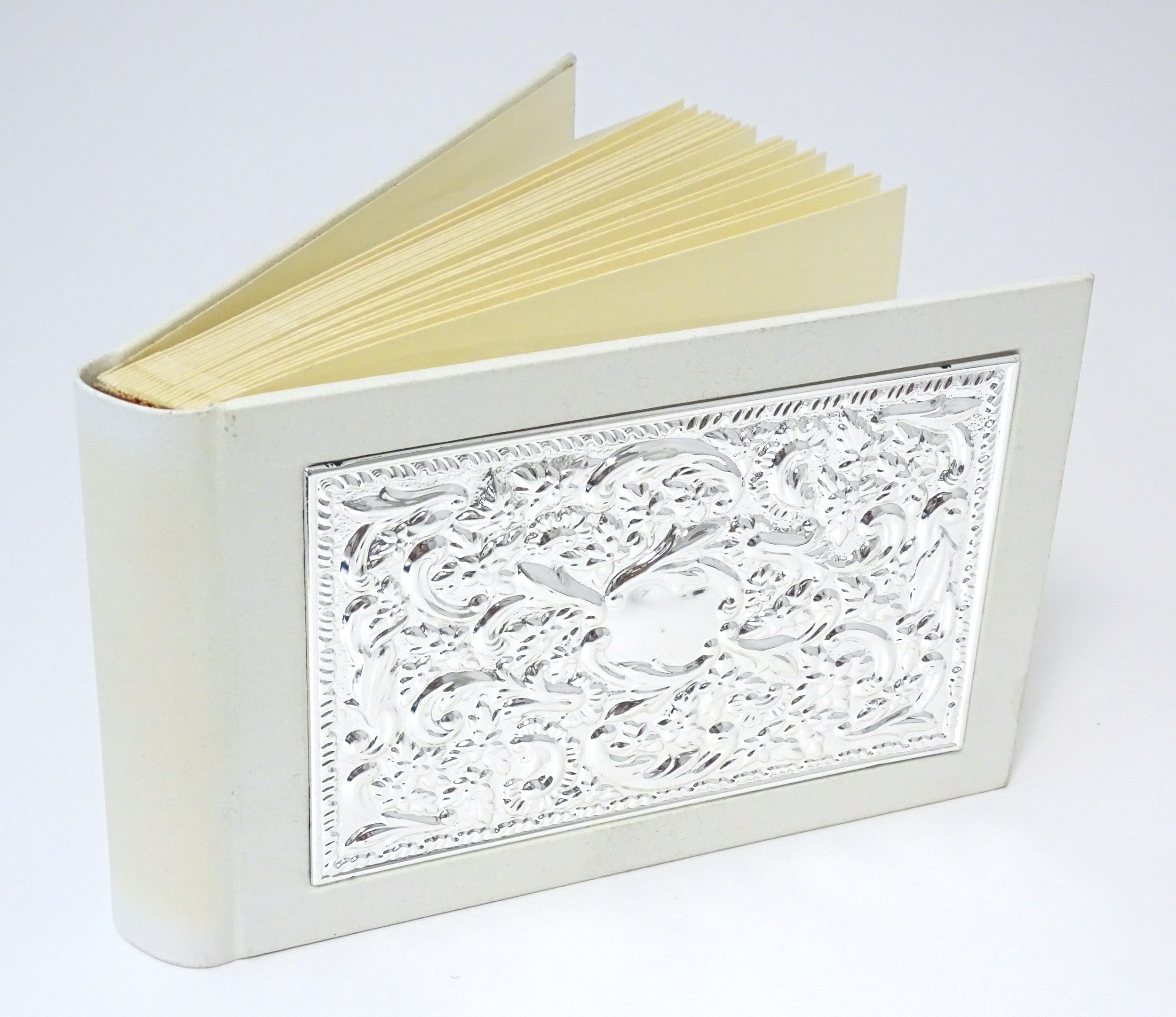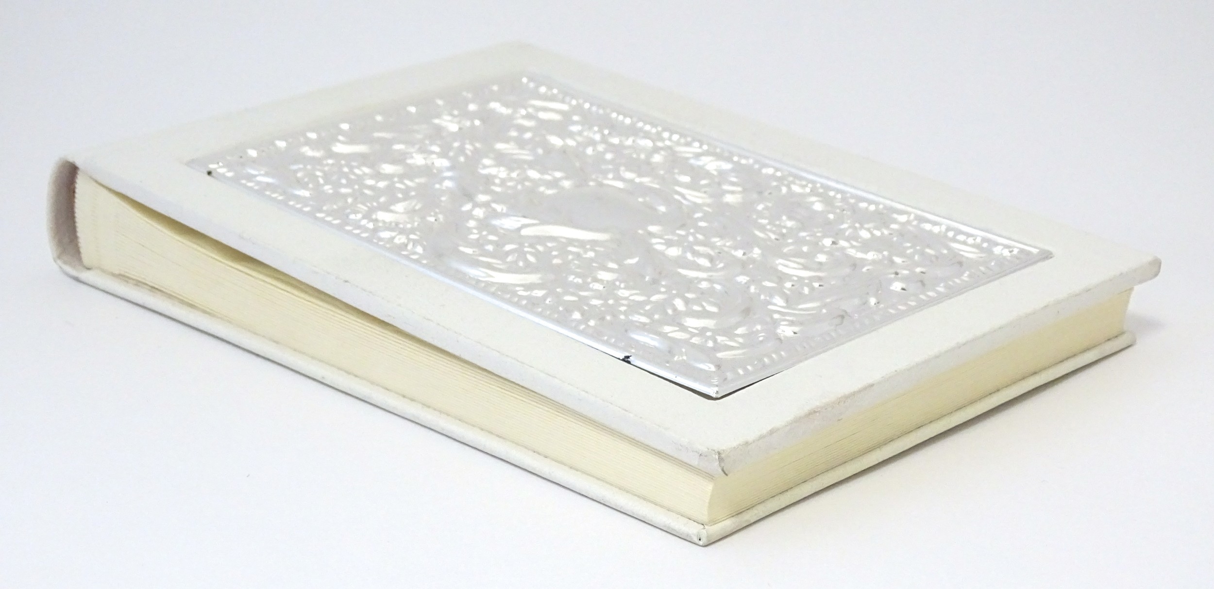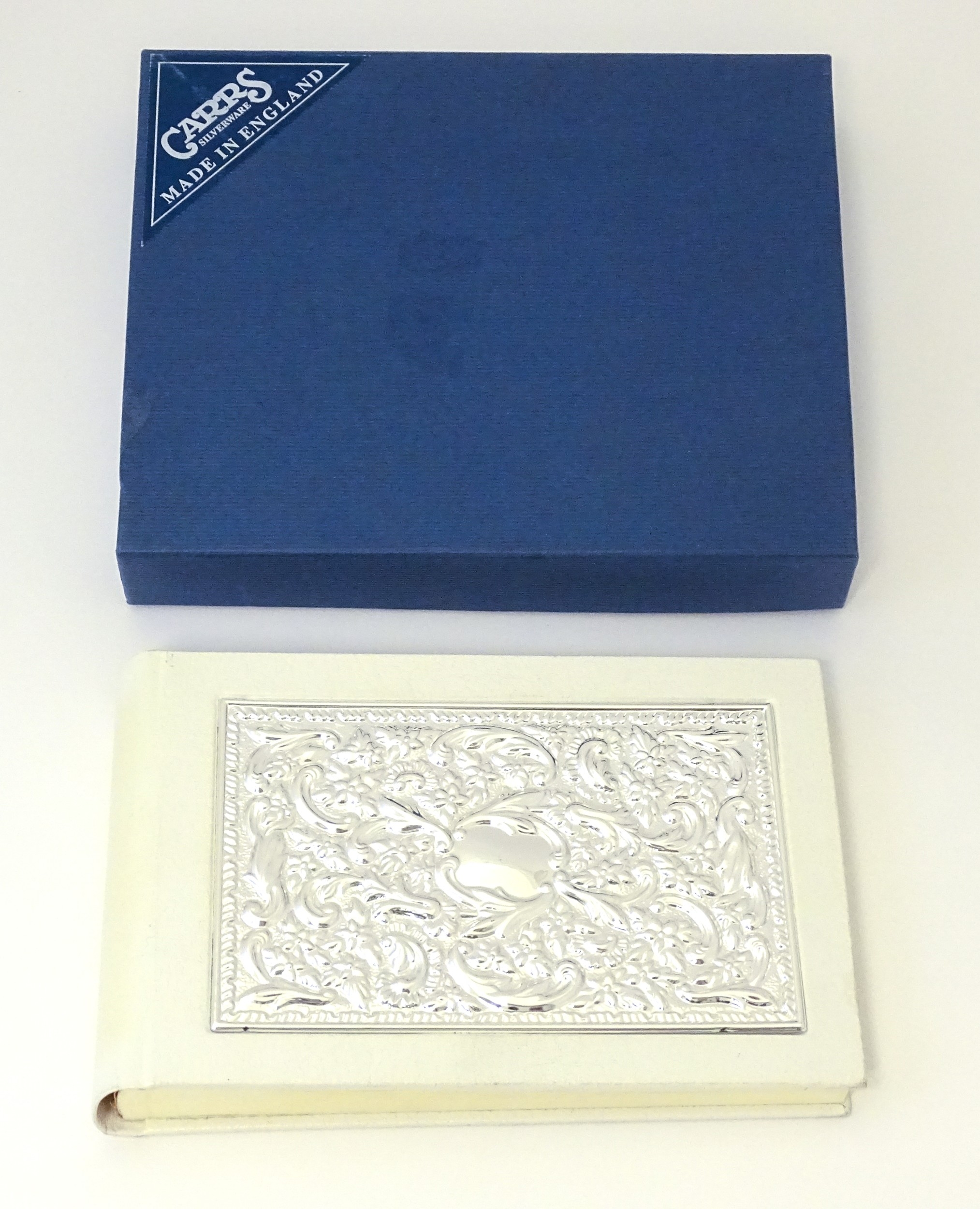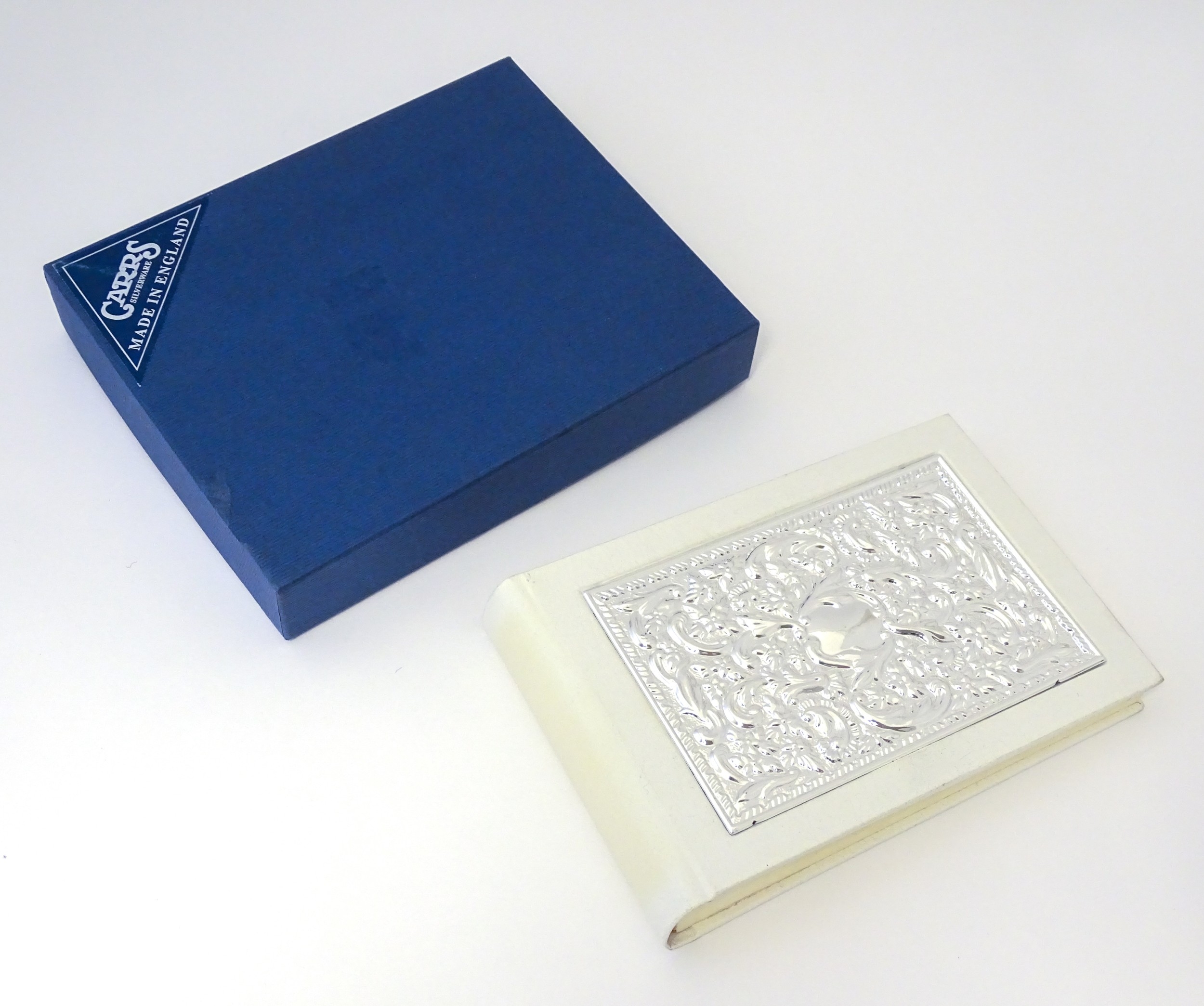 A photograph album with embossed silver mount hallmarked Sheffield 2000, maker Carrs of Sheffield. Boxed. Approx. 7 1/2"wide