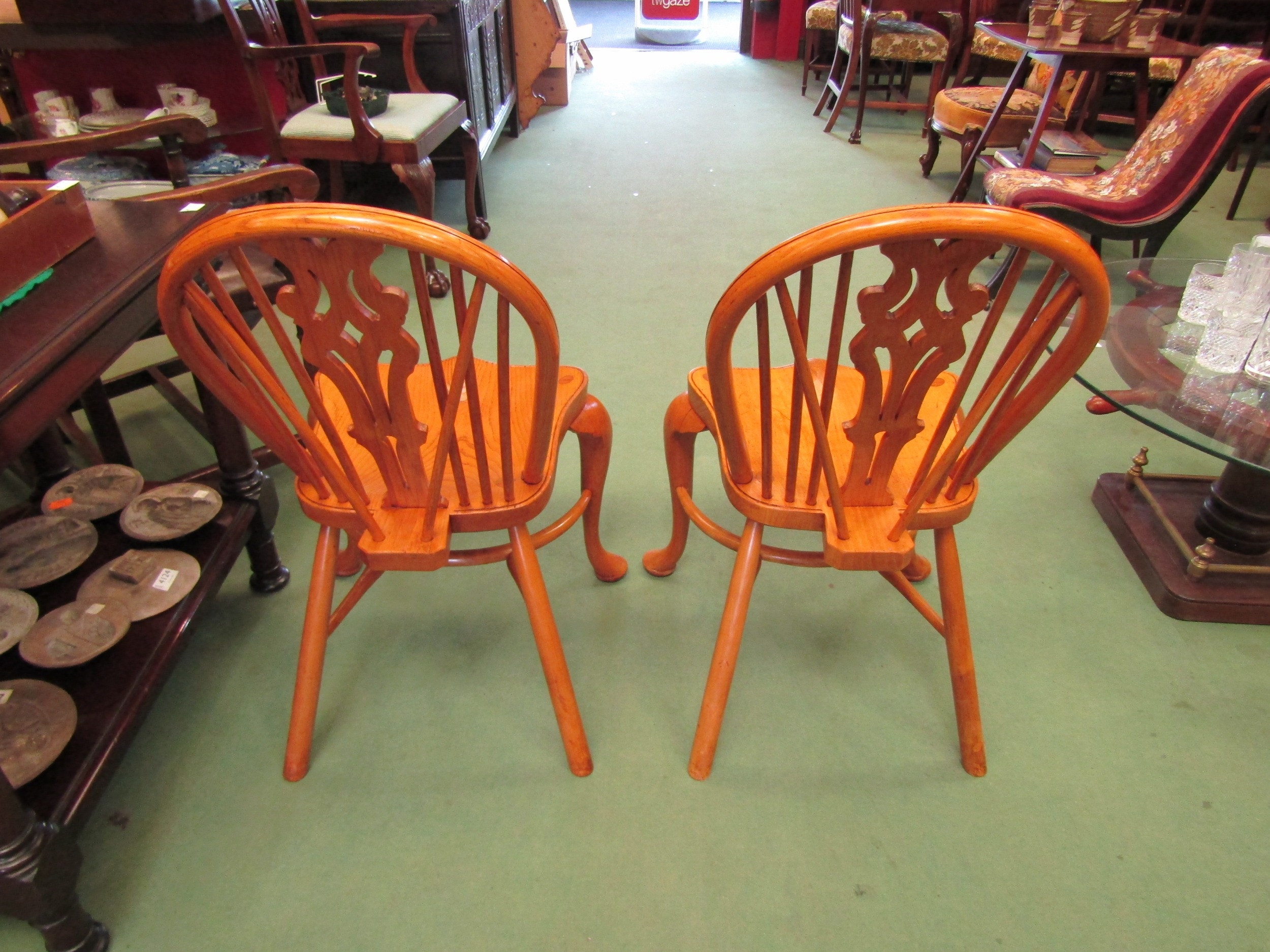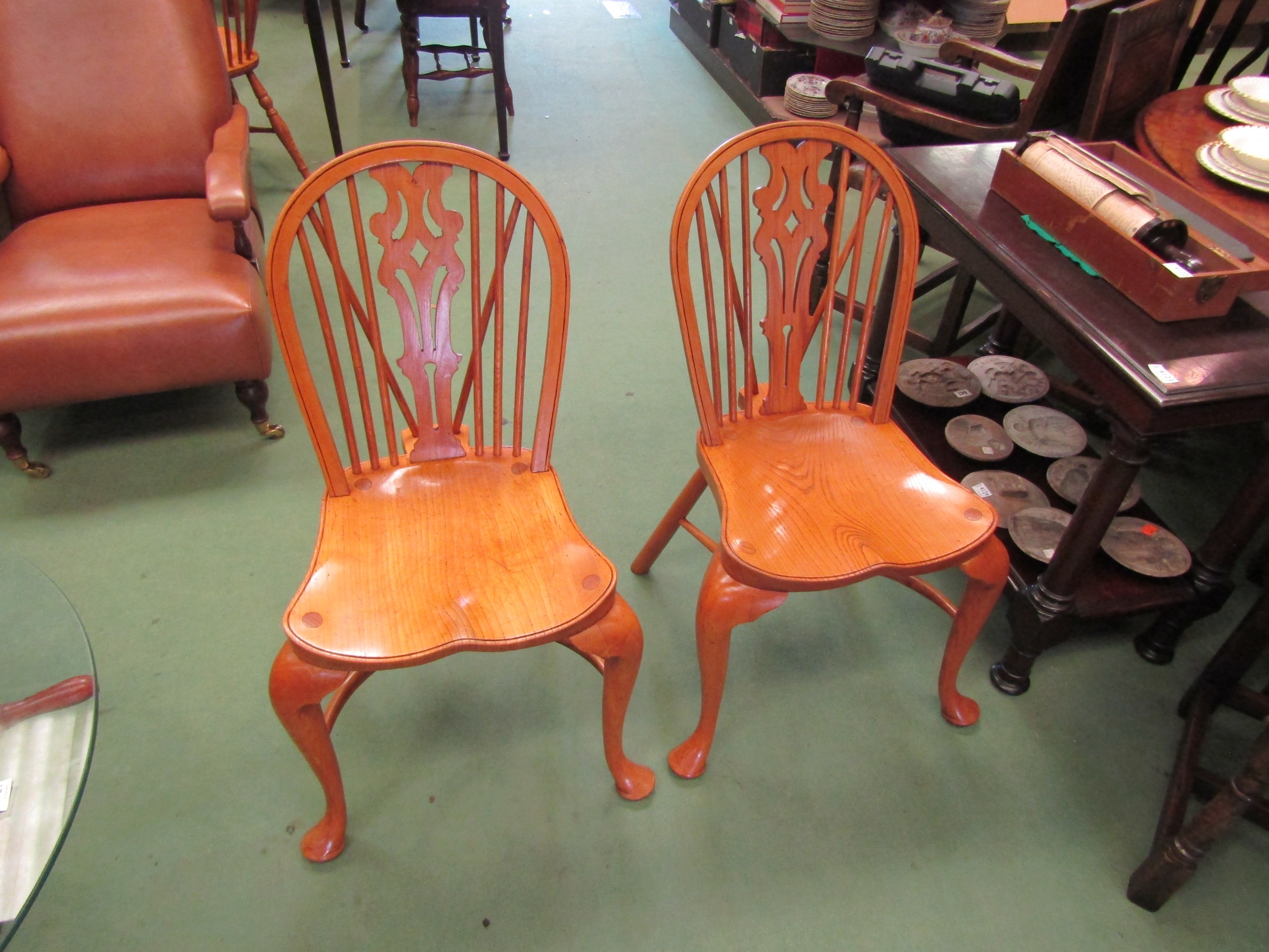 A bespoke pair of 19th Century style elm and oak hoop back windsor chairs on pad foot cabriole fore legs united by crinoline stretchers