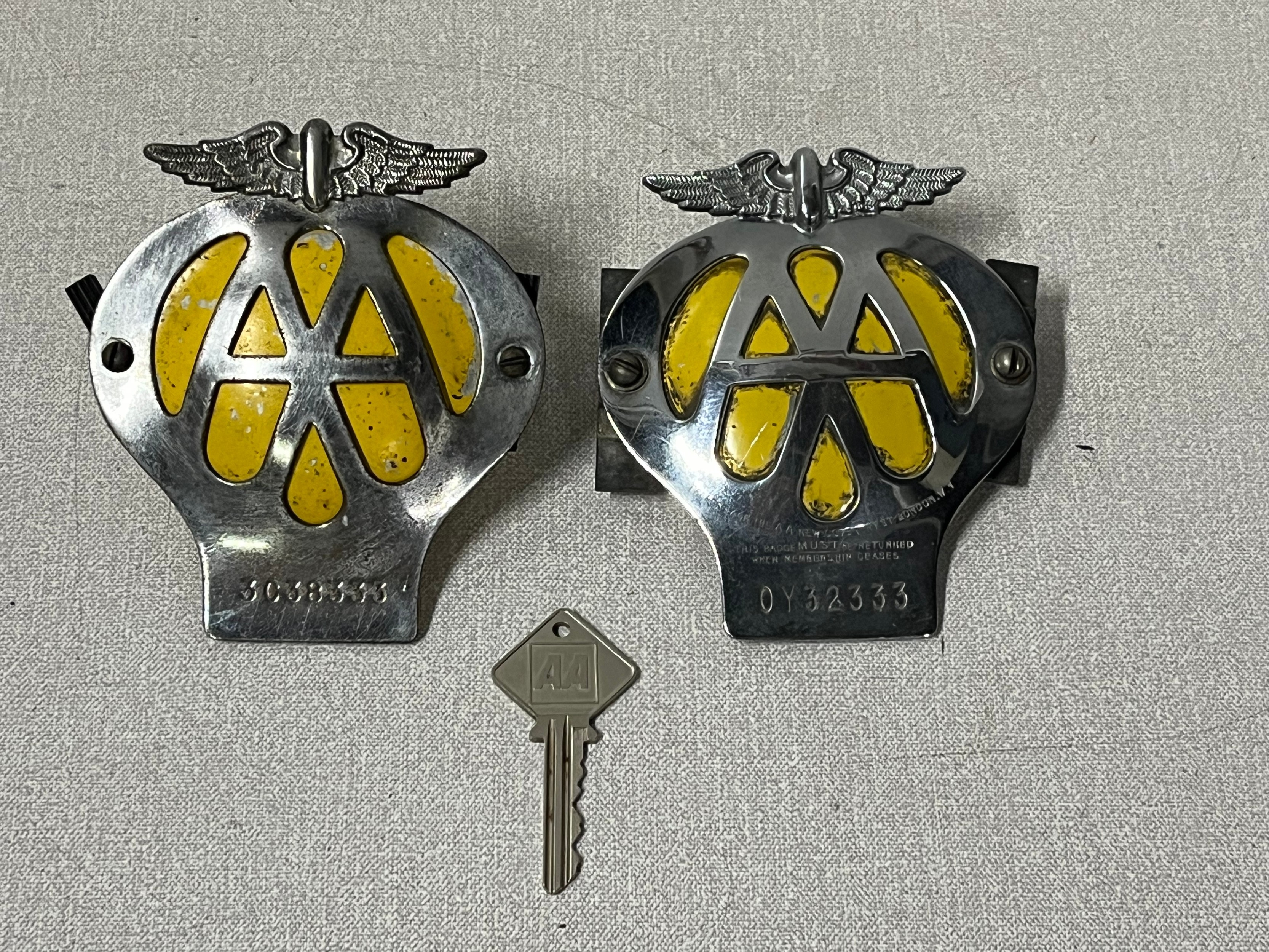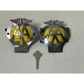 2 vintage aa badges & key