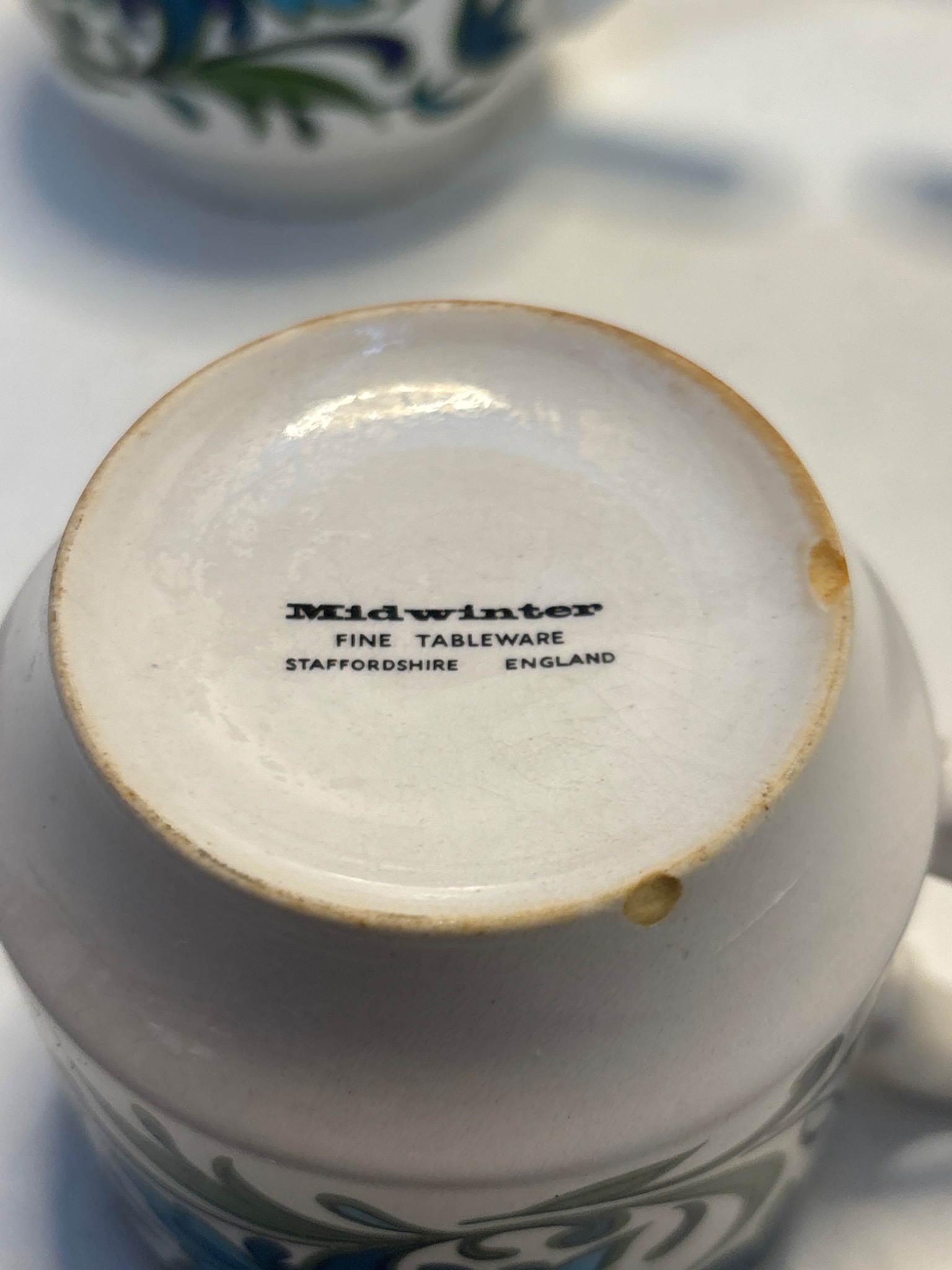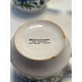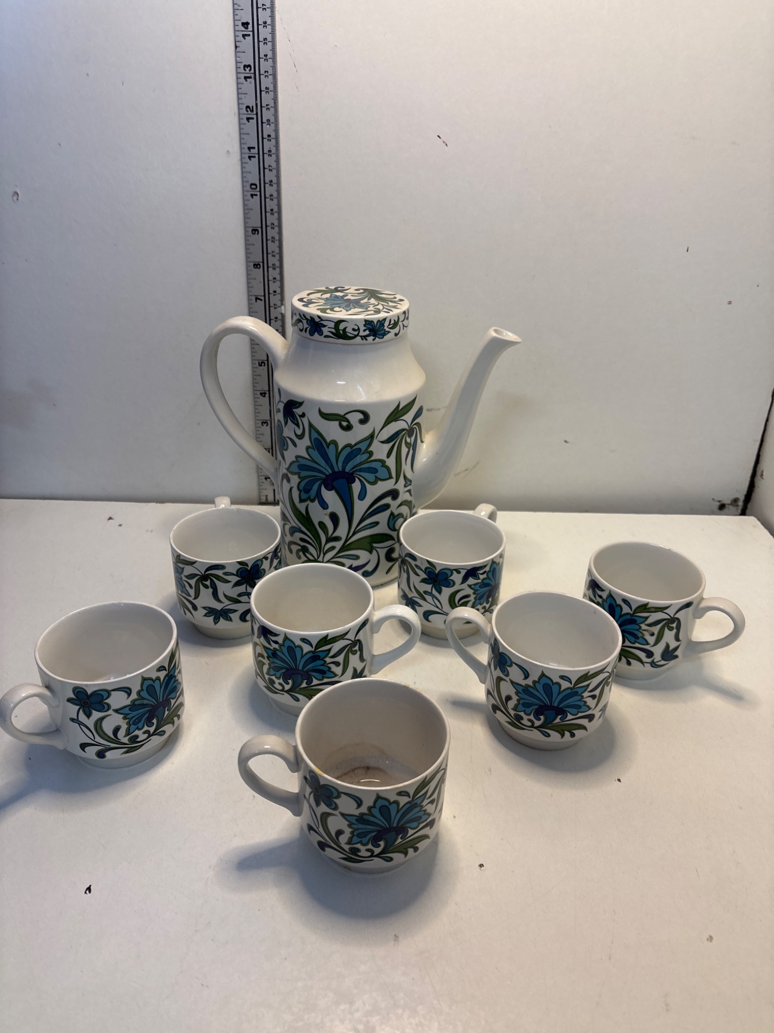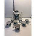 Midwinter fine tableware tea set from Staffordshire, England, includes one teapot and six matching cups, decorated with blue floral motifs not postable.