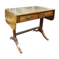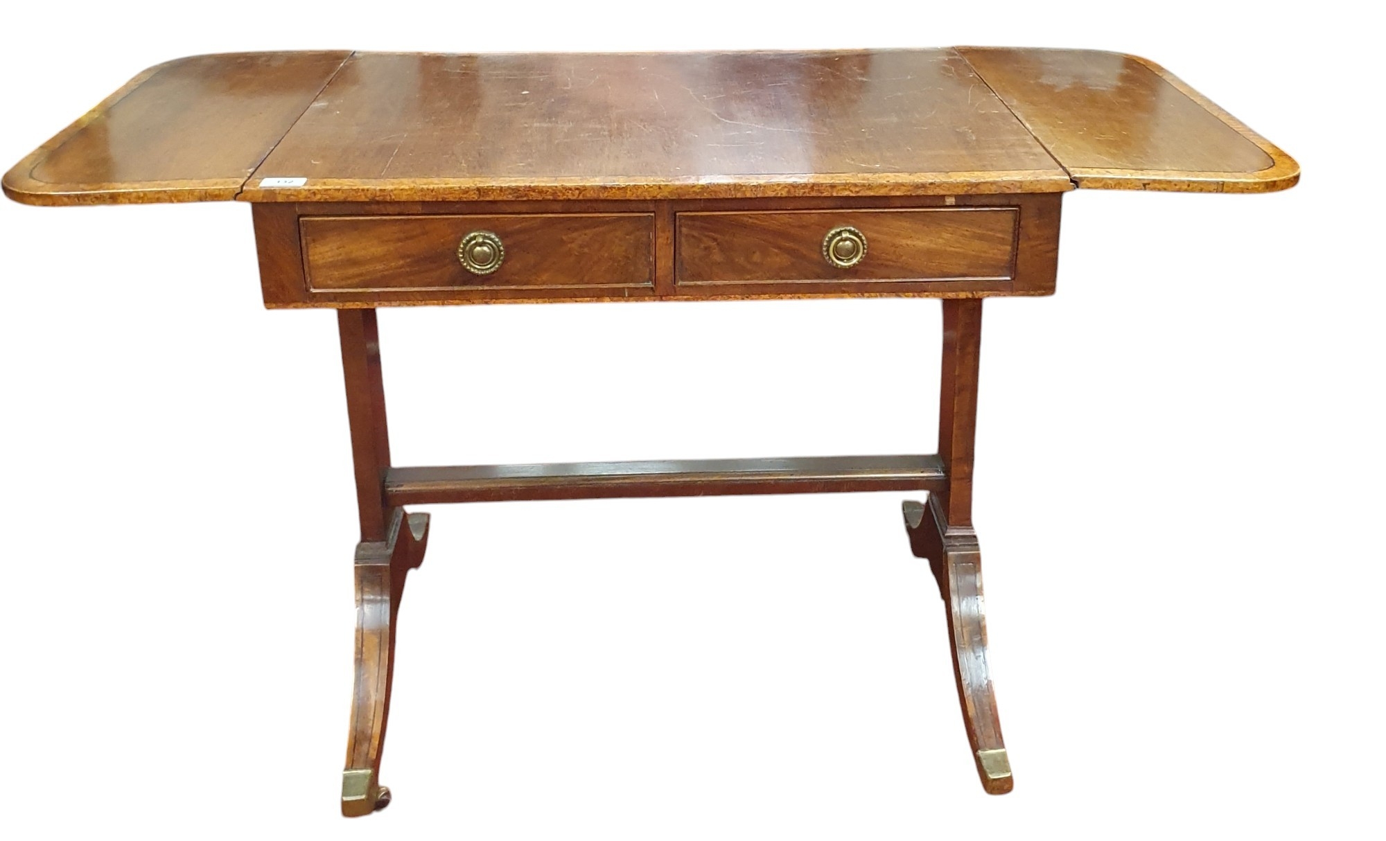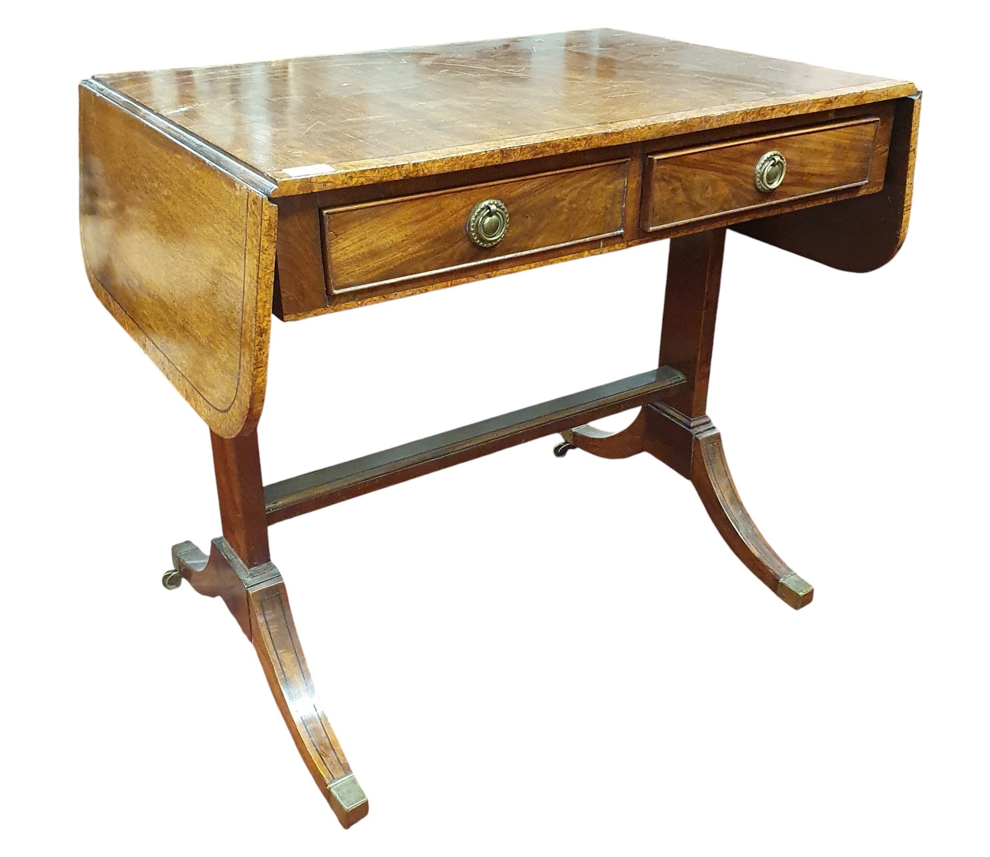 A 19th Century Mahogany and Veneered Sofa Table of neat proportions with twin frieze drawers on splayed legs with brass castors. 77 x 104 x H 74 cm approx.