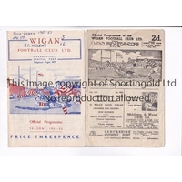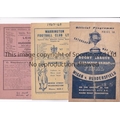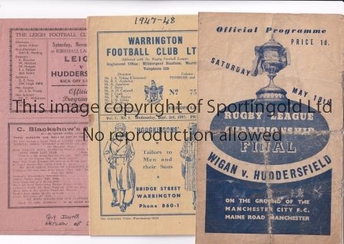 RUGBY LEAGUE PROGRAMMES Three programmes: 1946 Championship Final at Manchester City FC, Wigan v Huddersfield, heavily folded in four and worn, Warrington v Wigan 3/9/1947, season written on the cover, staple rusted away, team changes and scores entered and Leigh v Huddersfield 25/11/1950, writing on the cover, team changes and scores entered. Poor to fair