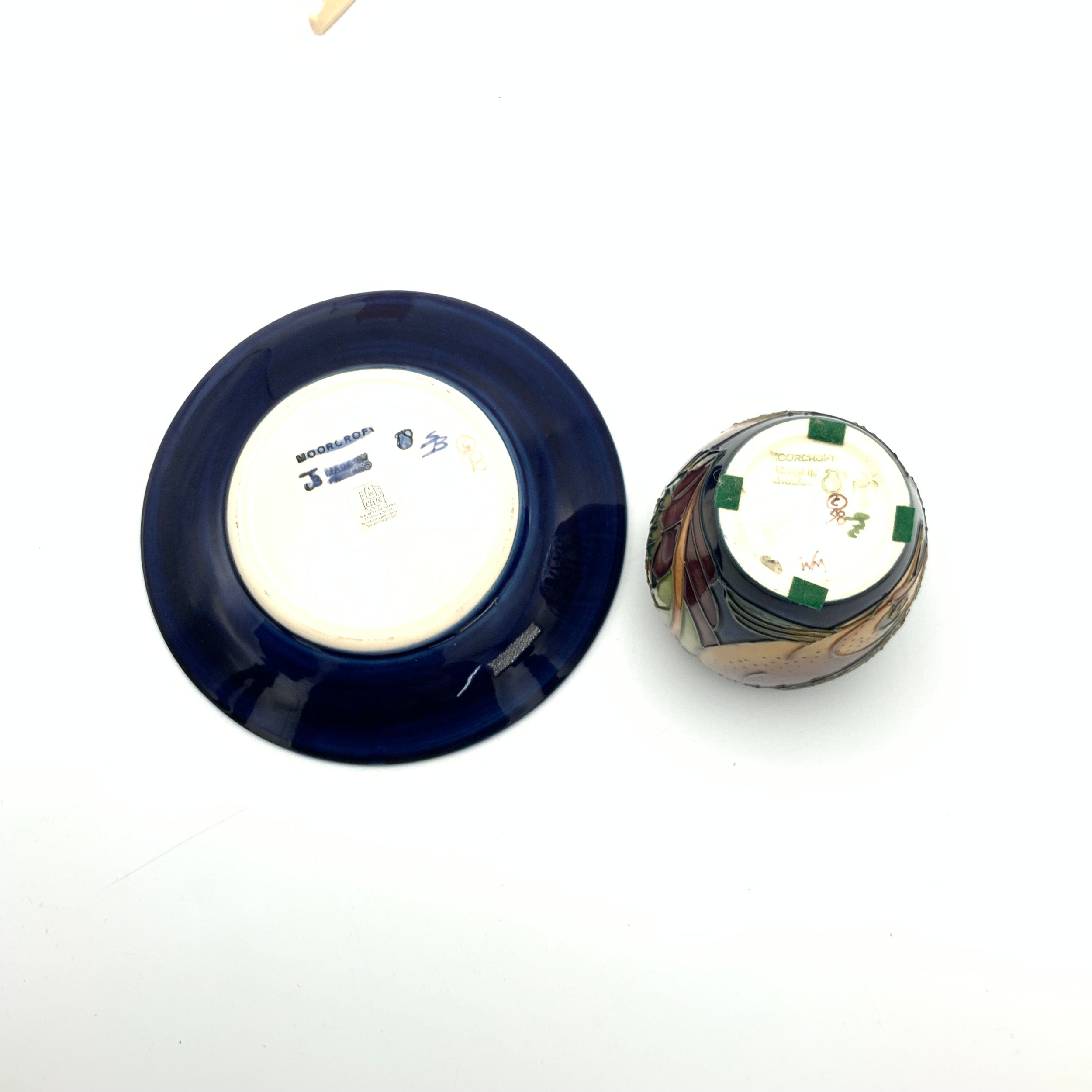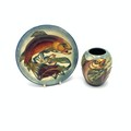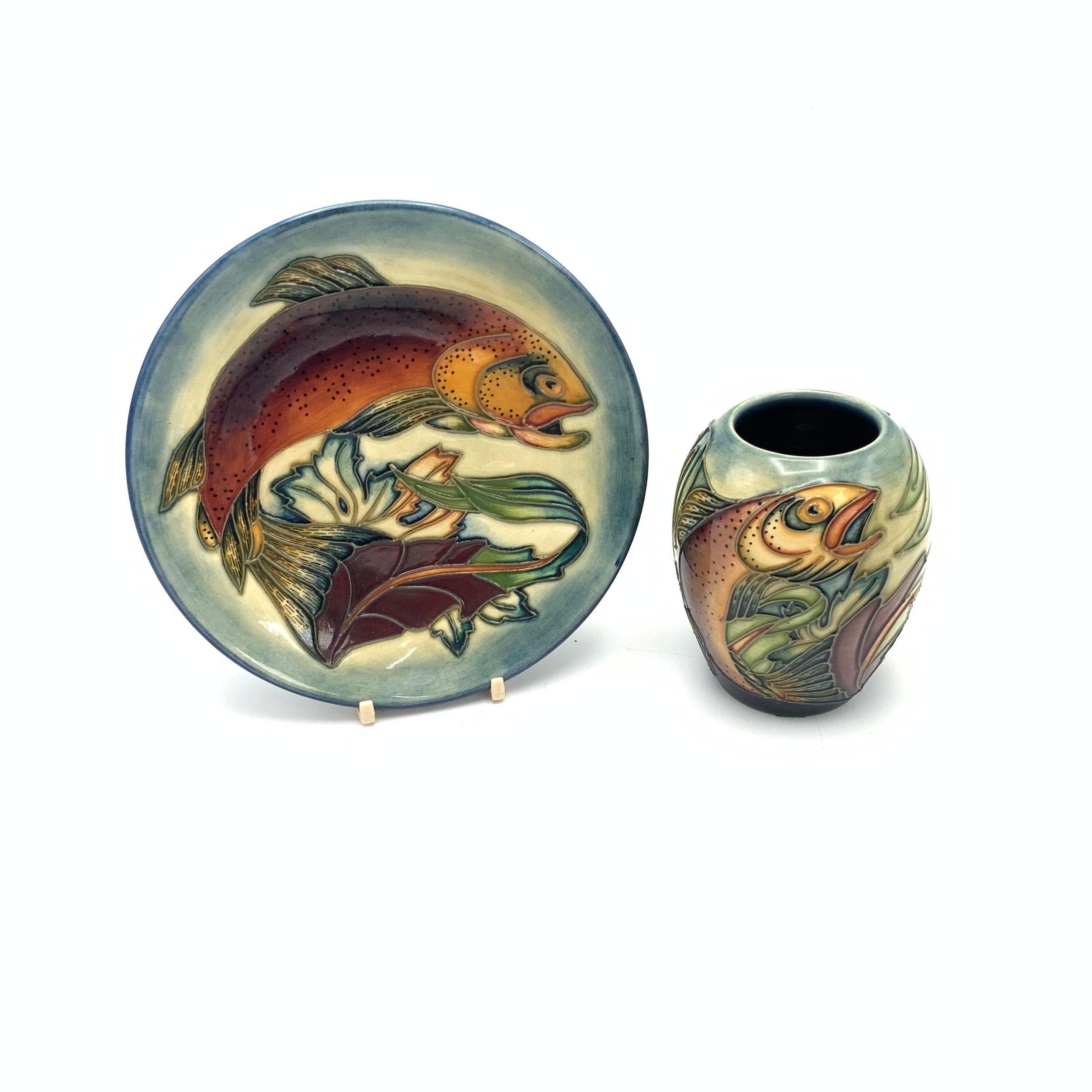 Moorcroft Trout pattern Philip Gibson plate and a Philip Gibson Trout vase, stamped Moorcroft to base and signed to base. Vase height 10cm, plate diameter 16cm.