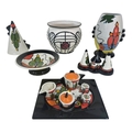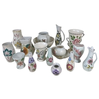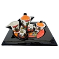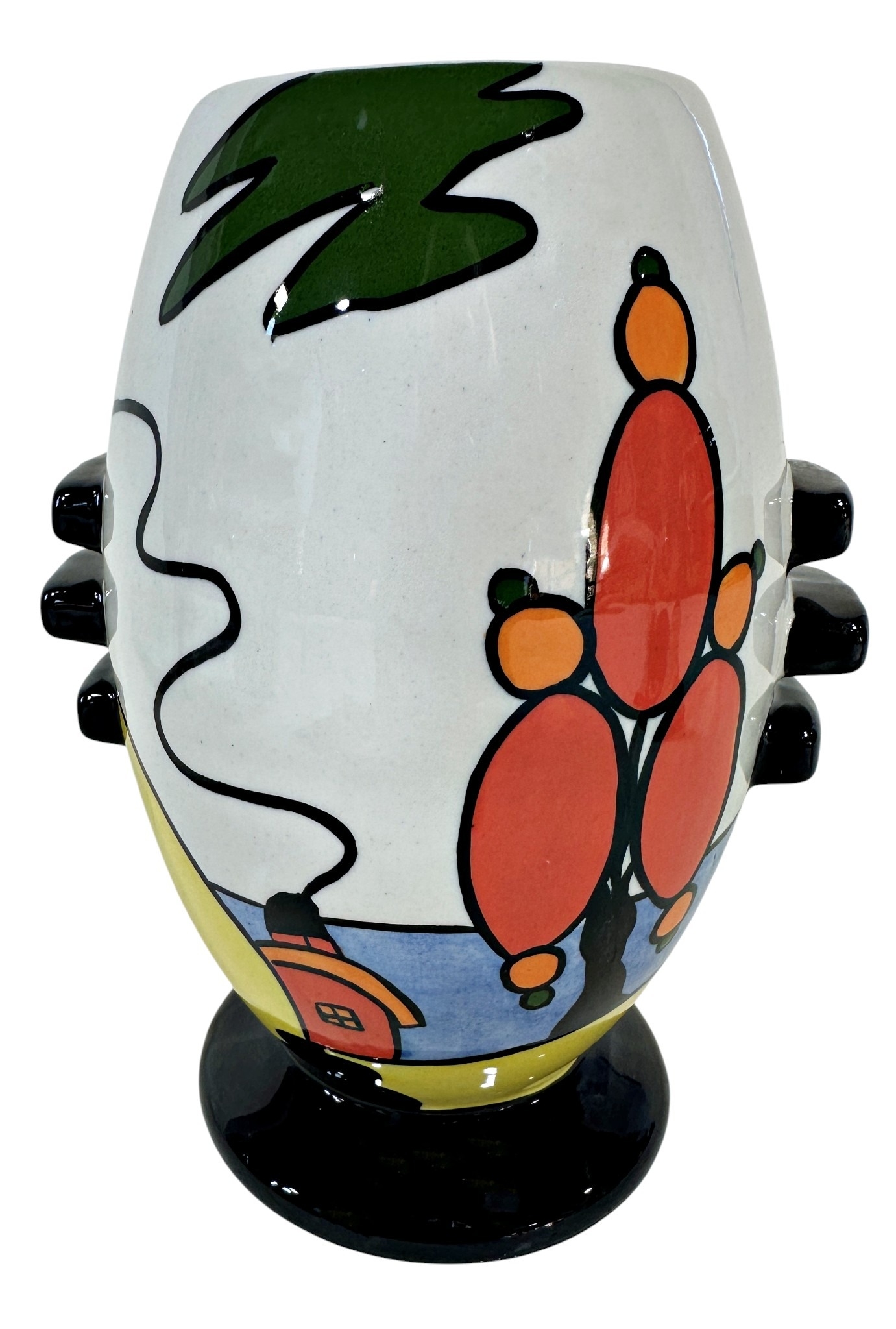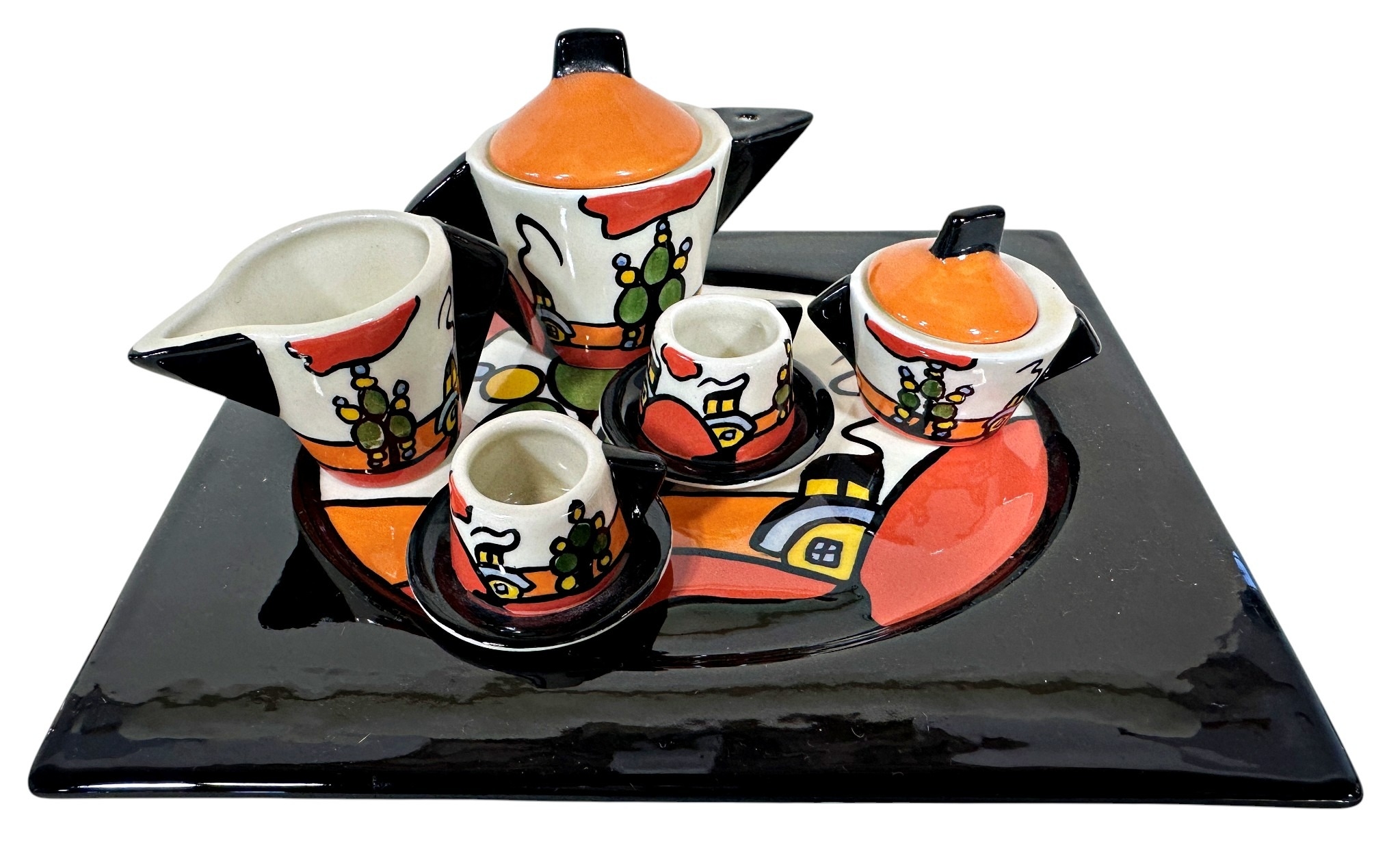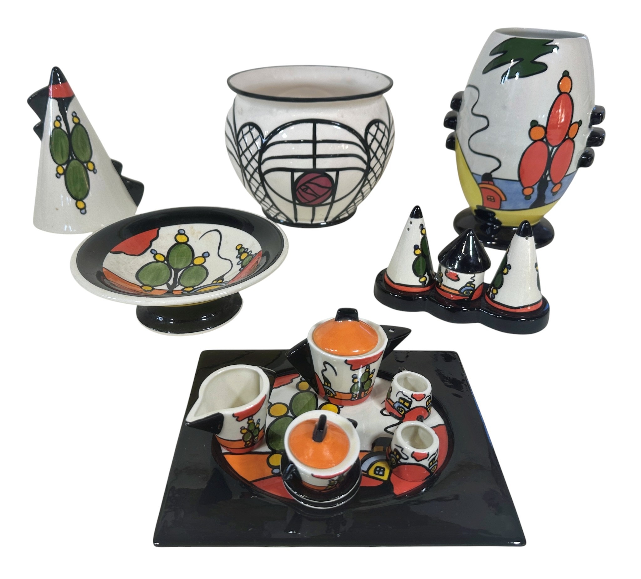 Lorna Bailey Old Ellgreave pottery in the Marshland cottage colourway, comprising: oviform vase, flat-backed wall pocket, condiment set, small tazza, and miniature tea set (5)