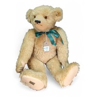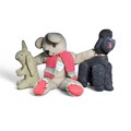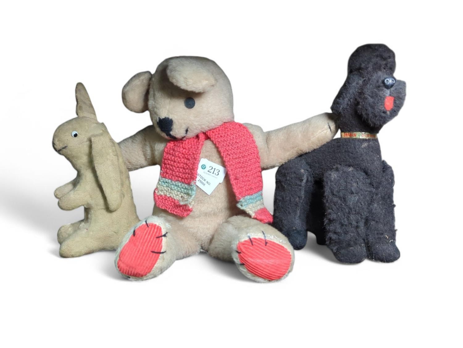 Three teddies, circa 1950's; to include a rabbit, poodle and teddy bear wearing knitted scarf ht. 44cm