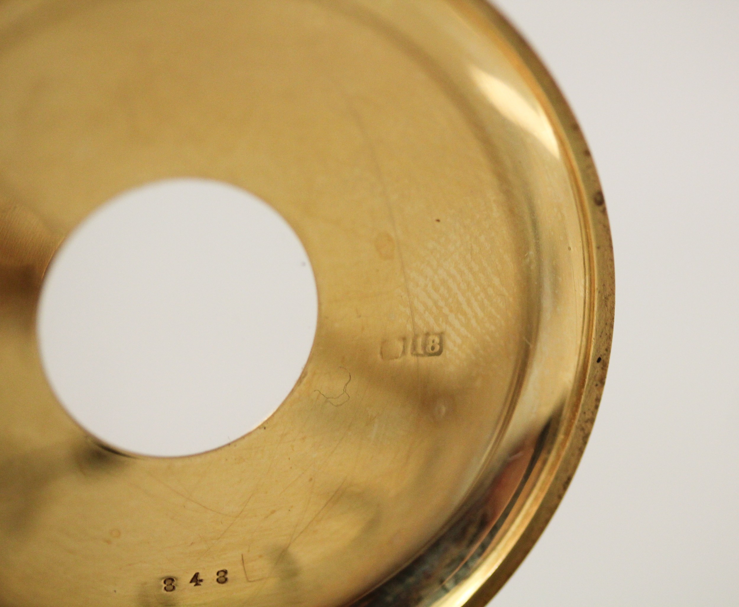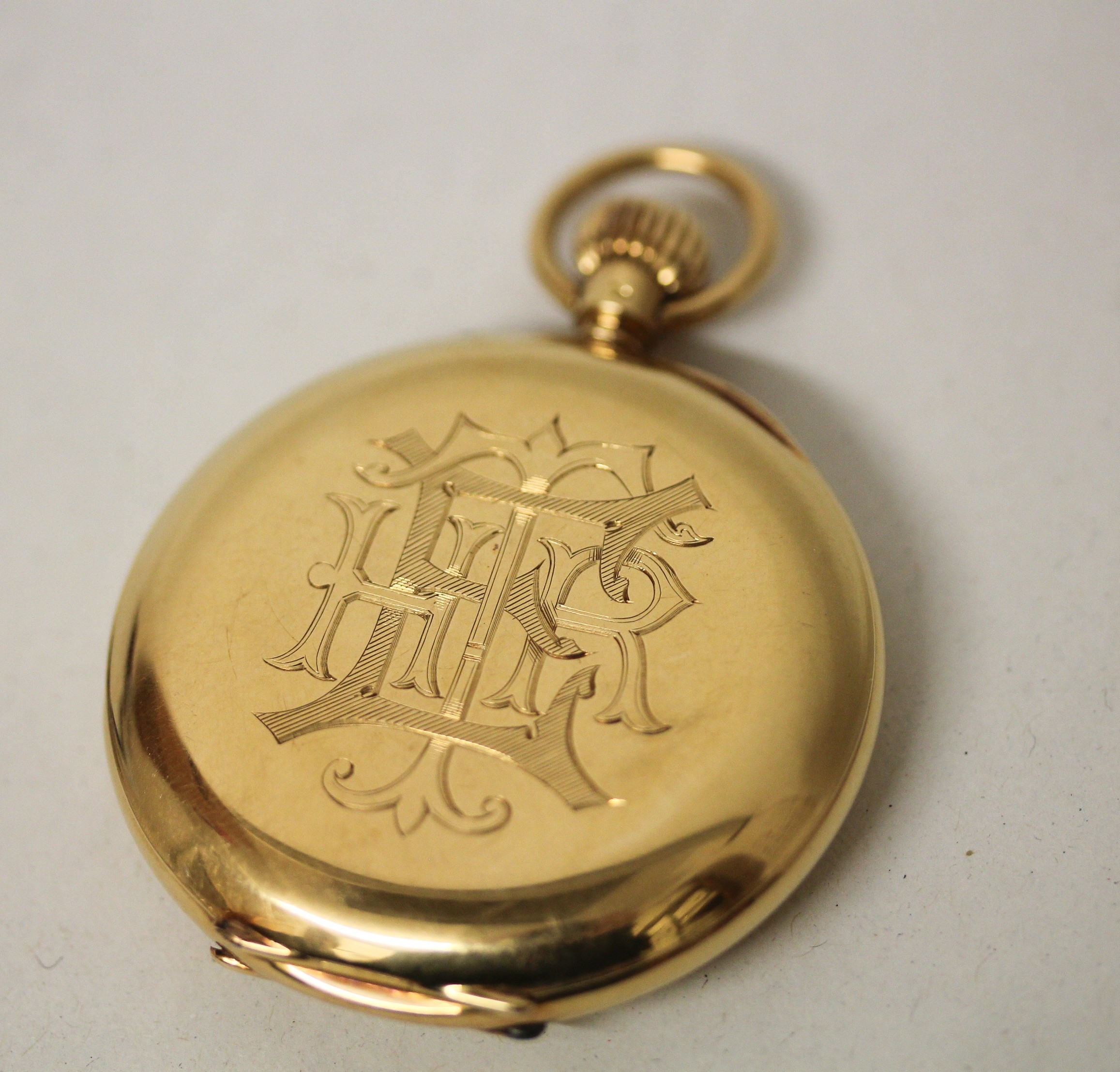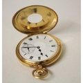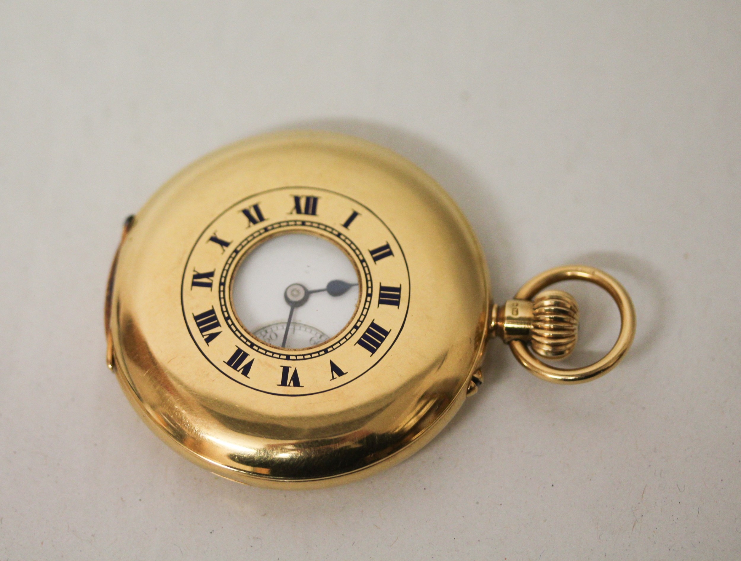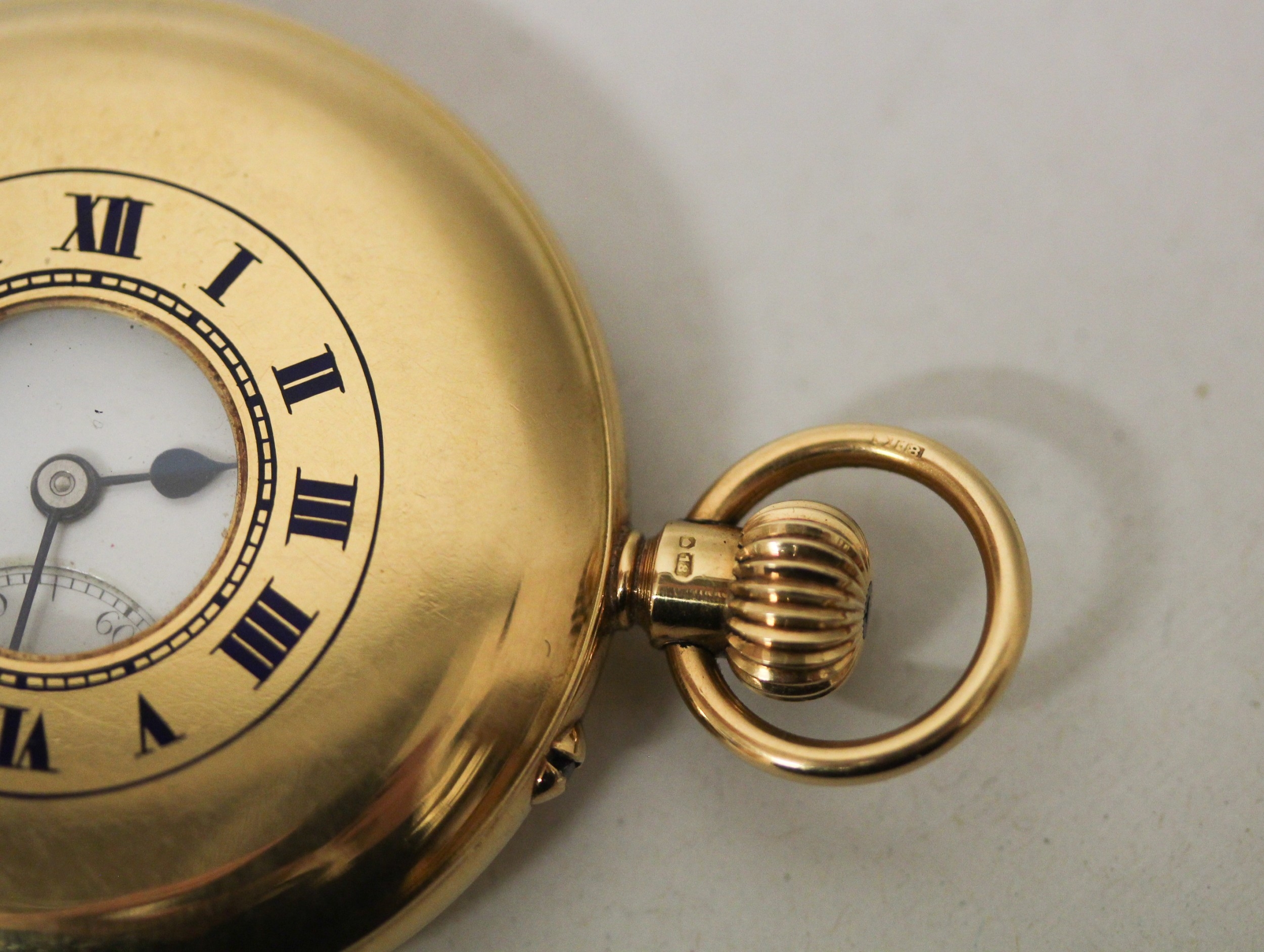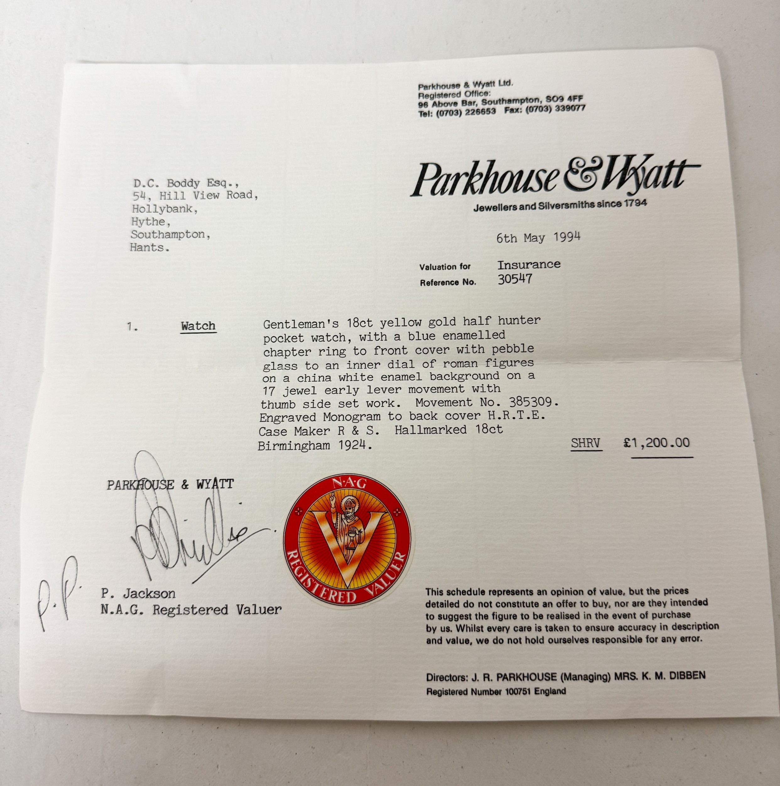 An 18ct yellow gold half hunter pocket watch with a blue enamel chapter ring to the front cover, Movement number 385309, Engraved monogram to back cover H.R.T.E. Case maker R& S, hallmarked, Birmingham 1924, gross weight 91 grams