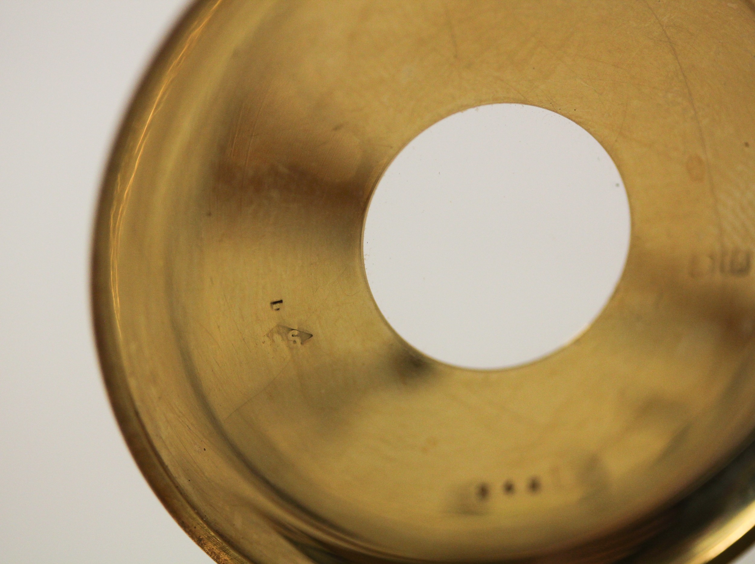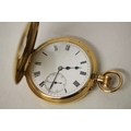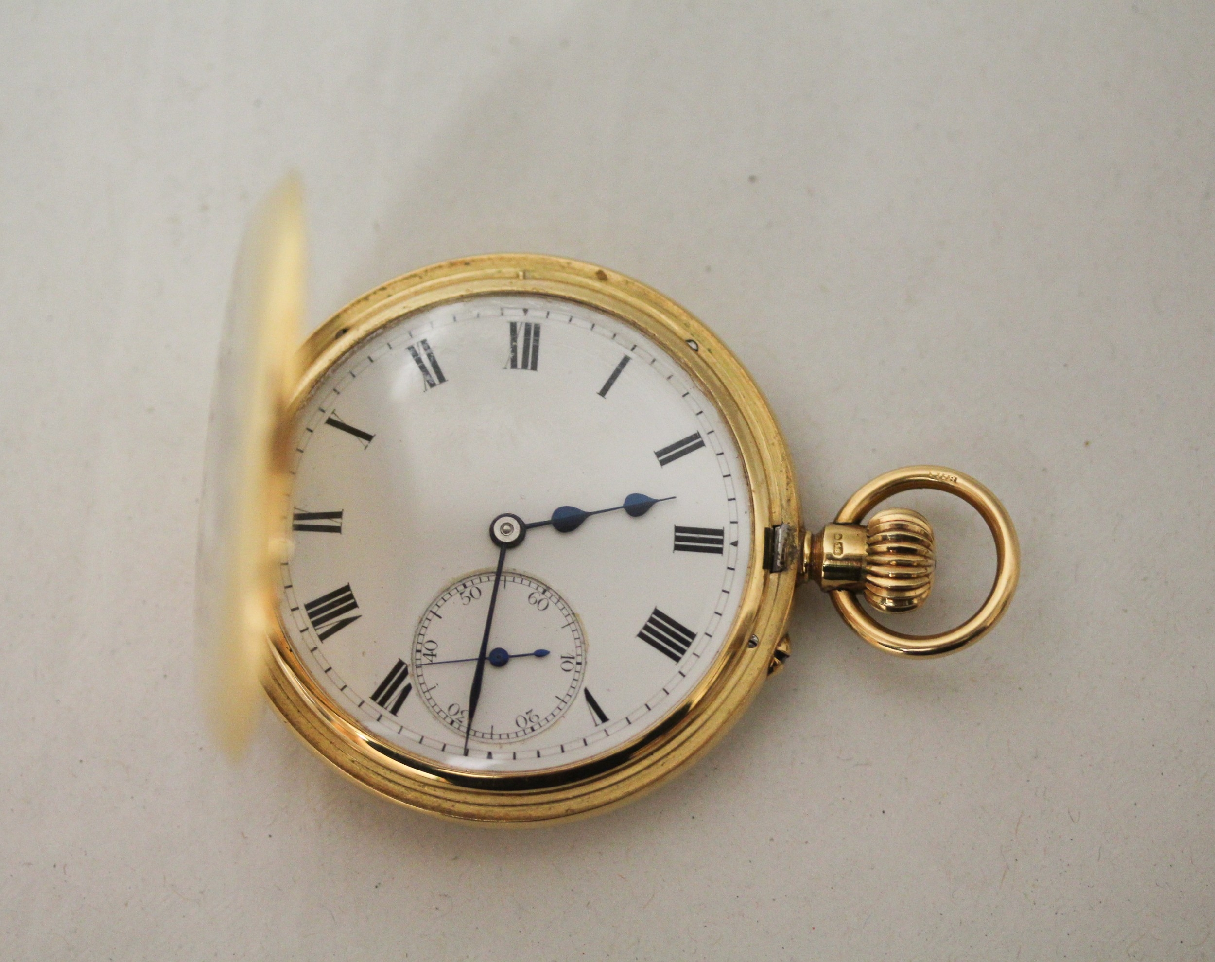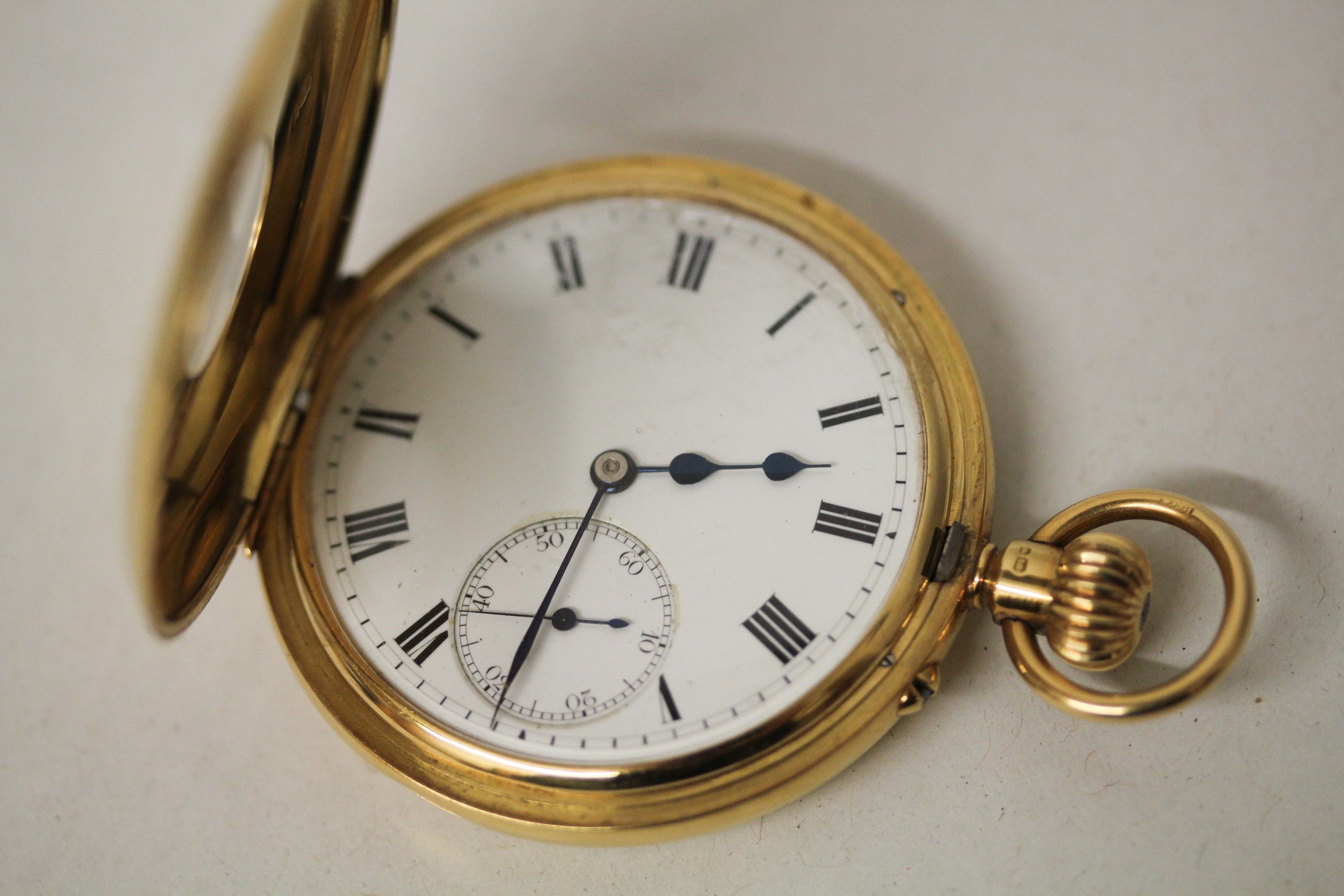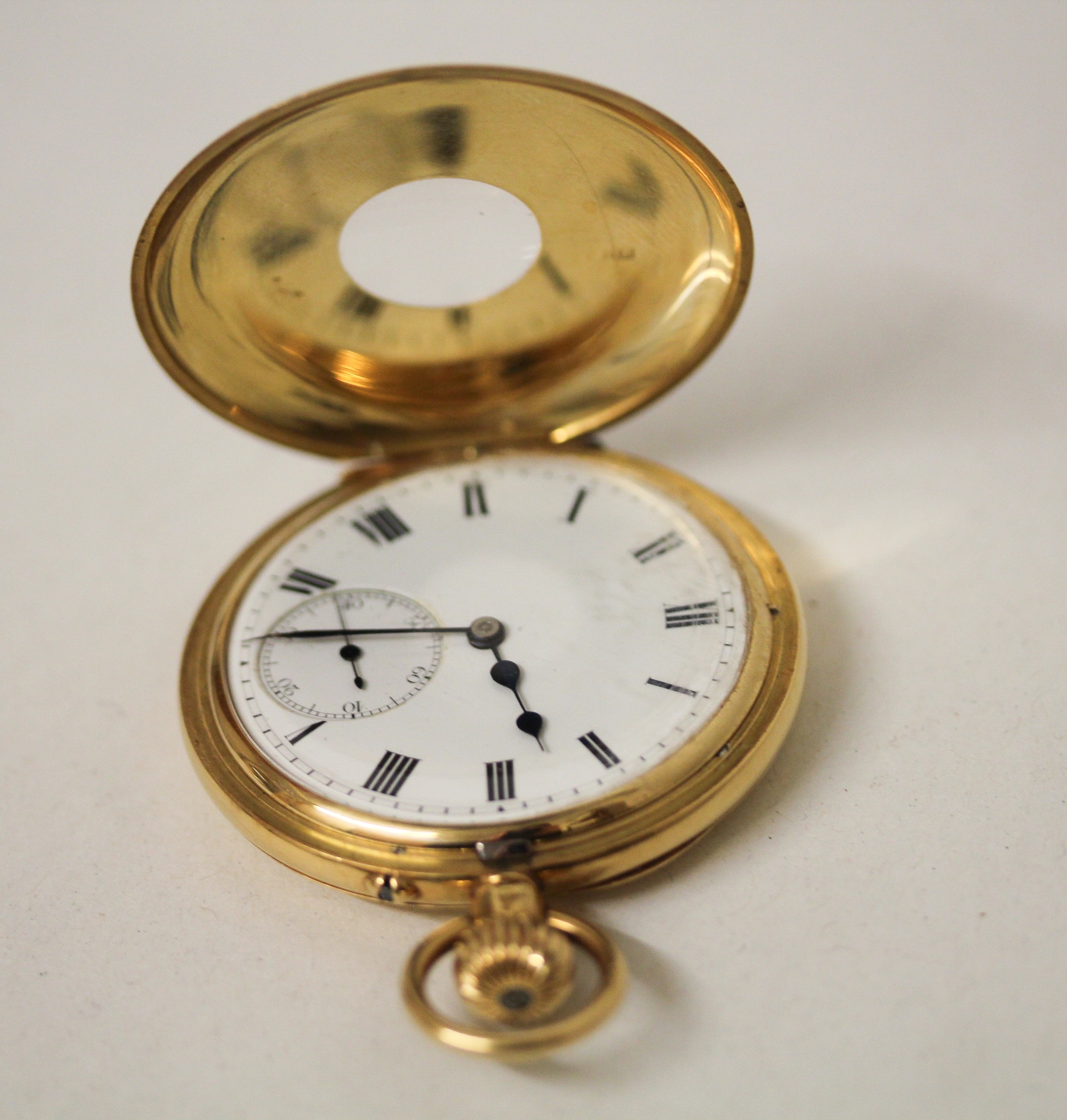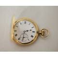 An 18ct yellow gold half hunter pocket watch with a blue enamel chapter ring to the front cover, Movement number 385309, Engraved monogram to back cover H.R.T.E. Case maker R& S, hallmarked, Birmingham 1924, gross weight 91 grams