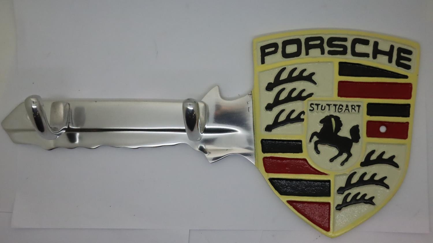 Cast iron Porsche key wall coat hanger, L: 30 cm. P&P Group 2 (£18+VAT for the first lot and £3+VAT for subsequent lots)