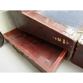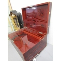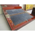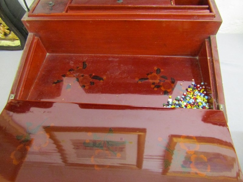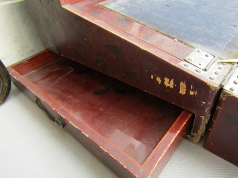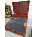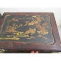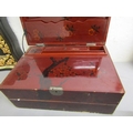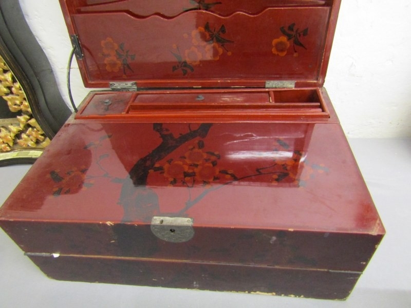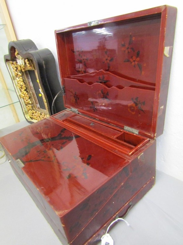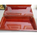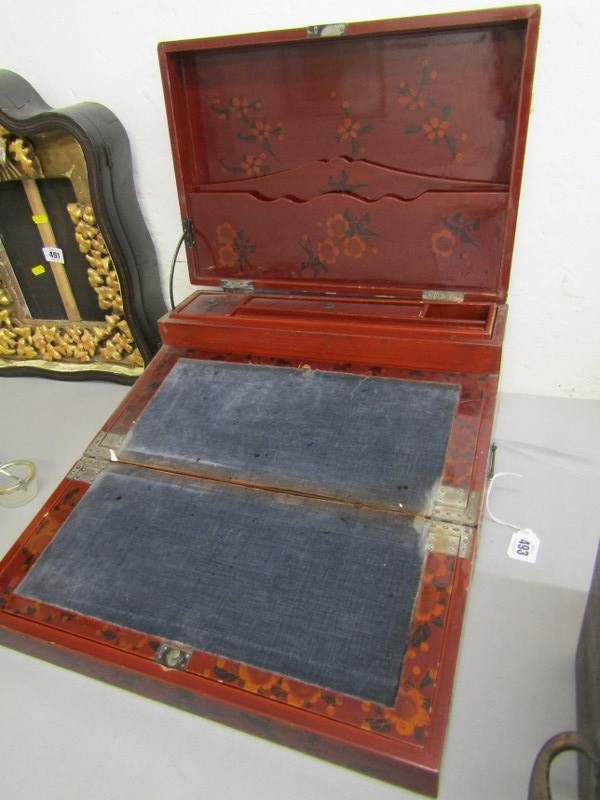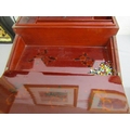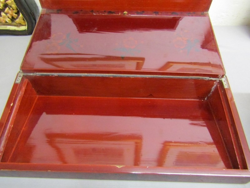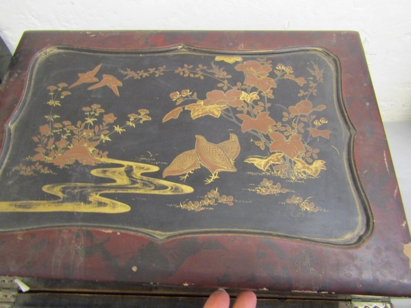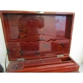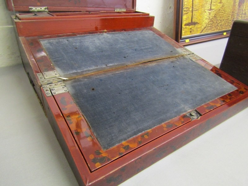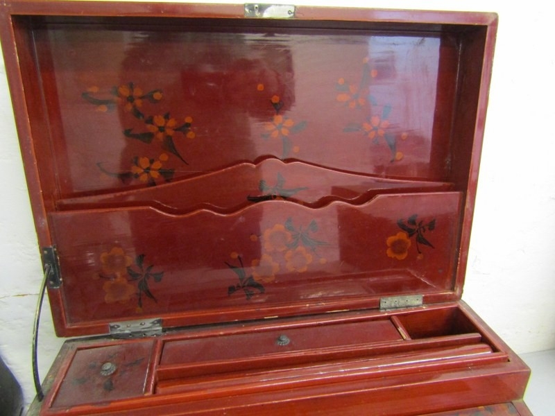 JAPANESE WRITING BOX, a vintage Japanese red lacquer writing box/slope, with hand painted floral motifs, lid with inset panel beautifully decorated with birds in floral and river landscape (hinge needs attention) 39.5cm width 19cm height