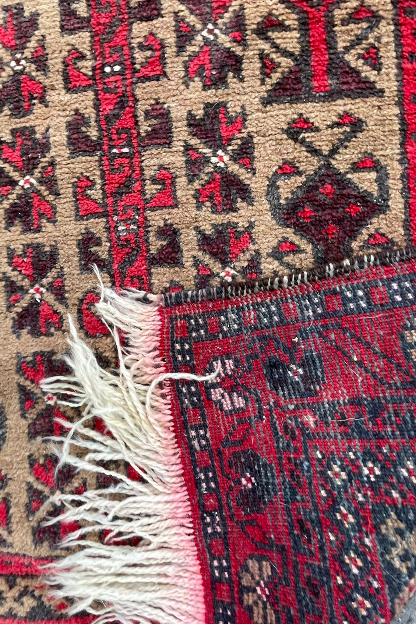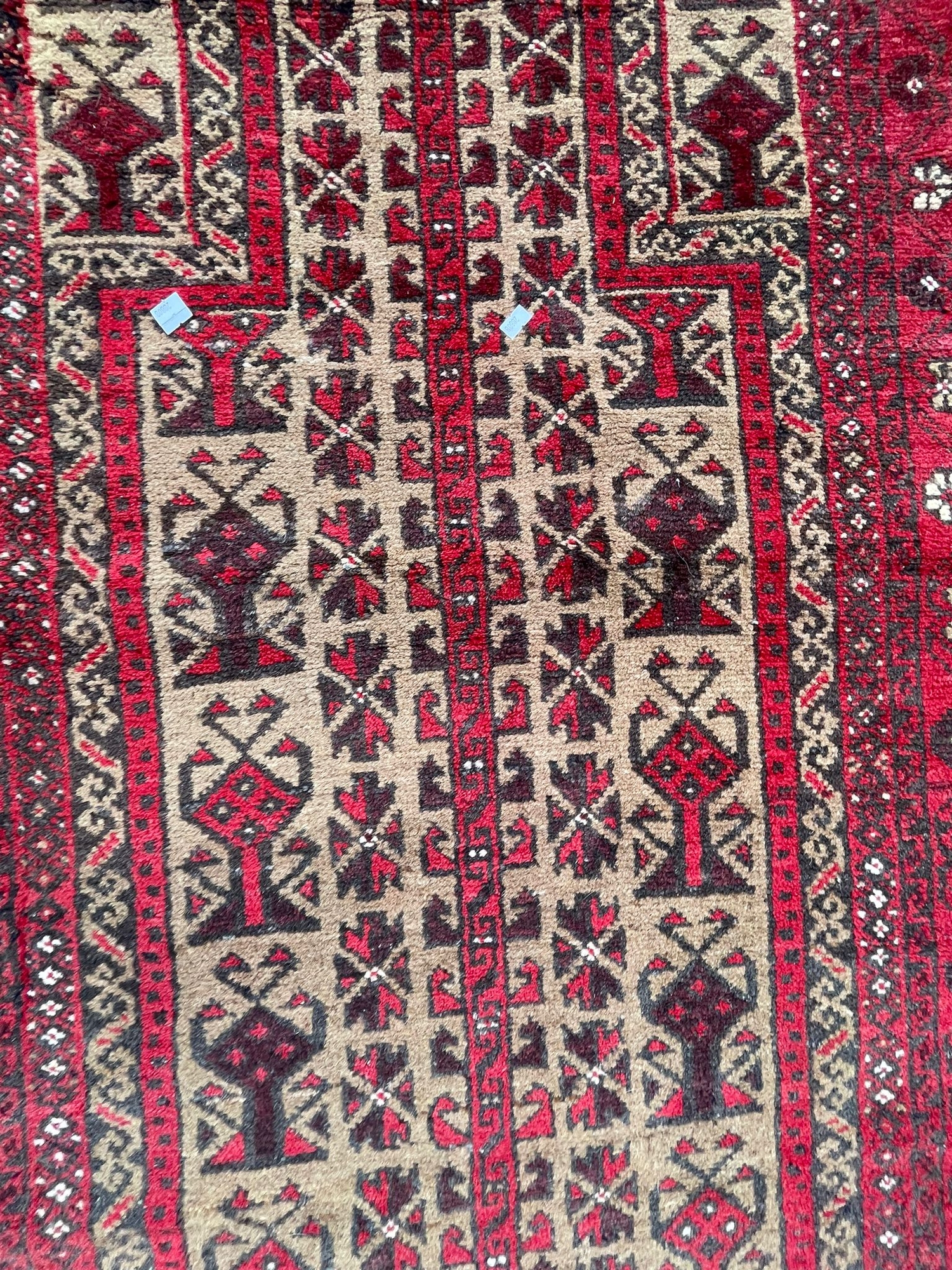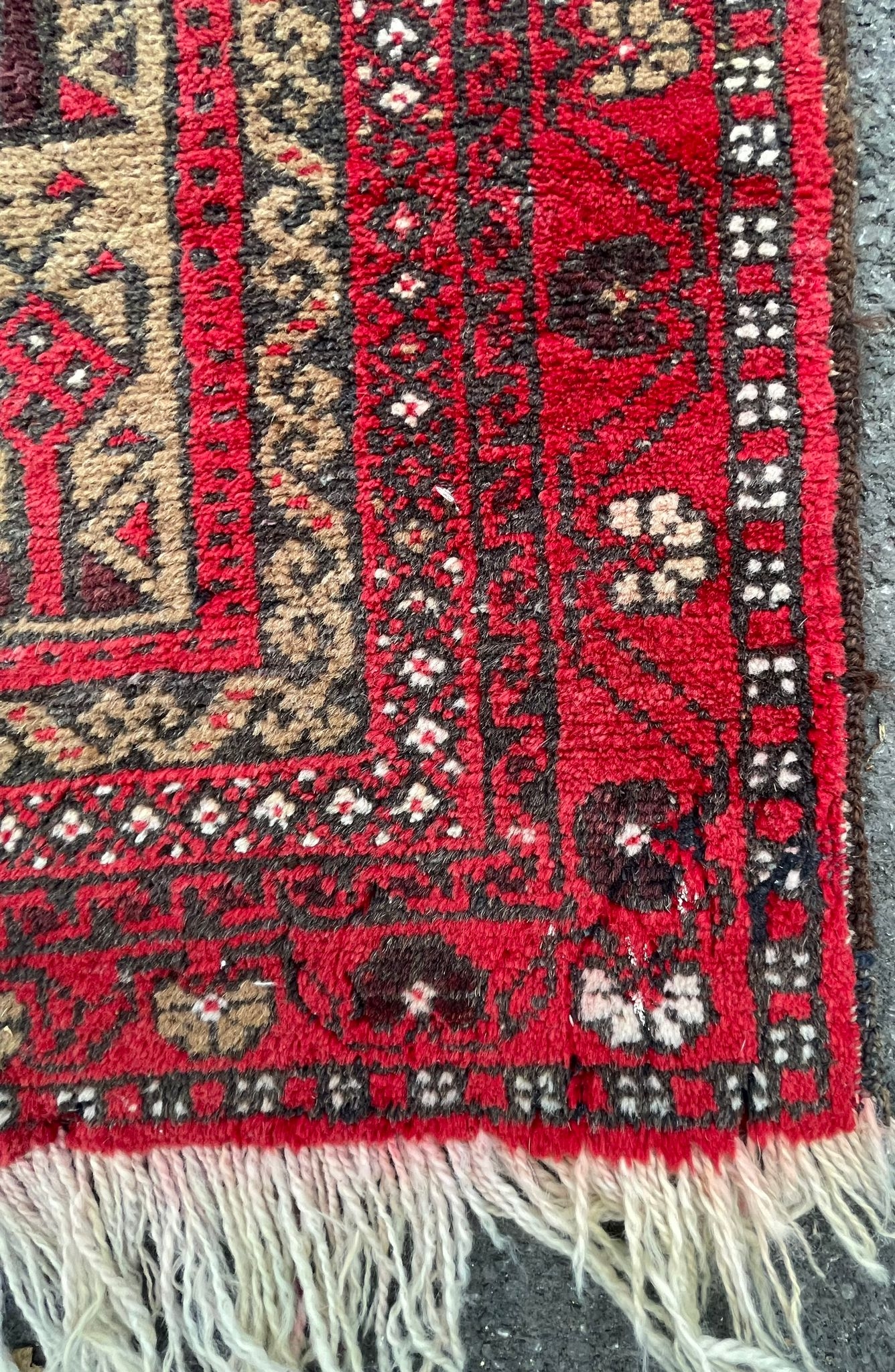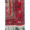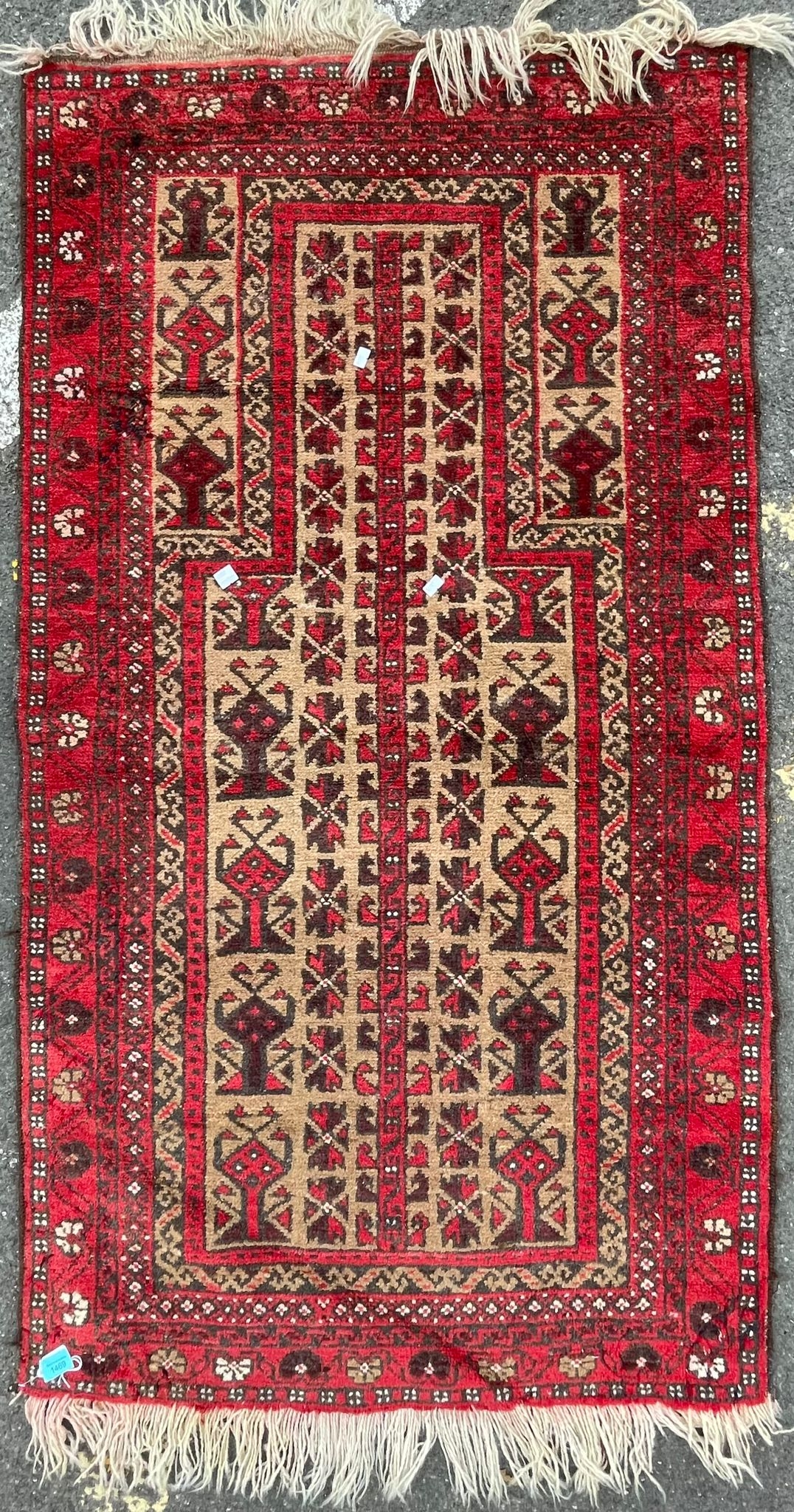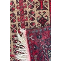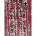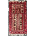 A vintage 20th Century Persian Islamic Baluch prayer floor carpet rug. Having central geometric panel with a series of repeating patterns enclosed within graduating out borders with tassels to ends. Measures approx. 160cm x 83cm
