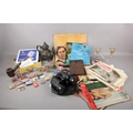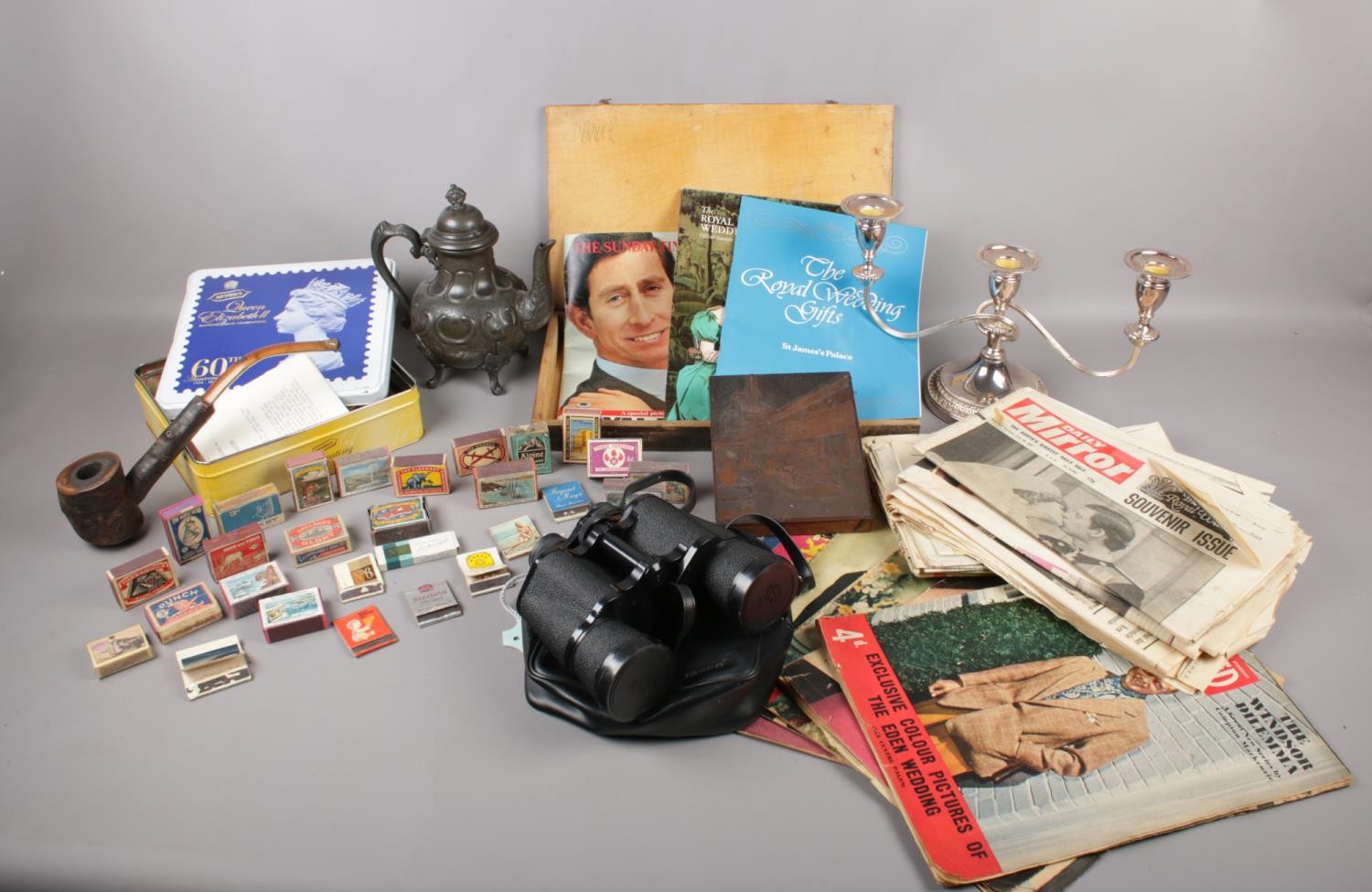 A box of collectables comprising of, a selection of empty matchboxes with scenes from Cornwall as examples, a selection of magazines and newspapers from the wedding of Prince Charles and Lady Diana, and a pair of Tasco binoculars etc.