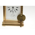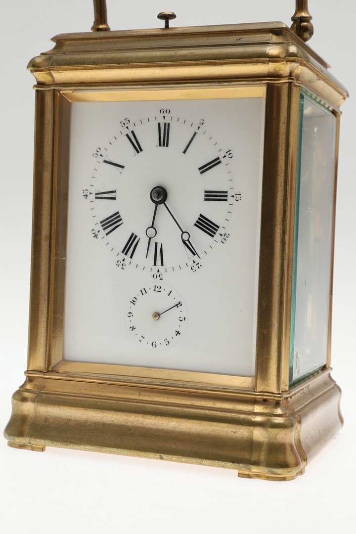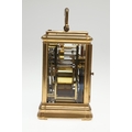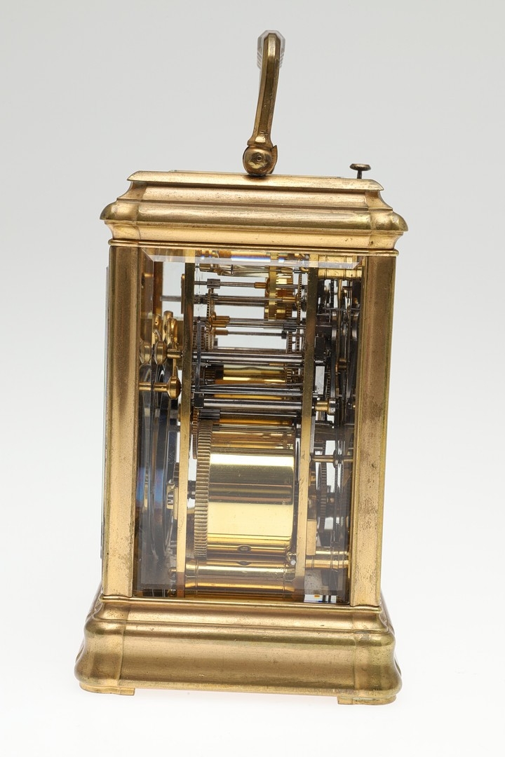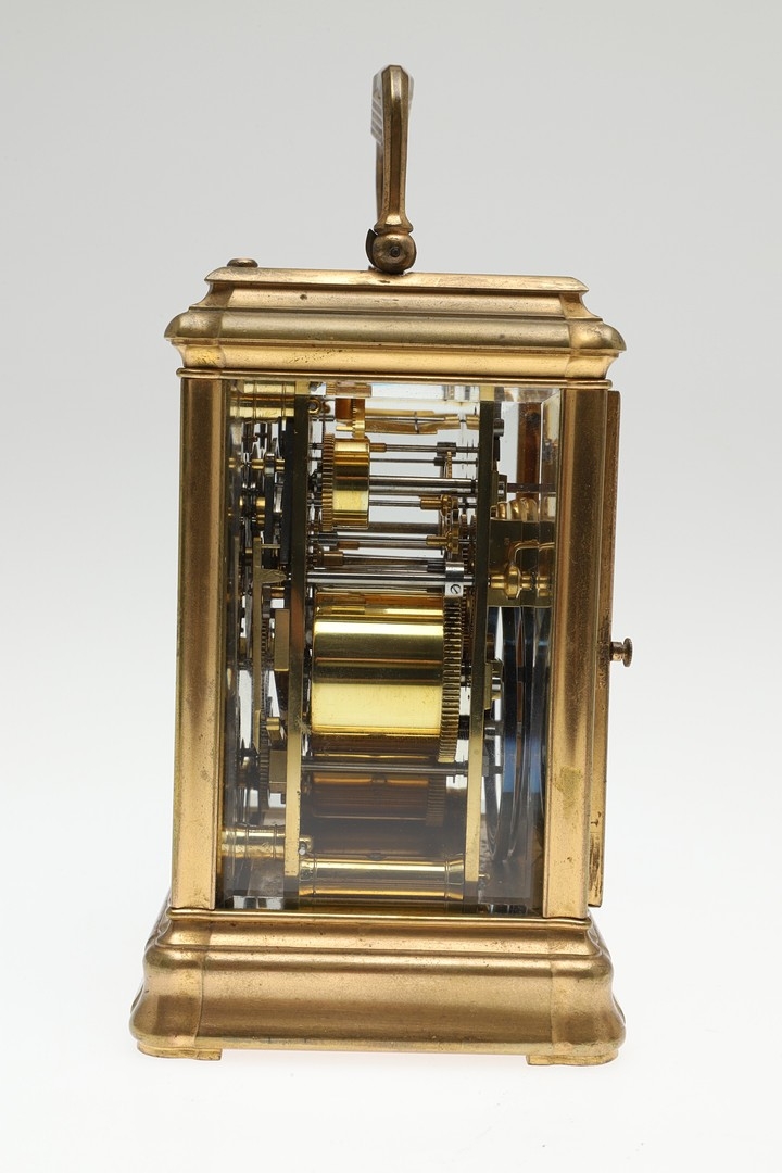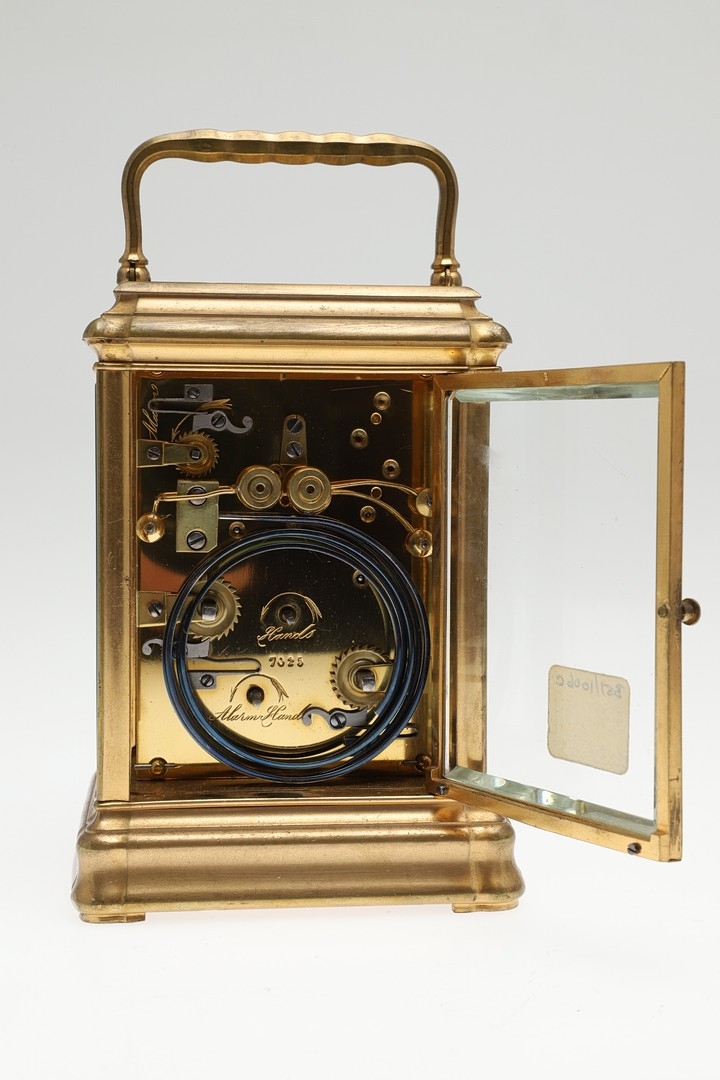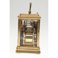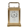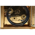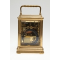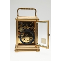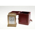 A LATE 19TH CENTURY FRENCH PETITE SONNERIE CARRIAGE CLOCK. the gorge case with repeater button and bevelled glass panels, blued steel hands and alarm subsidiary, platform lever escapement to an eight day movement, striking the hours and quarters to a twin gong, backplate stamped no. 7025, the base with strike selector lever - hours & quarters/ quarters only/ silent, 18cm high inc handle, 10cm wide, with winder and original Moroco leather carry case, 16cm high.