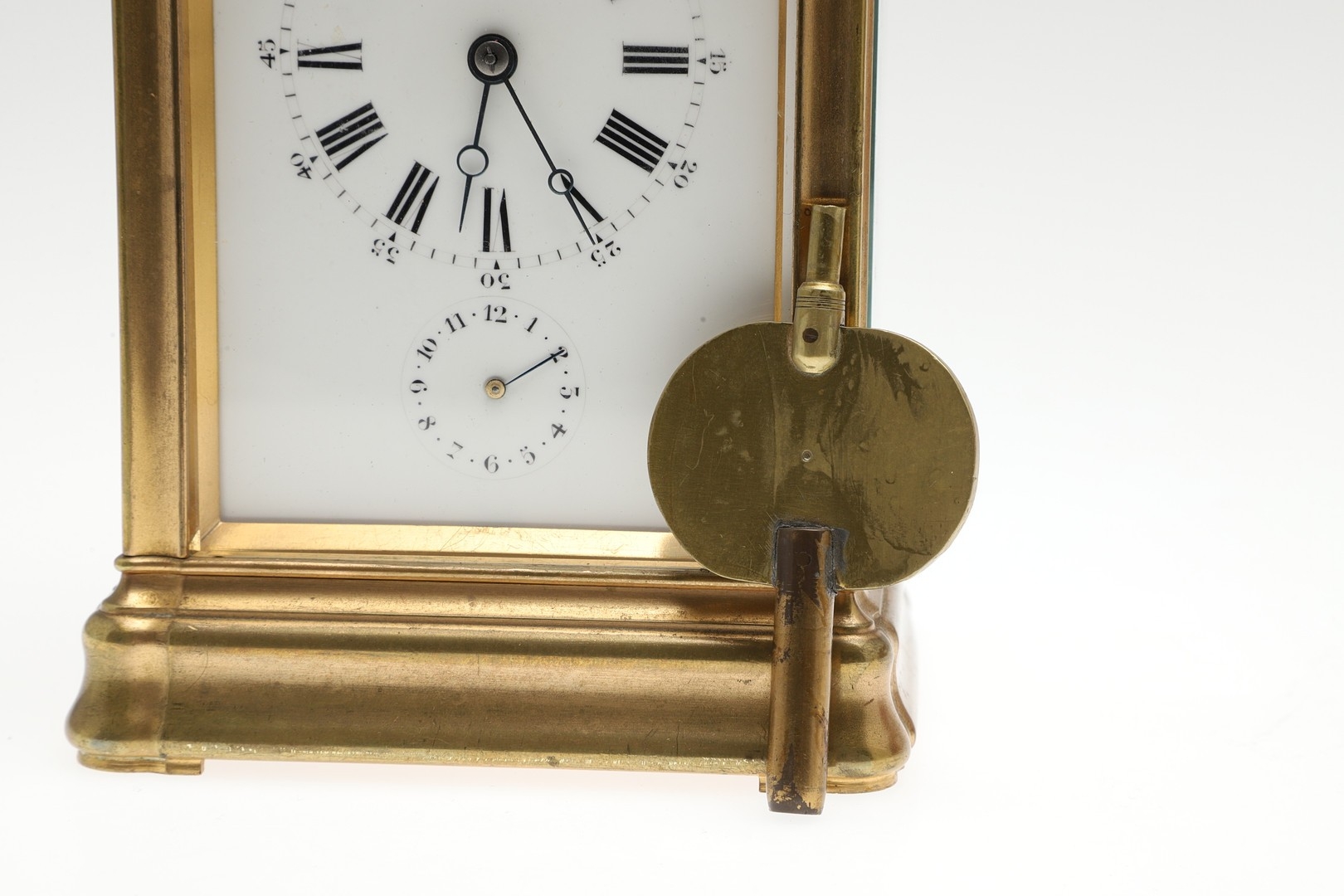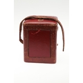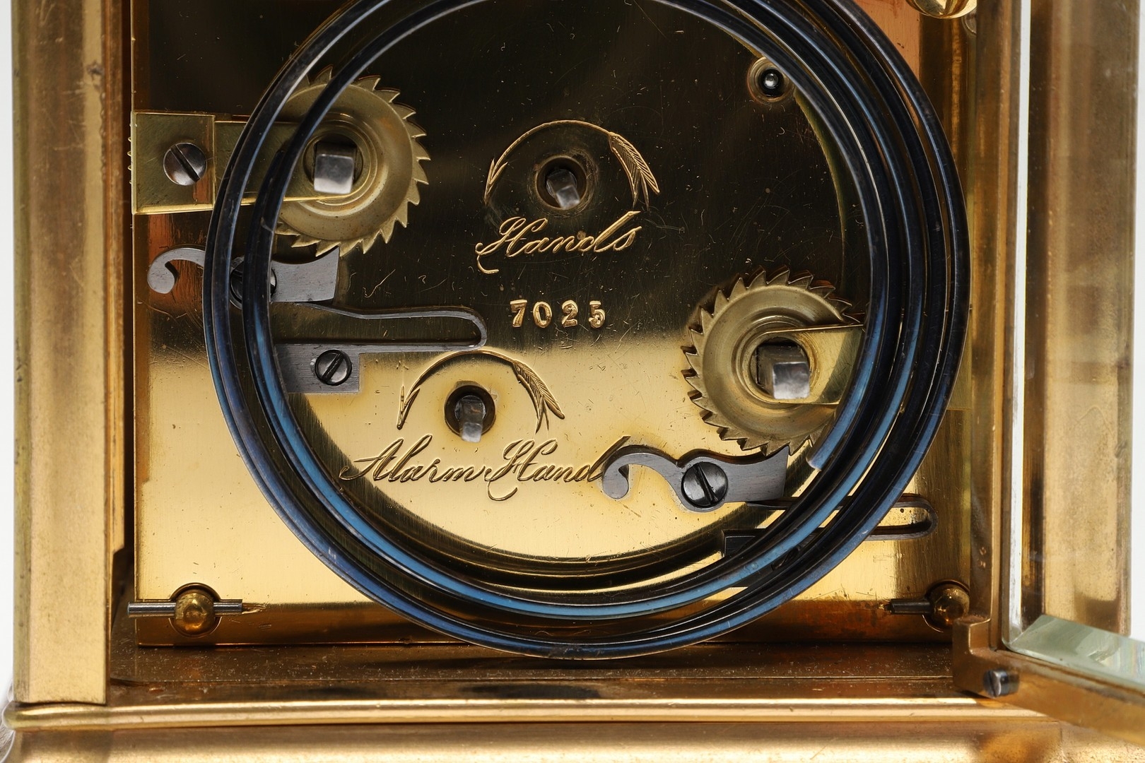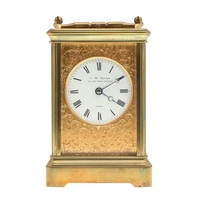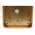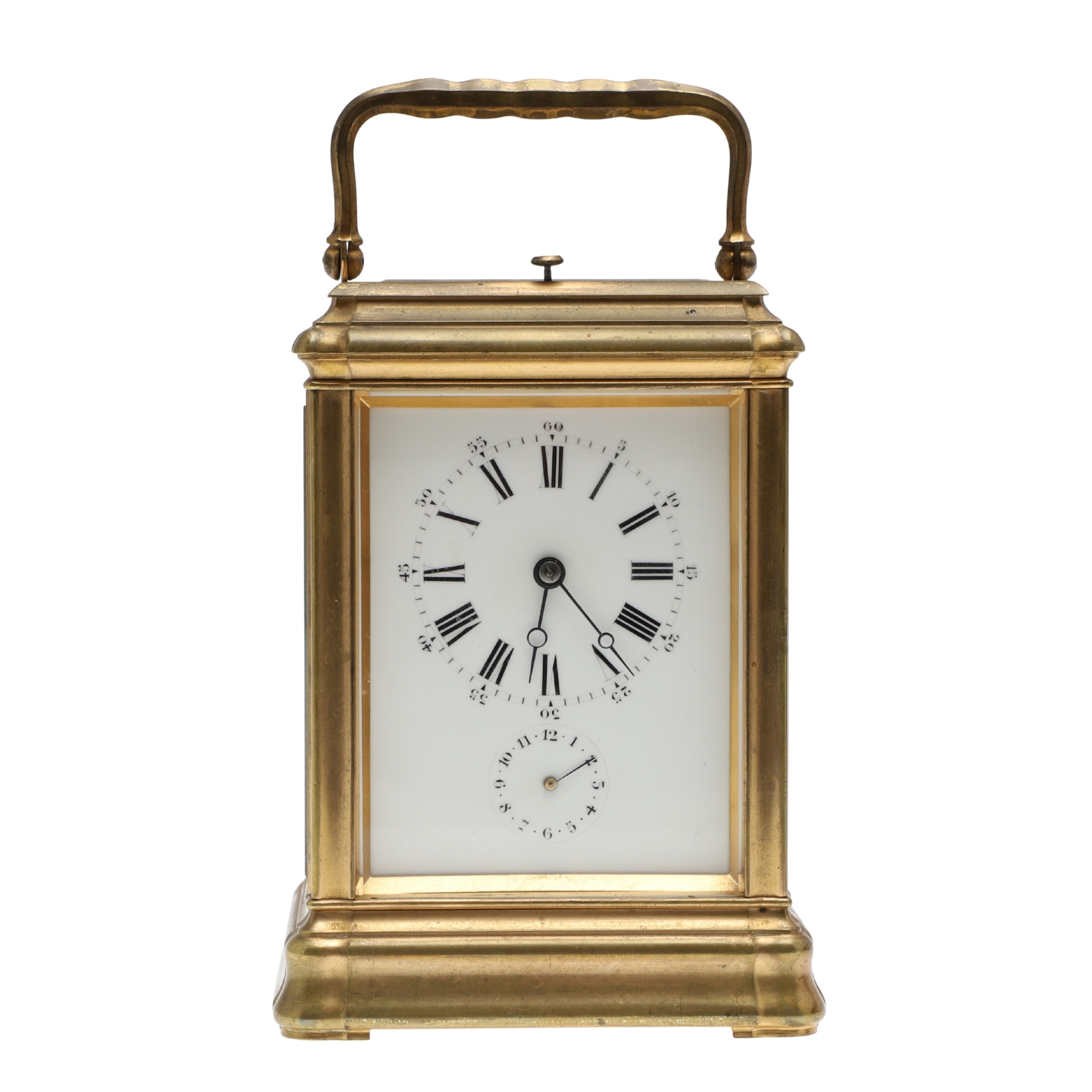 A LATE 19TH CENTURY FRENCH PETITE SONNERIE CARRIAGE CLOCK. the gorge case with repeater button and bevelled glass panels, blued steel hands and alarm subsidiary, platform lever escapement to an eight day movement, striking the hours and quarters to a twin gong, backplate stamped no. 7025, the base with strike selector lever - hours & quarters/ quarters only/ silent, 18cm high inc handle, 10cm wide, with winder and original Moroco leather carry case, 16cm high.