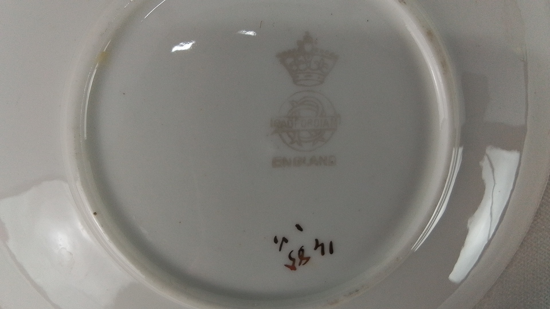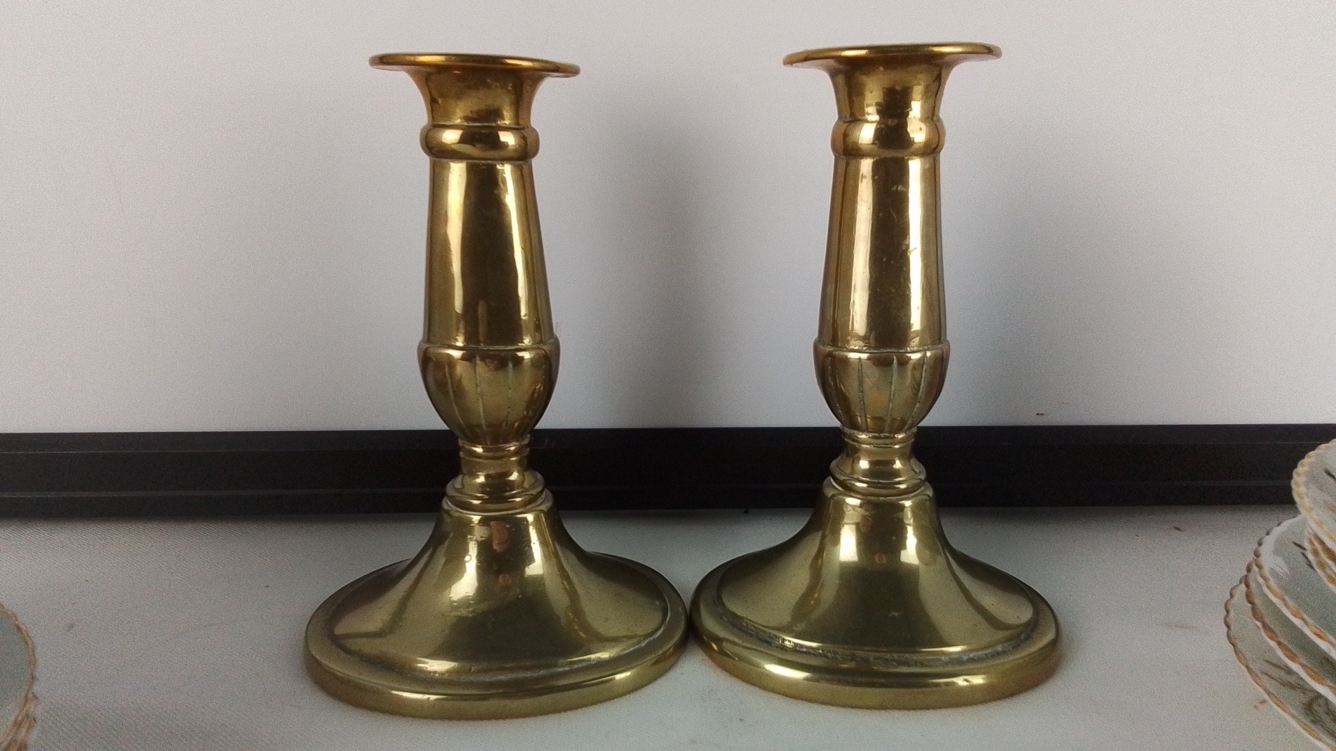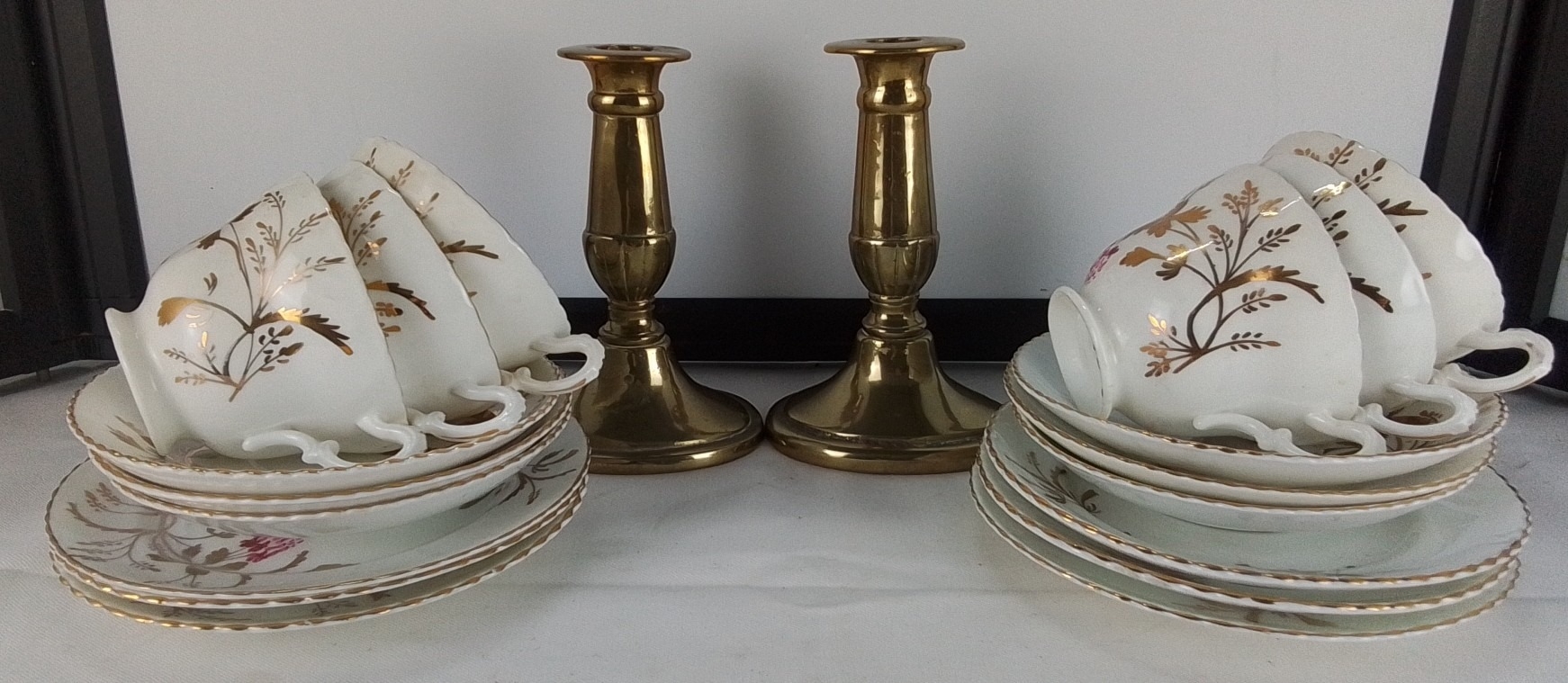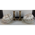 An early Crown Victoria bone china tea set, gilt floral decoration, together with a pair of brass candlesticks.