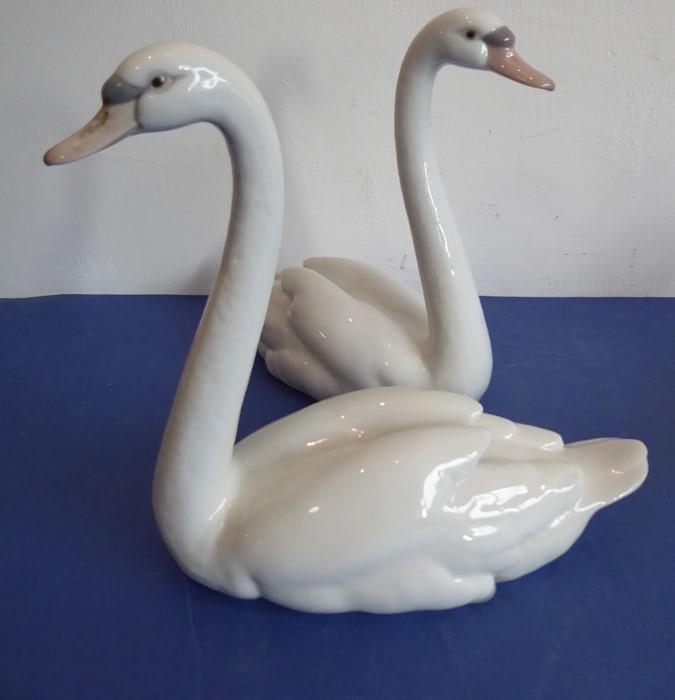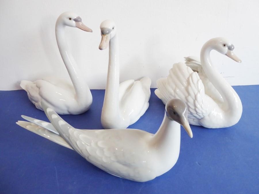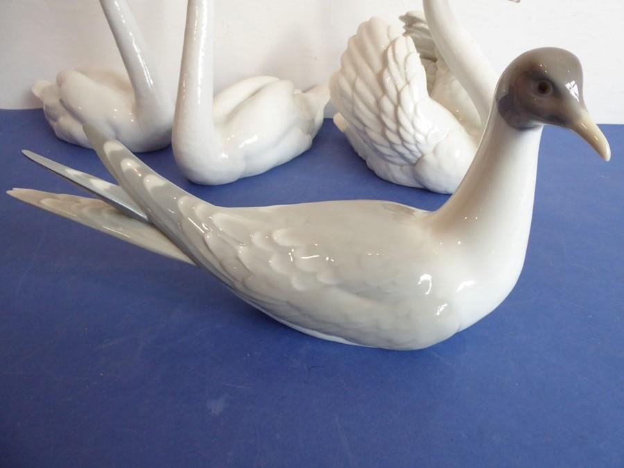 Four pieces of Lladro porcelain; a matched pair of swans (approx. 22cm high), another swan furling its wings and a seagull (27cm long) (slight chip to tail feather of the seagull) (4)