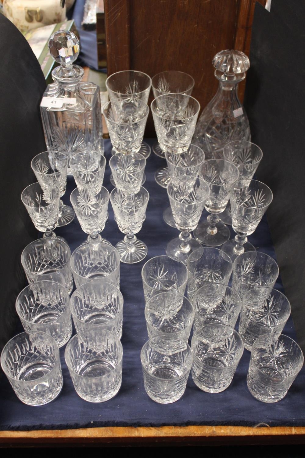 Glassware to include a set of six Edinburgh Crystal whisky tumblers, two decanters, wine glasses etc.