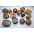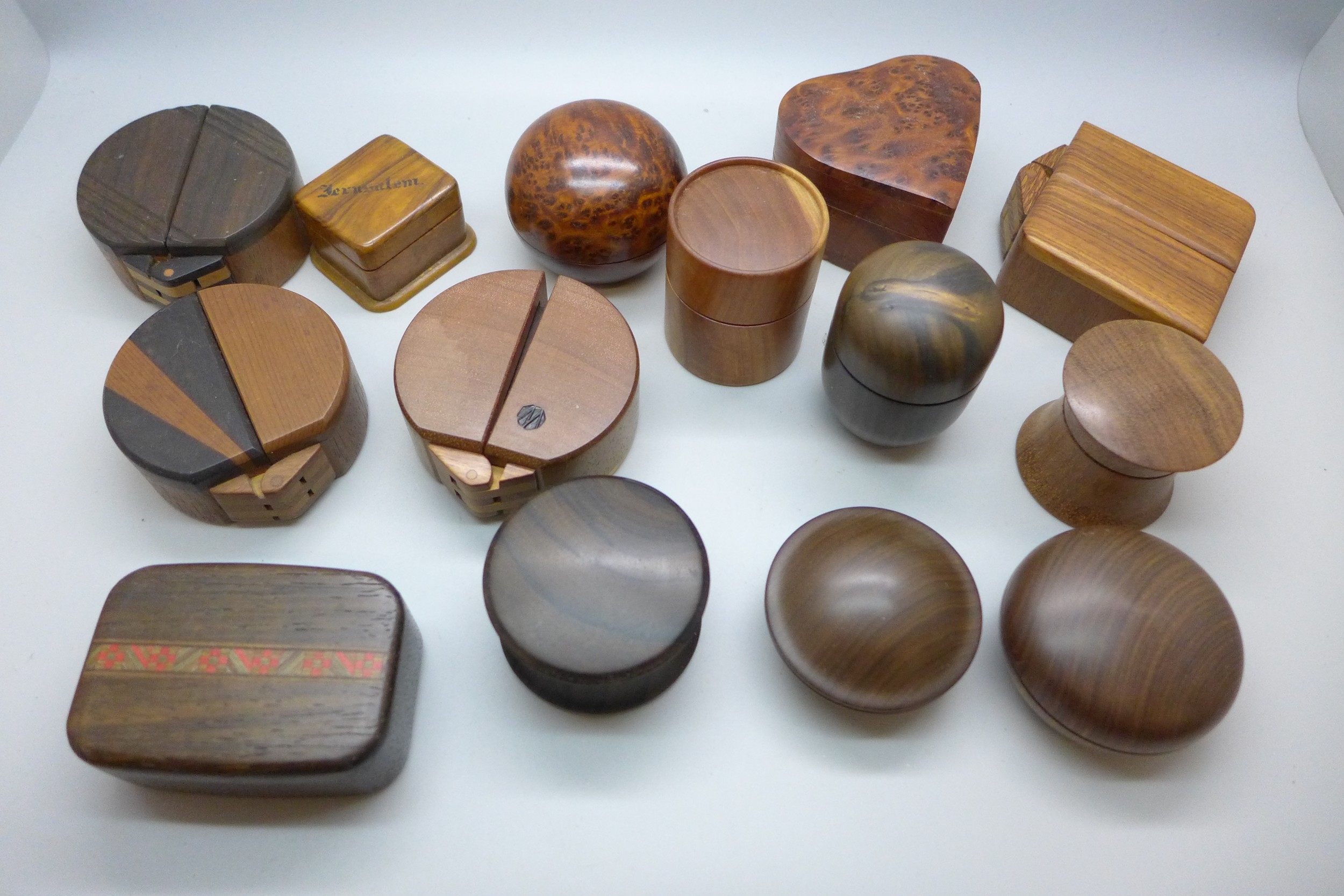 A collection of wooden boxes, various woods, shapes, four hinged, fourteen in total