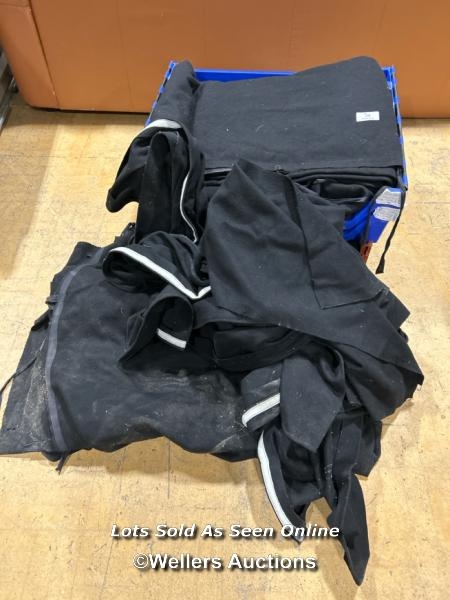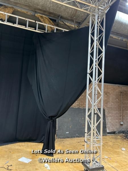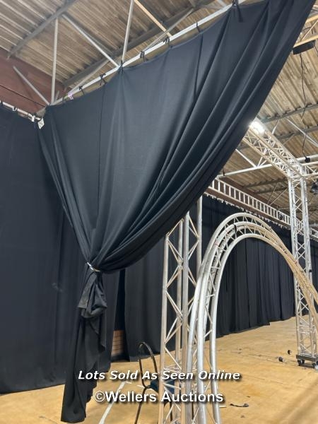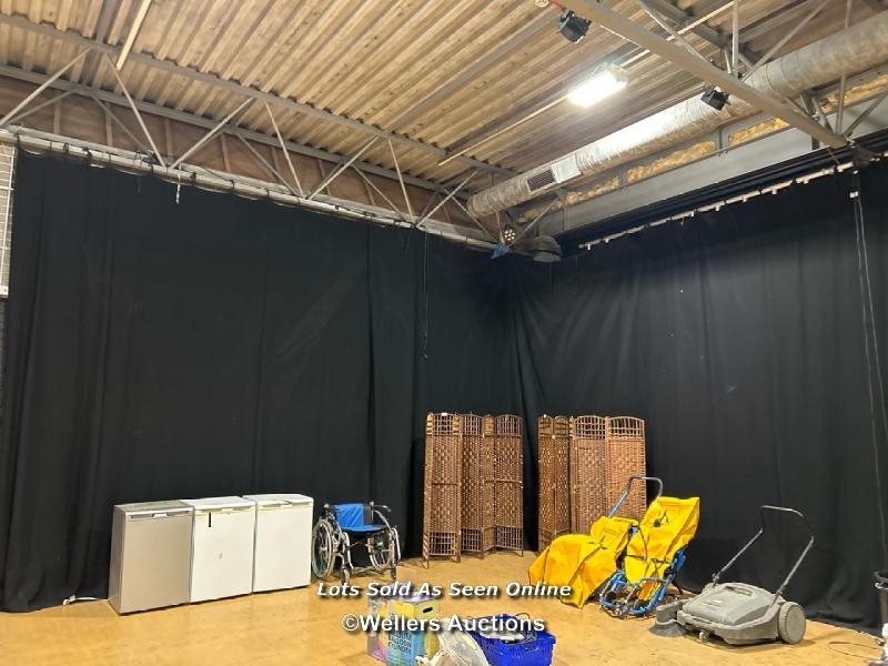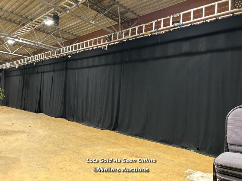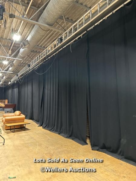 Twenty-two hung black stage curtains and a quantity of extra stage curtains, each approx 390cm (h) x 430cm (w) / Buyer will be responsible for removing, the 24 hung curtains will need removing from rigging, located in the large hall / Lot Location: The Tropicana, Marine Parade, Weston-Super-Mare, North Somerset, BS23 1BE