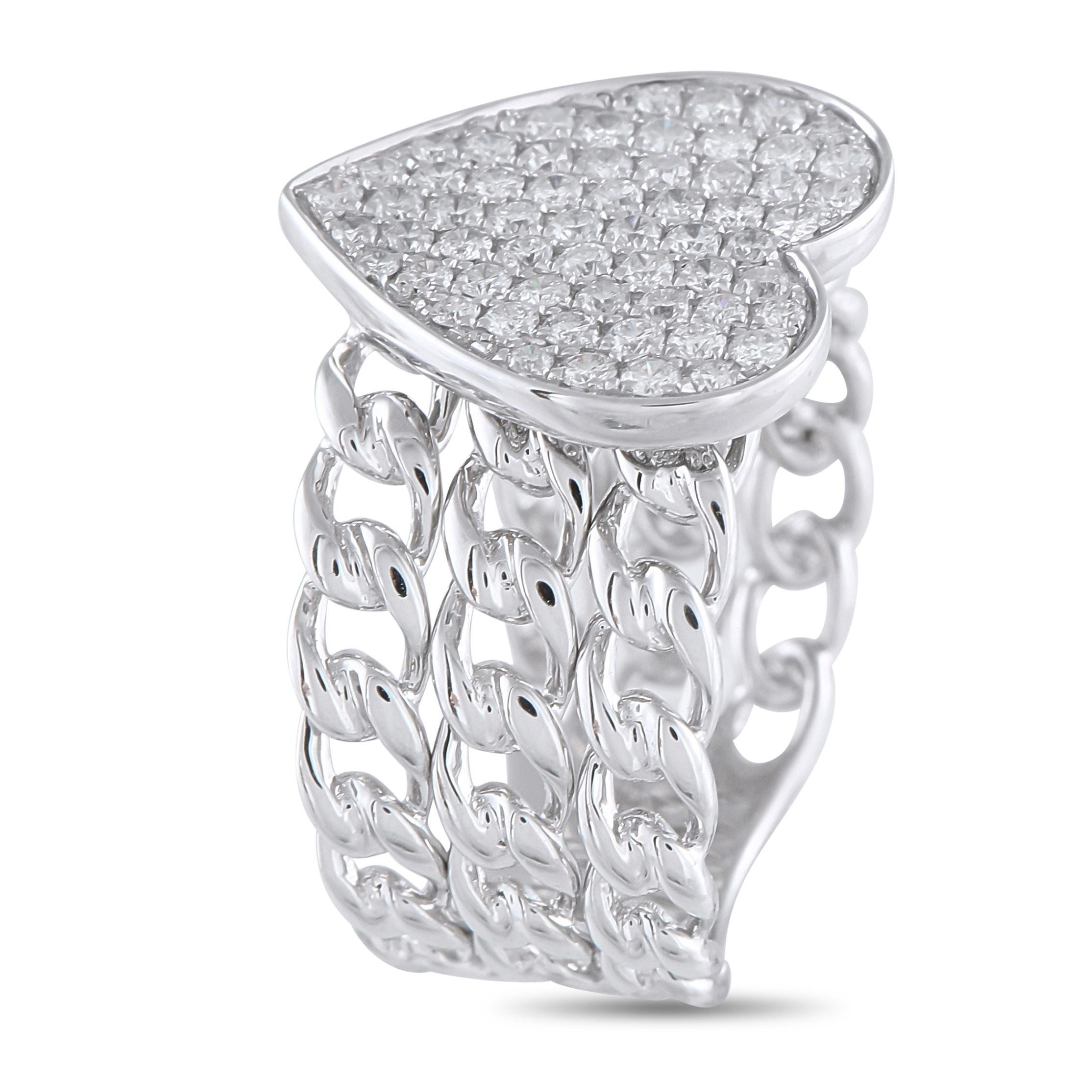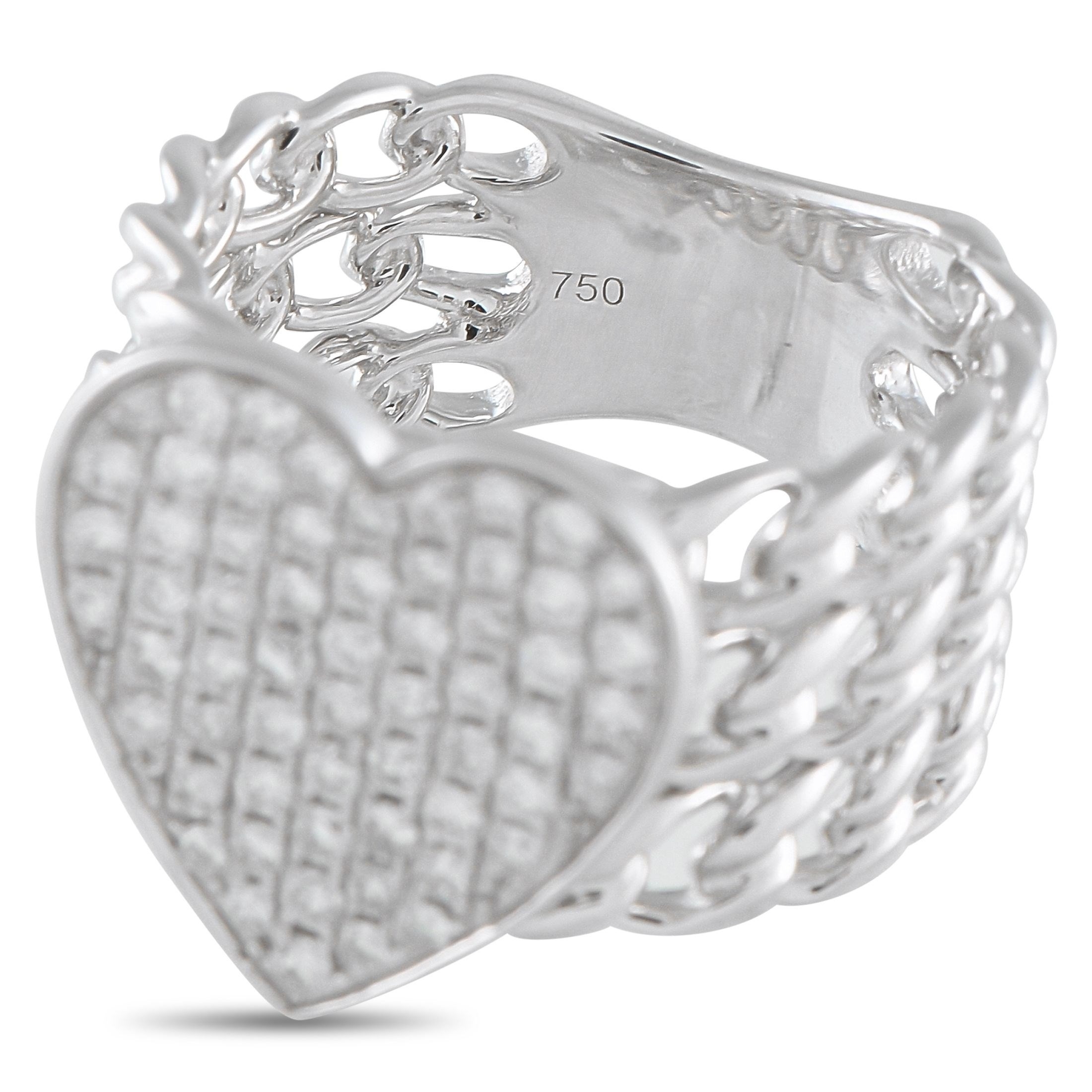 An 18K White Gold 0.68ct Diamond Ring. A heart-shaped motif center with 0.68 carats diamonds. Designed with chain details on the band, 8mm wide band and a 4mm top height. In brand new condition and includes a gift box. Ring size: 6 (UK size L). Total weight: 8.6 grams. *This item is held at Cadmore USA Office in Pennsylvania, USA and will be shipped from there. Buyers will be responsible for direct shipping payments.*