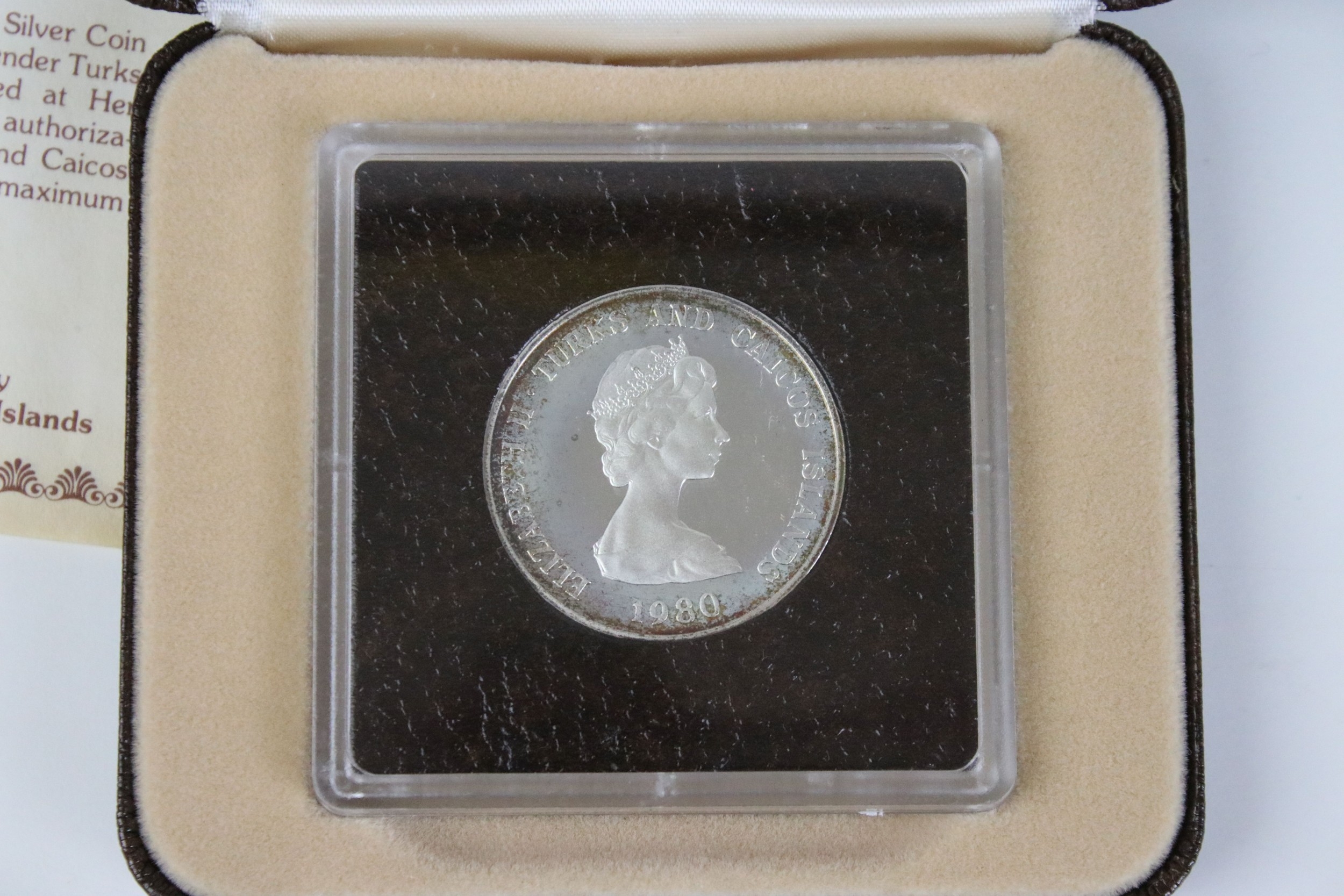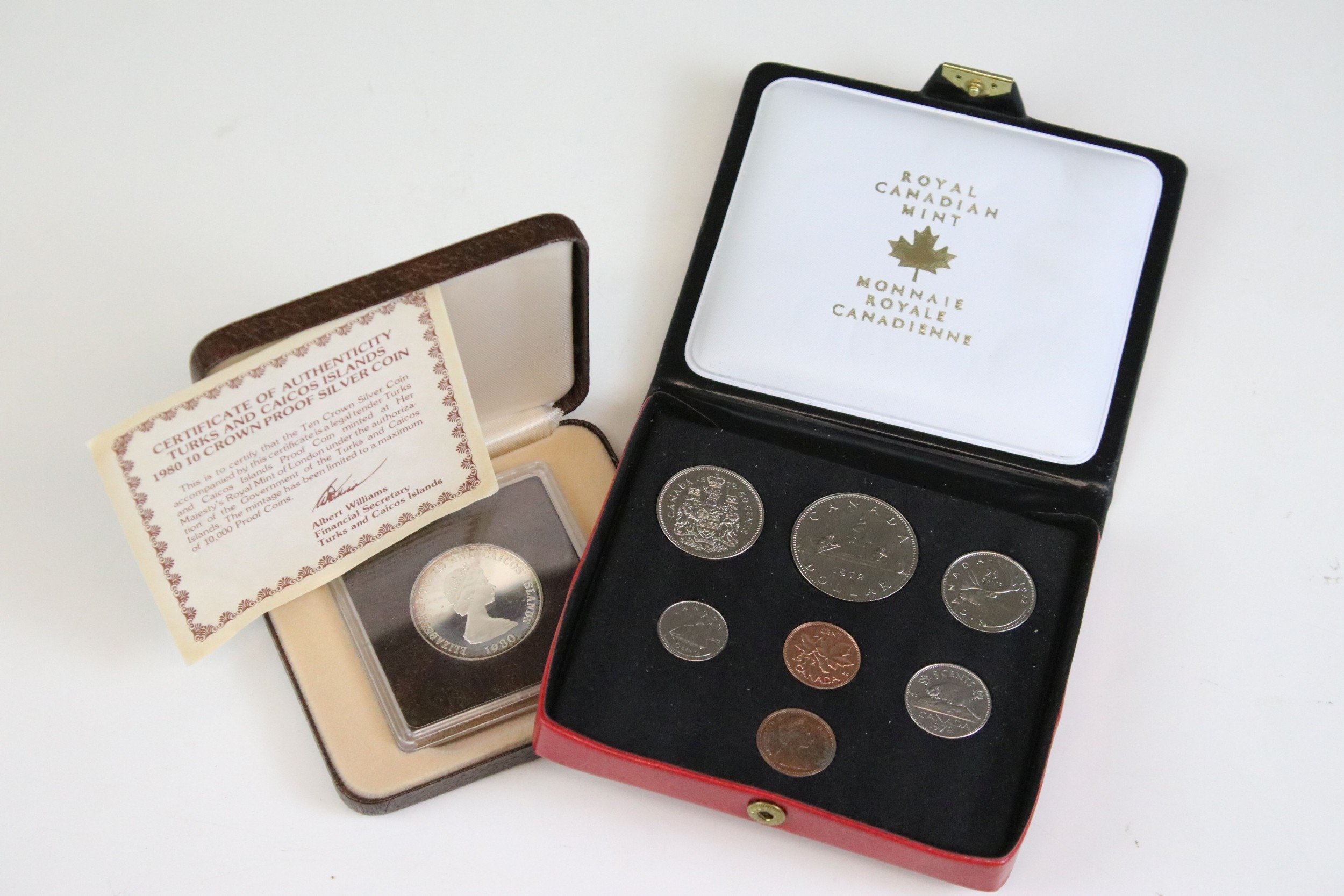 A Royal Canadian Mint 1972 annual coin year set to include silver together with a Turks And Caicos Islands 1980 silver proof ten crown coin encapsulated within fitted display case.