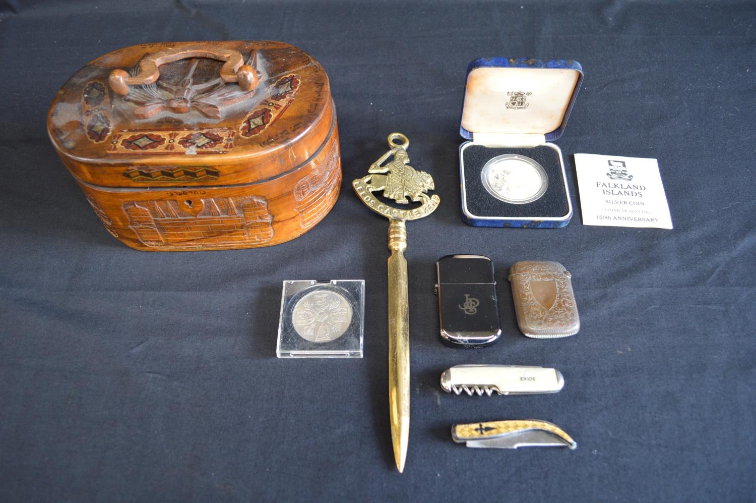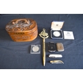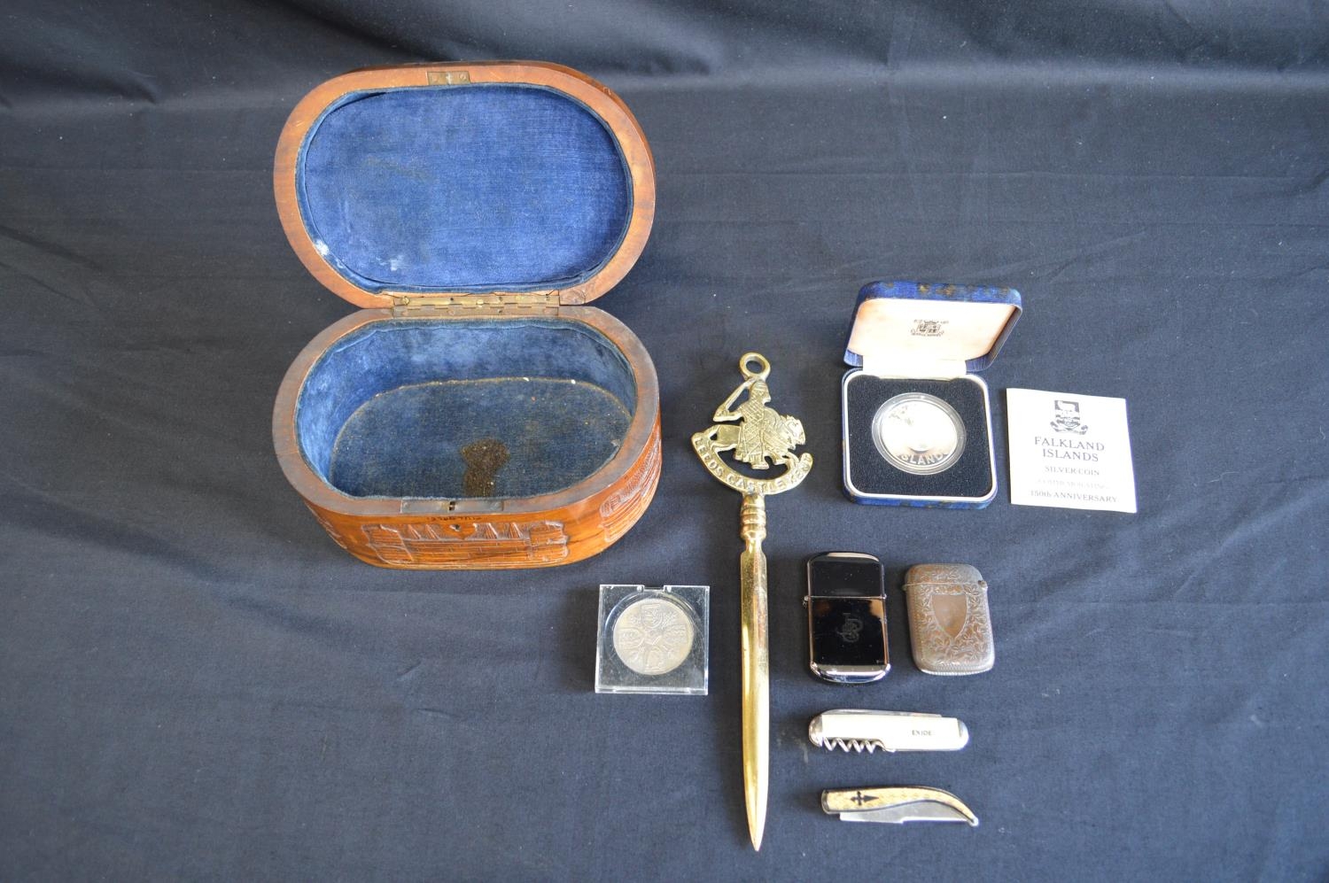 Group of sundry items to include: Royal Mint silver crown coin, brass vesta case, Hadson pocket lighter and brass letter opener etc