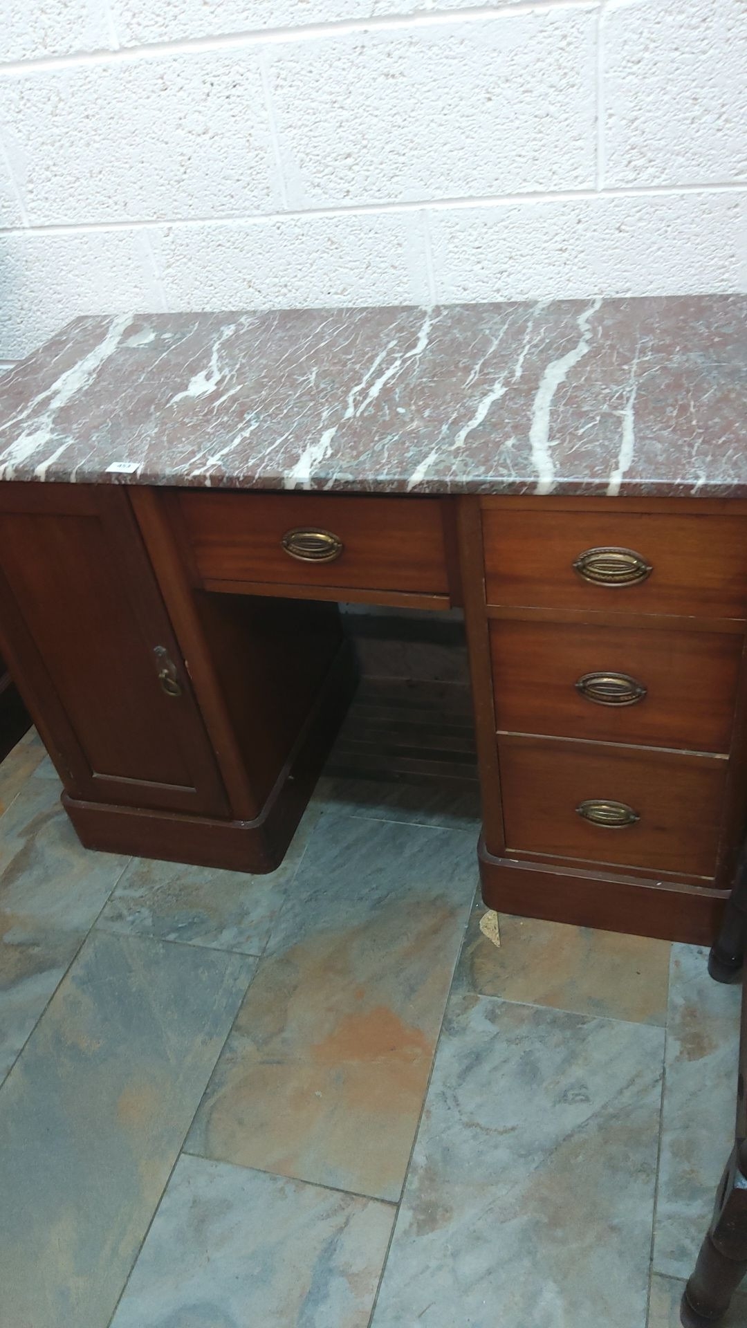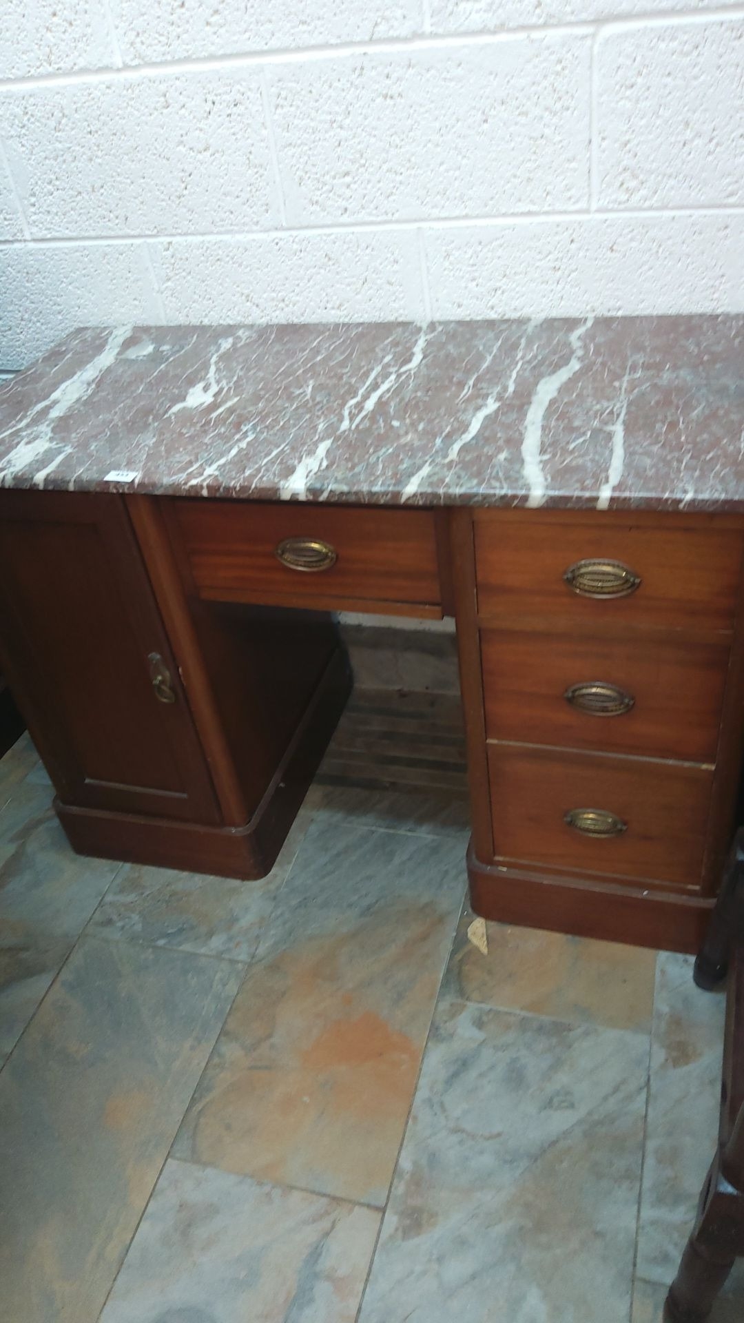 Mahogany sideboard with marble top. Features brass handles, four drawers, and a cupboard. Mid-century design.
